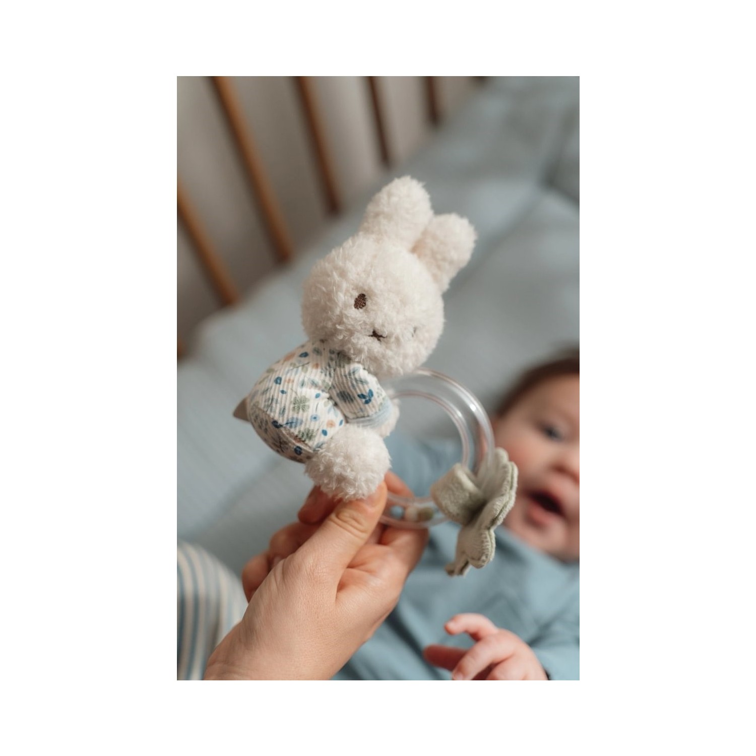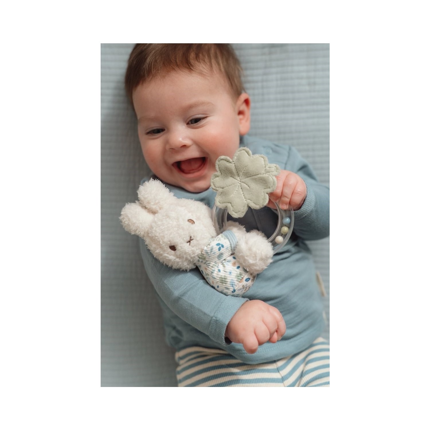 ¡Agárralo, sacúdelo y abrázalo! Este pequeño y suave Miffy sostiene un divertido juguete que hace sonidos tiernos cuando lo mueves y lo agitas. Vestido con Lucky Leaves, un diseño de Little Dutch, Miffy te invita a jugar con el sonajero de aro y acurrucarte con el trébol de cuatro hojas verde. El aro transparente está lleno de pequeñas cuentas que suenan cuando tu bebé mueve a Miffy hacia arriba y hacia abajo y hacia adelante y hacia atrás