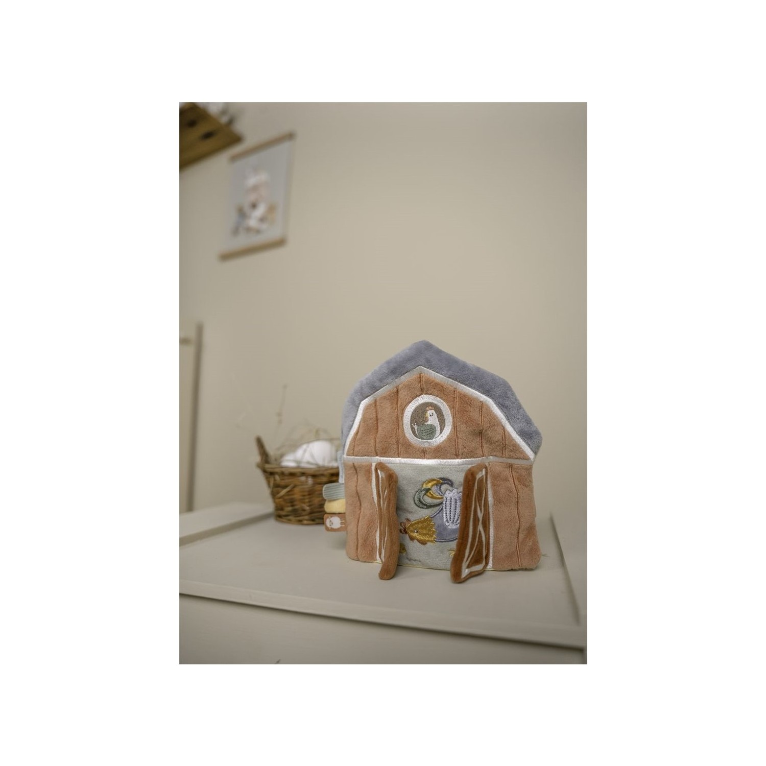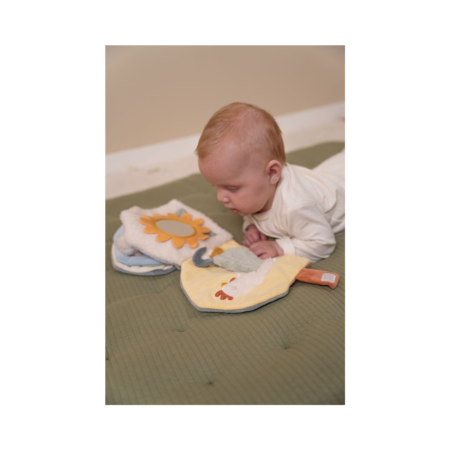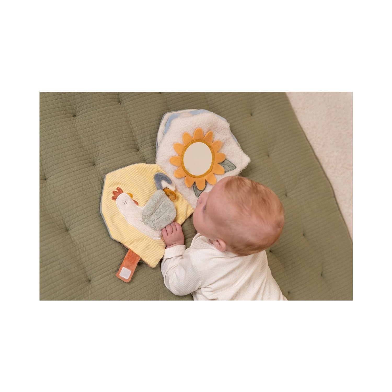 Libro blandito de actividades para bebé con forma del edificio de una granja. En él podrás encontrar a todos los protagonistas de la nueva colección Little Farm, el cerdo, la vaca, el gallo. Este libro es genial para fomentar la coordinación ojo-mano. Incluye en una de sus páginas un espejo, un sonajero crujiente y etiquetas para tocar. Cierra sus blanditas páginas con una tira de velcro.