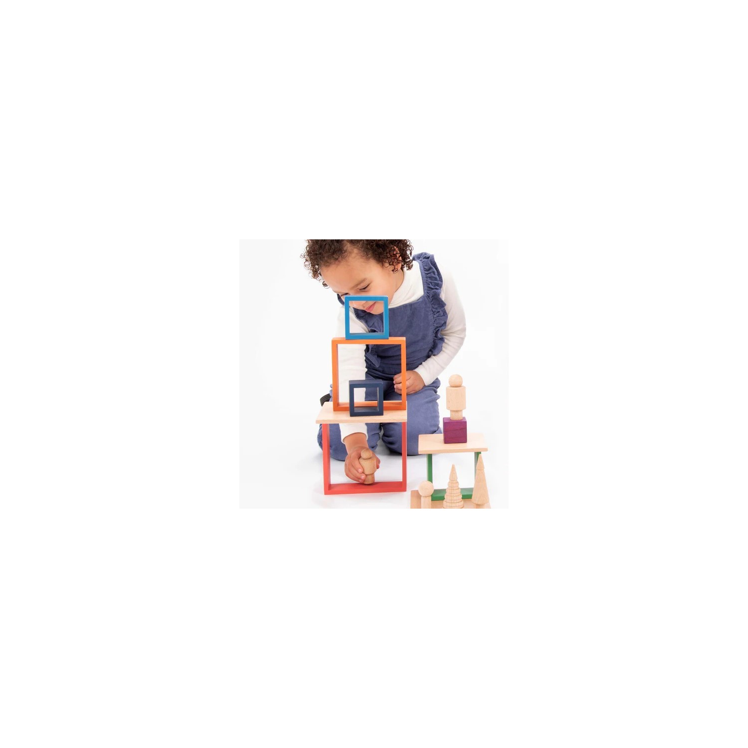 Aprendiendo a través del juego, el conjunto de anidación se puede usar para diseñar y construir torres o crear hogares para personas o animales pequeños que juegan en el mundo, mientras fomenta y desarrolla la lógica matemática para clasificar las formas por color o tamaño; aprender las propiedades geométricas de los cuadrados; explorar el tamaño y la escala; utilizando el lenguaje matemático (más grande, más pequeño, más alto, más ancho) y para mejorar las habilidades lingüísticas y el vocabulario descriptivo.