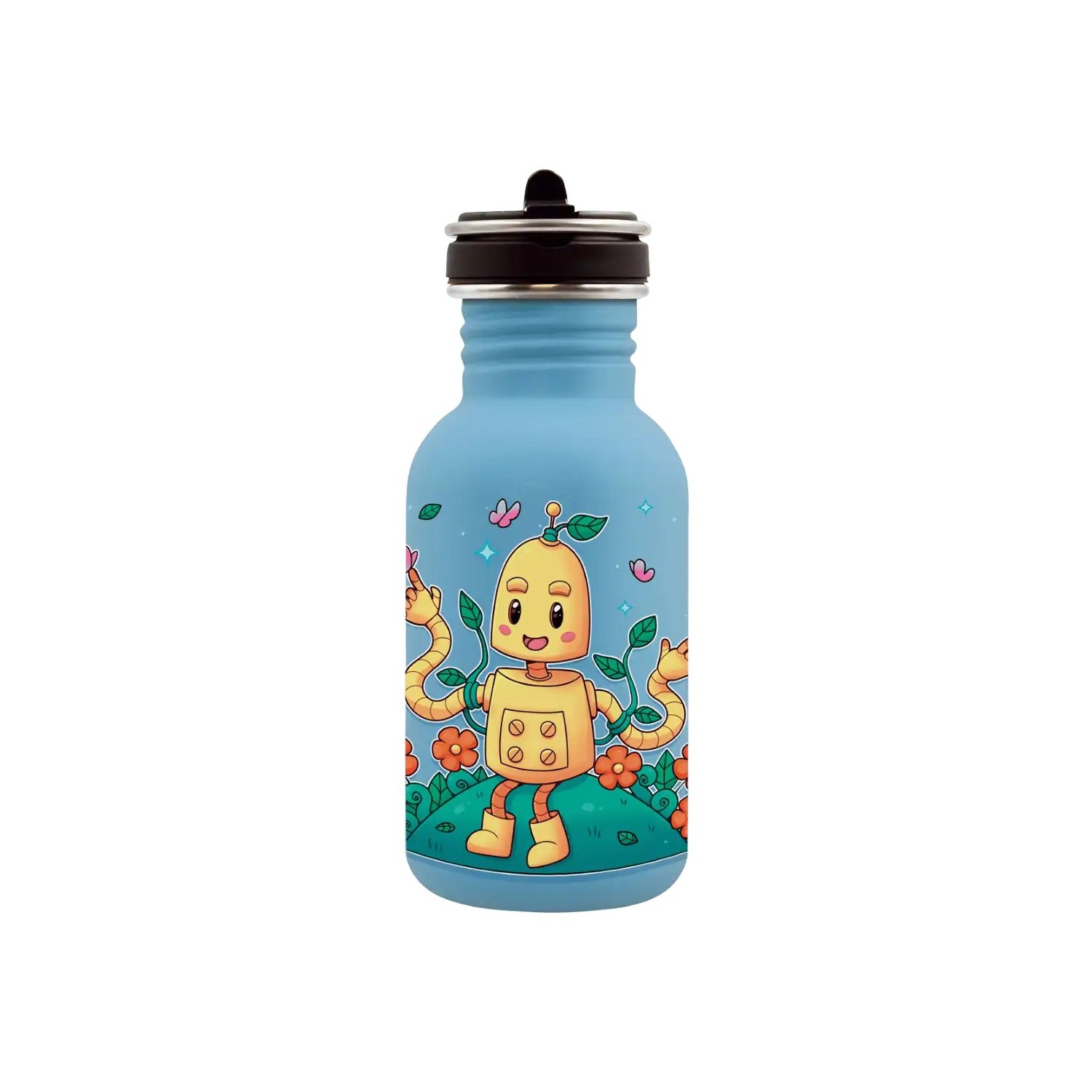Botella infantil de acero inoxidable 18/8 de una pared, totalmente segura para los peques. El tapón FLOW gira la boquilla para beber fácil, de pie o inclinada.