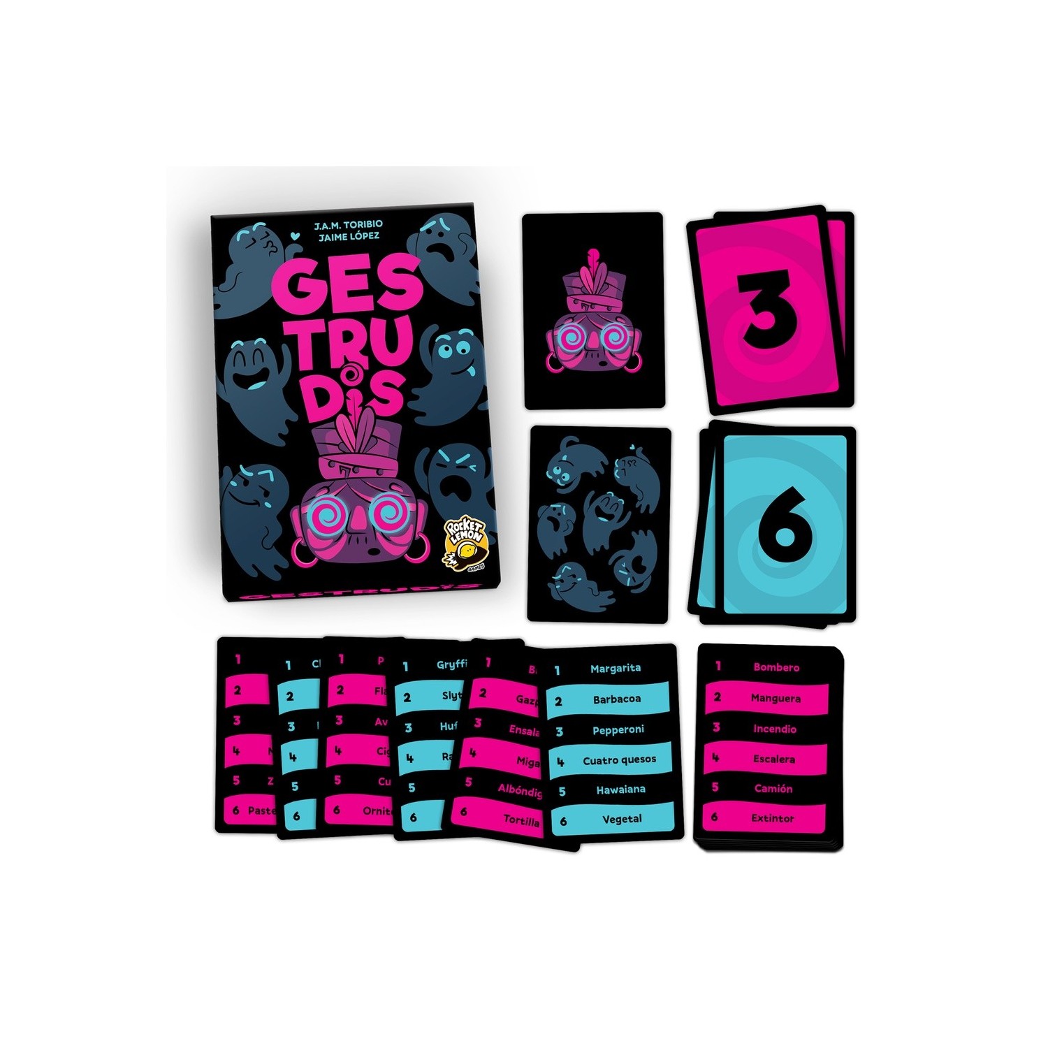 Dentro de la caja de Gestrudis encontrarás un loquísimo party de mímica y sonidos fantasmales con grandes dosis de cachondeo que será un éxito asegurado en tus quedadas con amigos.