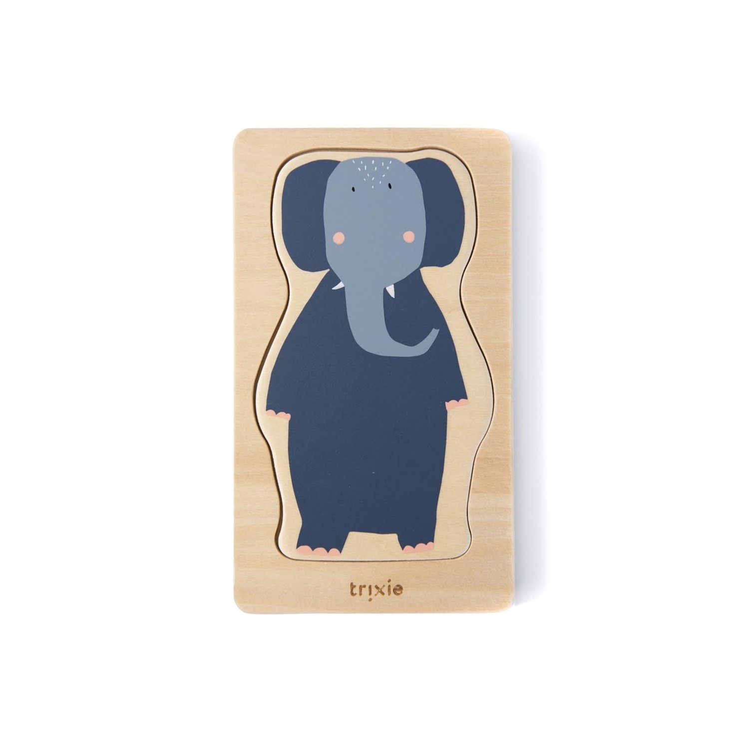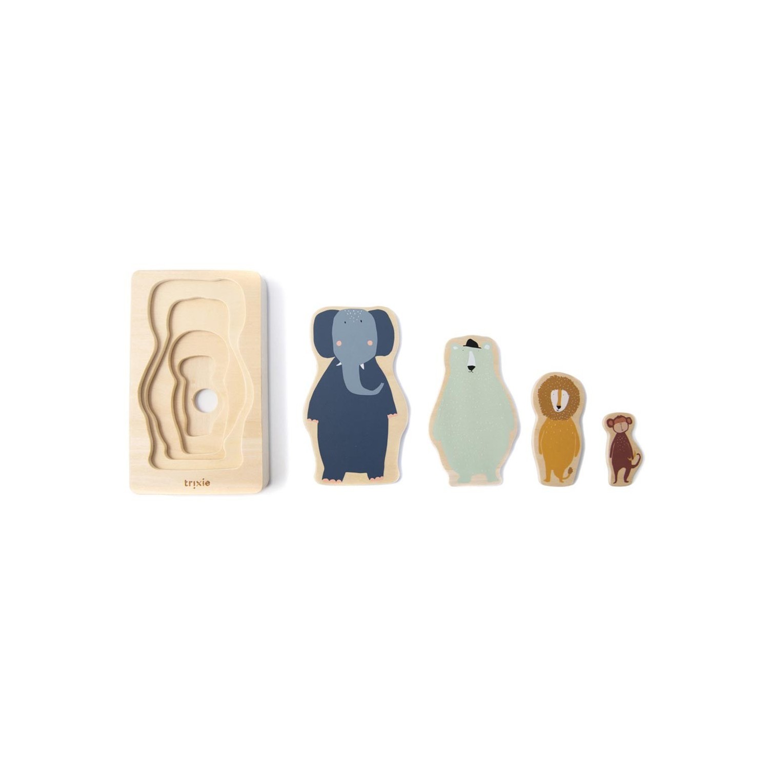 ¿Quién se esconde detrás de la Sra. Elefante? Puedes descubrir cuatro animales escondidos detrás de Sra. Elefante. Apilar los diferentes animales en el orden correcto mejorará las habilidades motoras finas de los niños, así como su cognición. Los niños aprenderán sobre animales y colores, mientras los colocan en el orden correcto. El puzzle y los animales están hechos 100% de madera certificada FSC®. Todas las pinturas utilizadas son a base de agua, seguras para los niños y no tóxicas.
