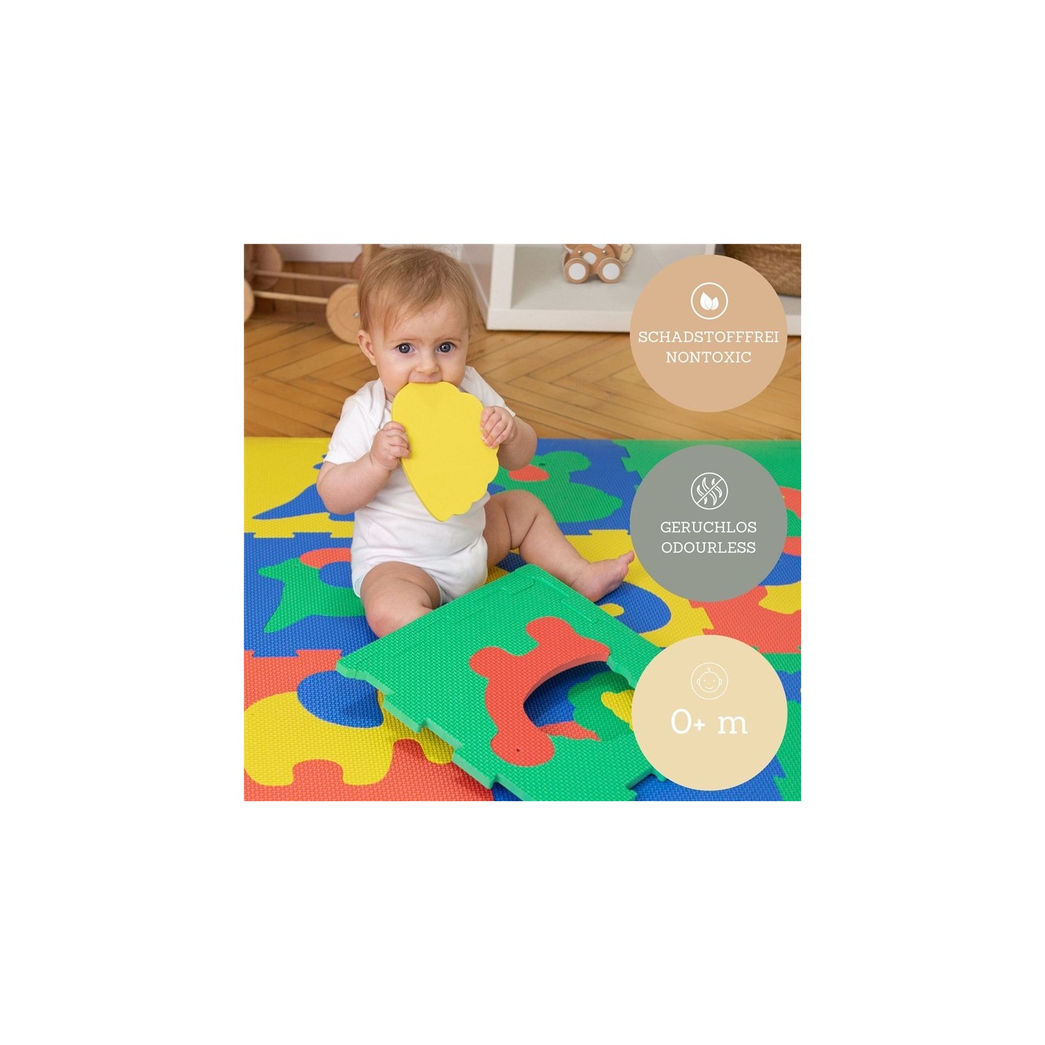 ¡Tu hijo juega y tú te relajas! Esta gran alfombra de juegos de foam (120 x 90 cm) consta de 12 cuadrados de espuma de 30 x 30 cm cada uno y 14 piezas de borde. Es perfecta para gatear, jugar, hacer yoga en casa, hacer ejercicio y usarla al aire libre. La alfombra de puzle para bebés, un 20 % más suave y cálida, está hecha de espuma EVA de alta calidad y tiene un grosor de 1,2 cm. Gracias a su enclavamiento seguro, las placas encajan perfectamente entre sí y proporcionan un cómodo acolchado en suelos duros y fríos. 100 % segura y sin olores: la alfombra de juegos no contiene formamida, BPA ni ftalatos y cumple con las normas de seguridad de los juguetes de la UE.