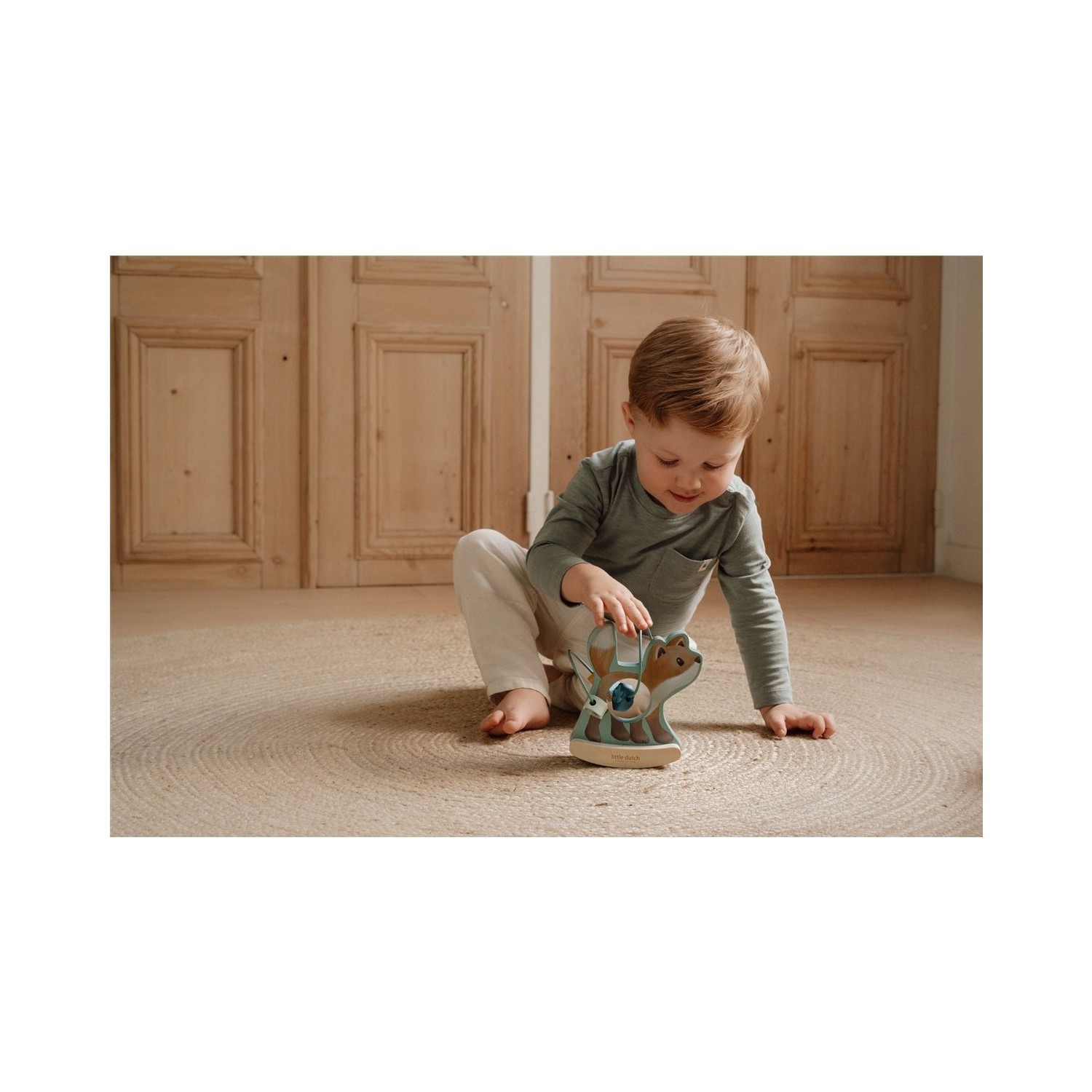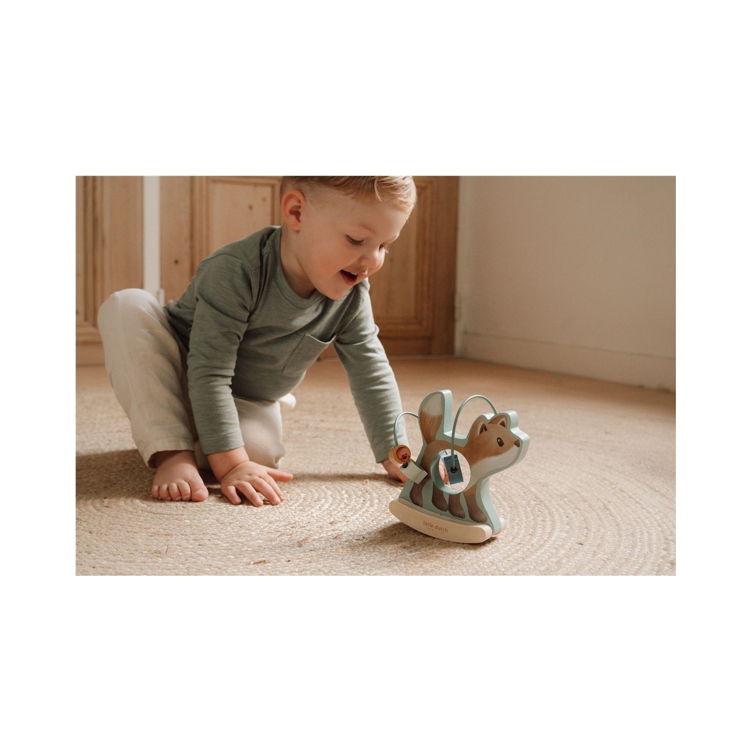 Deja que las cuentas giren alrededor del zorro de madera mientras se balancea hacia adelante y hacia atrás. Fomentando la interacción lúdica. Este encantador juguete te invita a darle un suave empujón, poniéndolo en movimiento para bailar por el bosque encantado. En forma de hojas, piñas y setas, las cuentas recorren un camino en espiral a través de la superficie del zorro