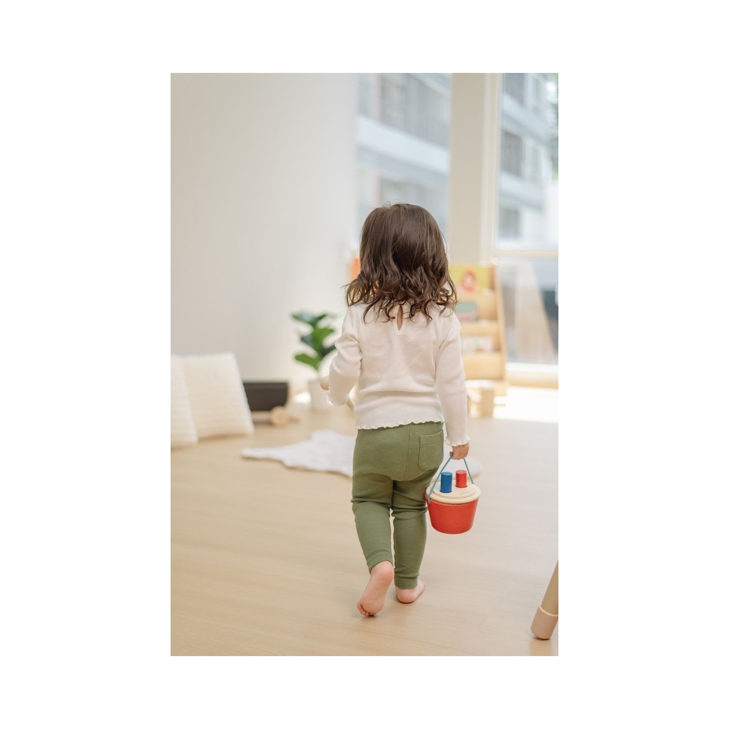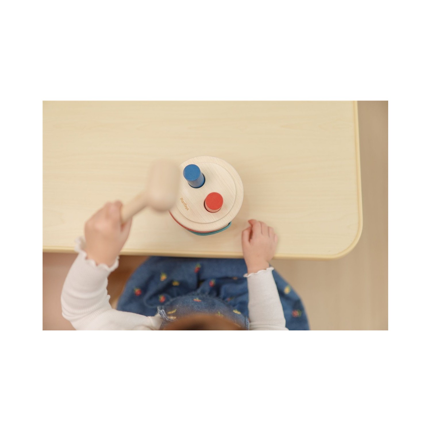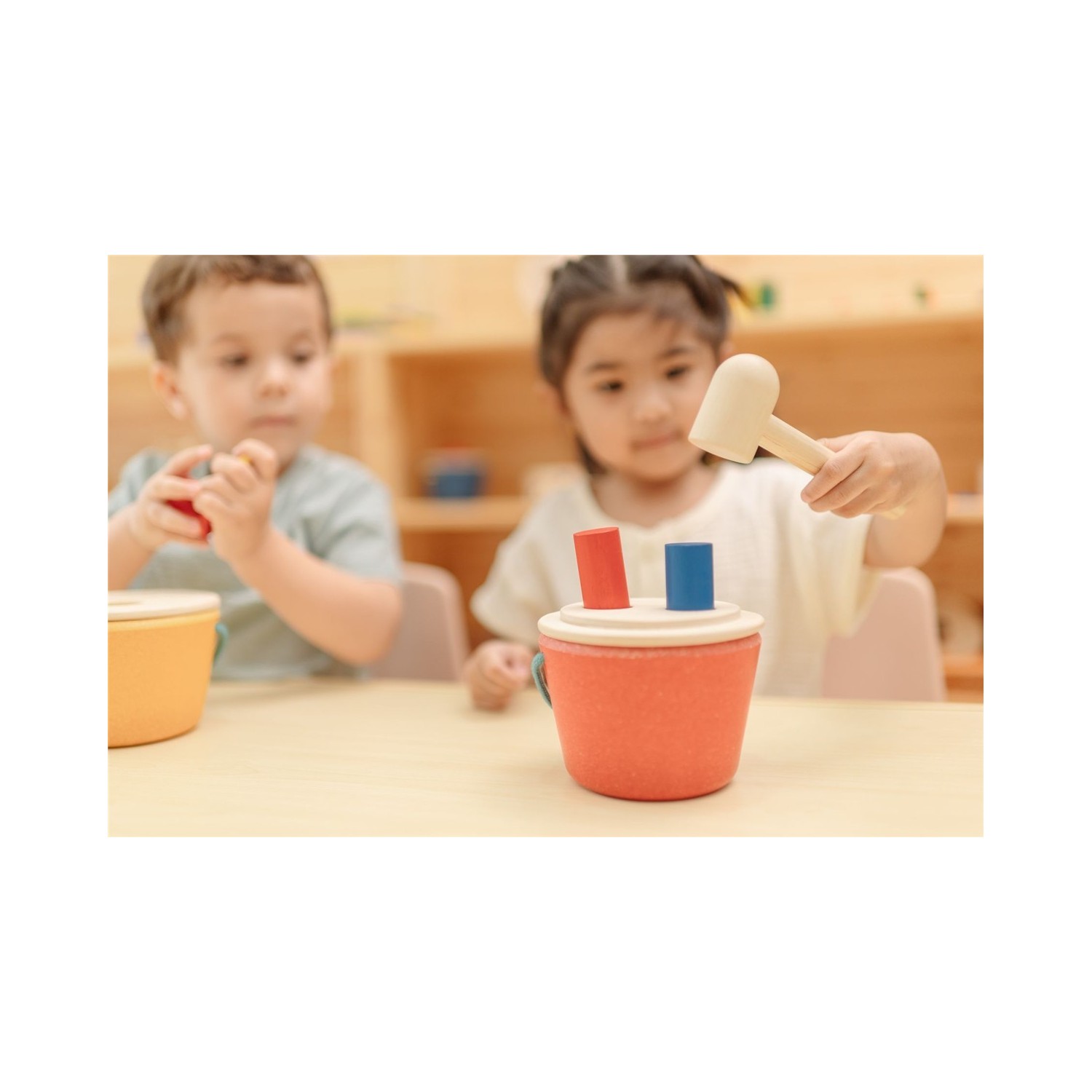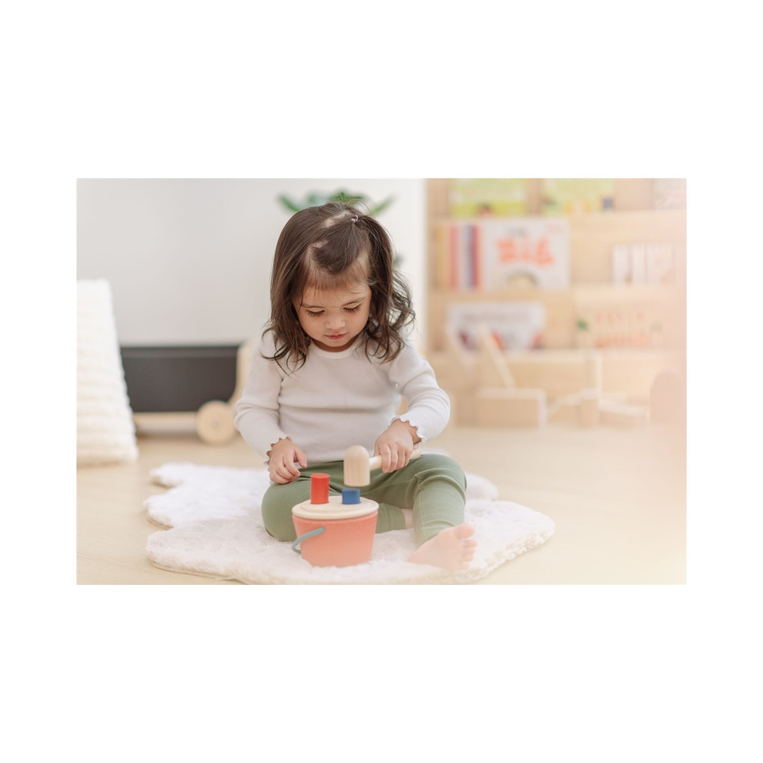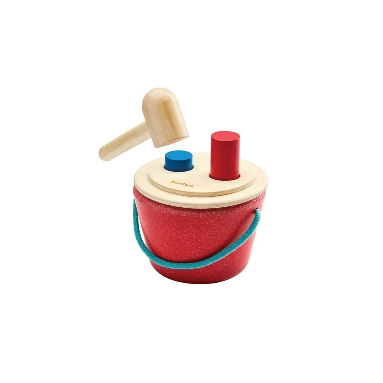 Parte de nuestra colección de inspiración Montessori, este juguete enseña a reconocer objetos mientras los niños usan el martillo para empujar y sacar las clavijas del cubo. La tapa se abre para mayor participación y el asa facilita su transporte, perfecto para divertirse en cualquier lugar. Fabricado de forma sostenible con materiales ecológicos, como madera de caucho sin químicos y tintes a base de agua. Incluye: un cubo con tapa de 2 agujeros, 2 clavijas (roja y azul) y un martillo.