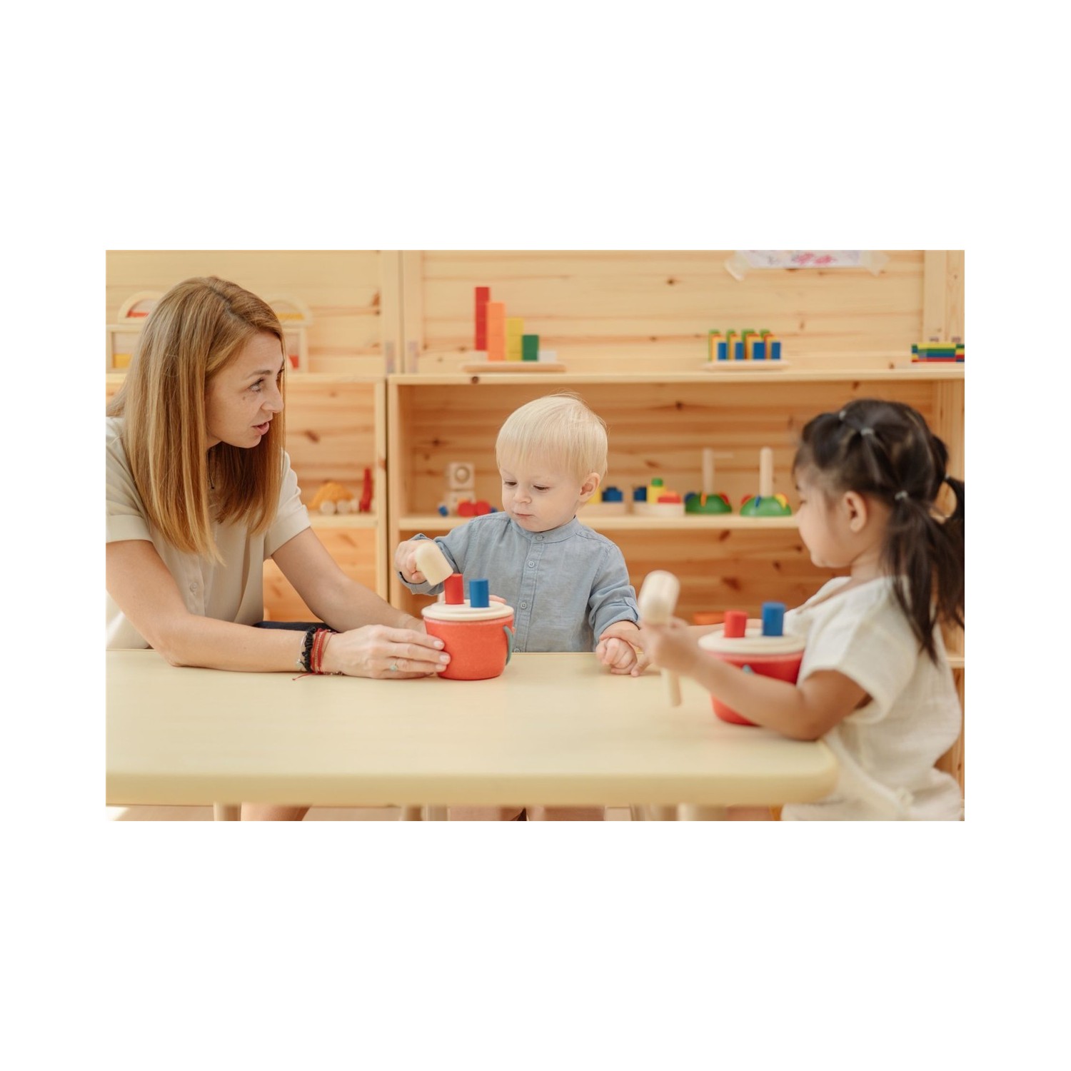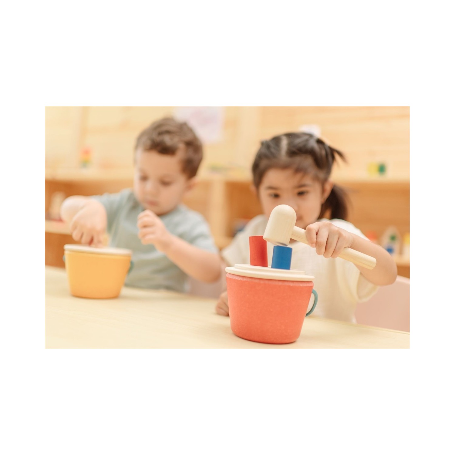 Diseñado para desarrollar la motricidad fina y gruesa, este juguete anima a los niños a clavar clavijas en el cubo, mejorando el agarre, la coordinación ojo-mano y la percepción espacial. A medida que las clavijas desaparecen de la vista, los niños aprenden sobre la permanencia de los objetos y se les anima a levantar la tapa para recuperarlas, lo que refuerza la resolución de problemas y el aprendizaje por ensayo y error.