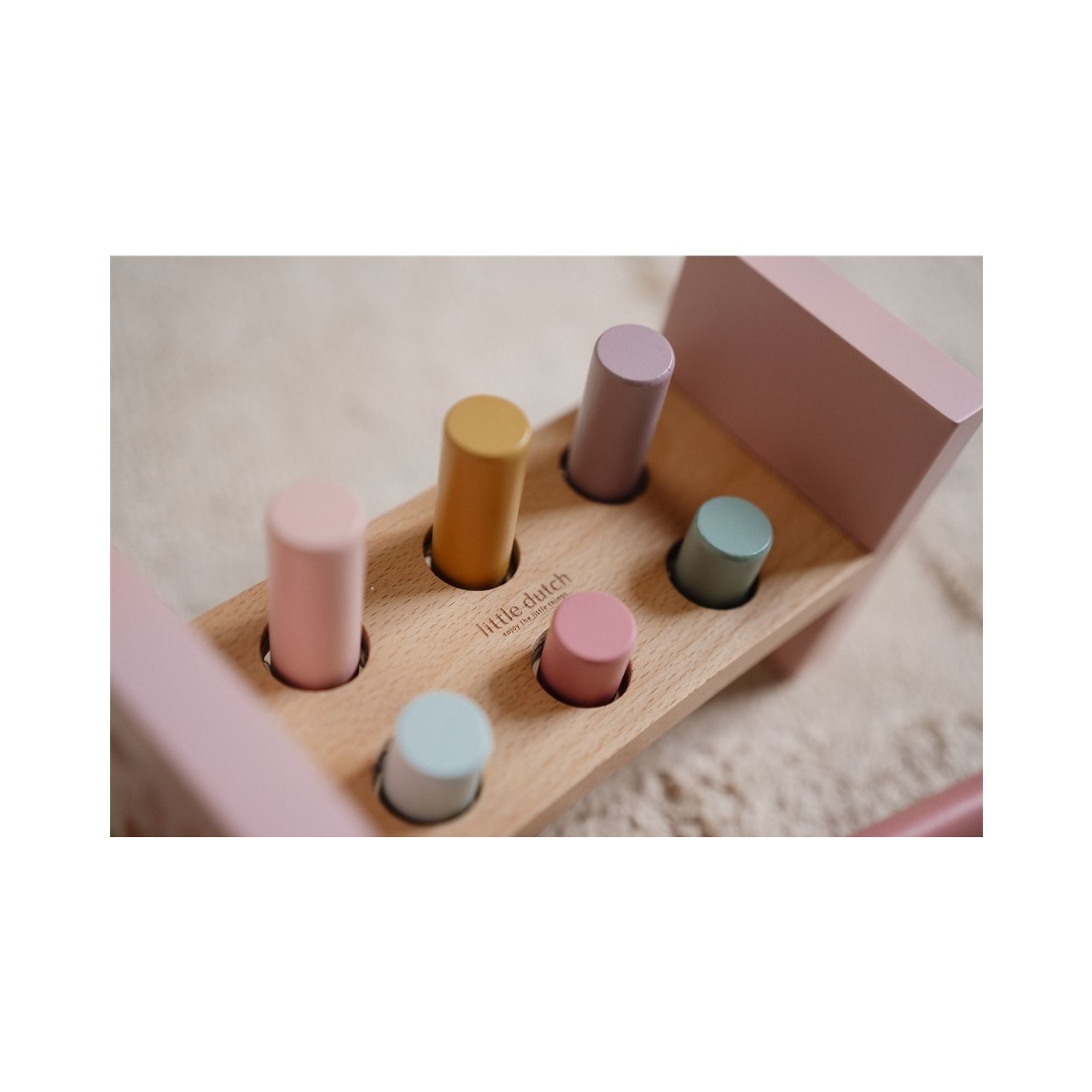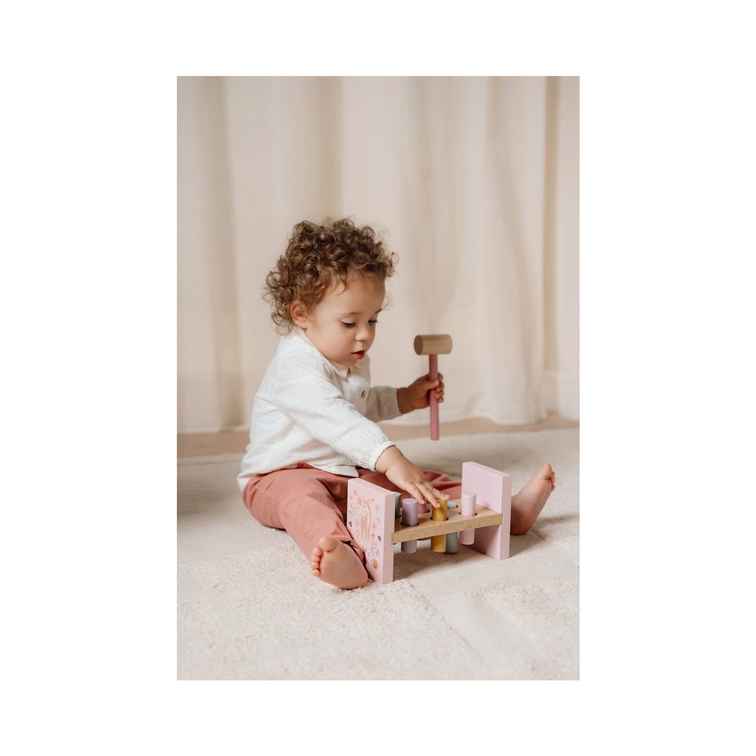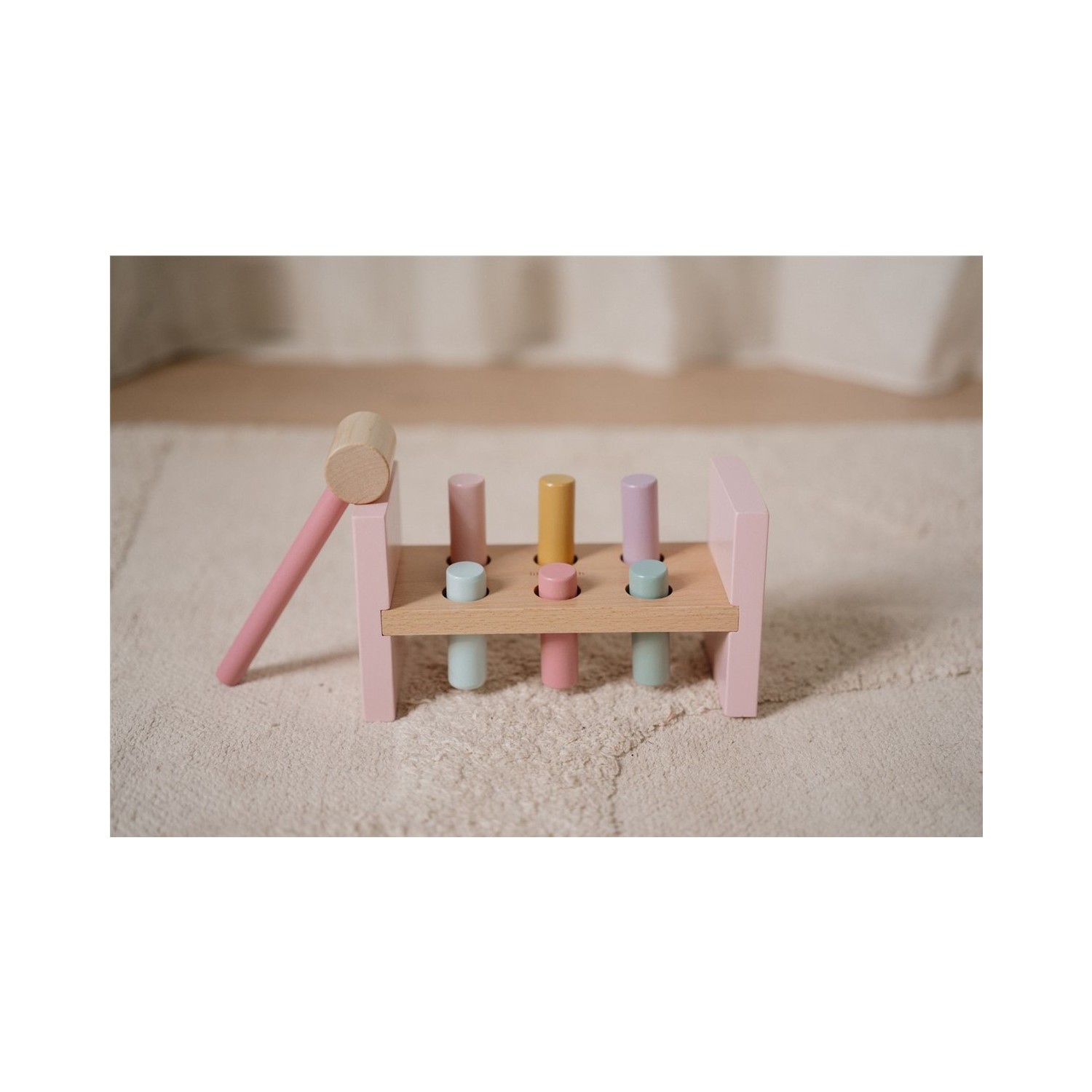 ¡Toc, toc, toc! Usa el mazo para golpear las 6 clavijas de colores en el banco de madera y explora la magia del Jardín de las Hadas. ¿Terminaste de golpear? ¡Gira el banco y comienza de nuevo! Este es un muy buen ejercicio para el desarrollo de las habilidades motoras que seguramente mantendrá a tu pequeño entretenido por un rato.