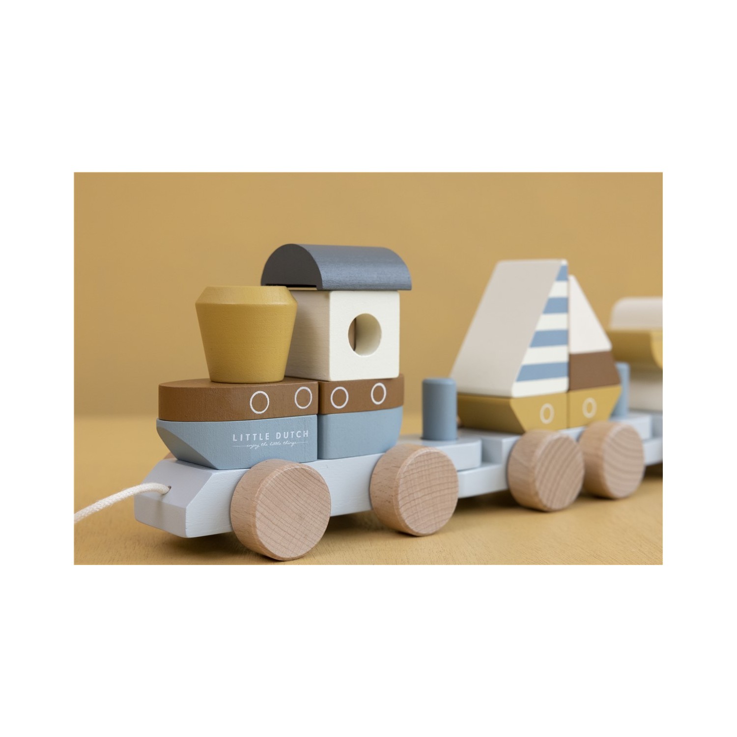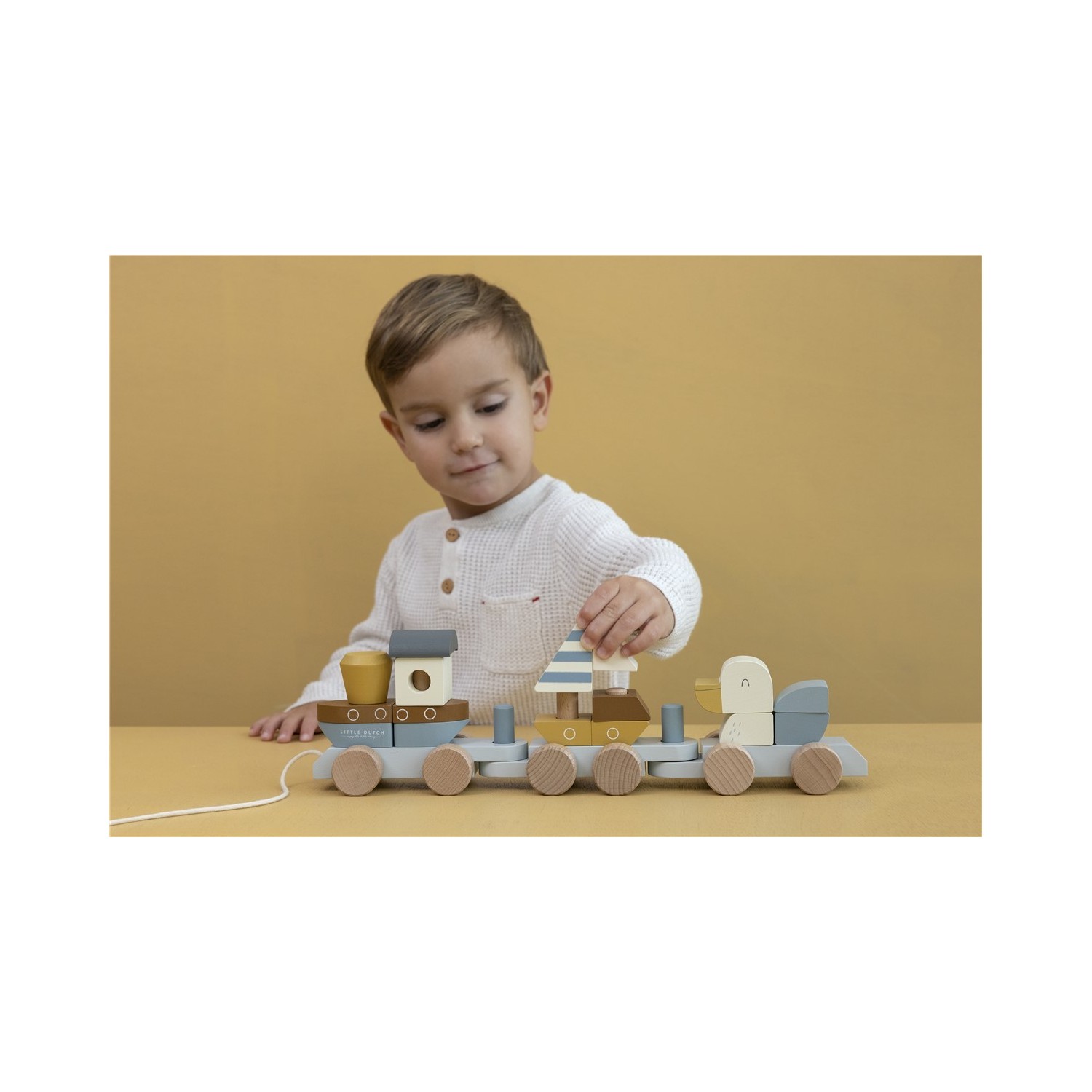 ¡Subamos al tren! Guiado por un barco de pescadores, este tren de madera se dirige a Sailors Bay. Usa tu imaginación para construir el tren usando los bloques apilables en varias formas y colores inspirados en el puerto. Hay 3 vagones para apilar con un barco de pescador, un velero y una gaviota descarada. Desafía a tu pequeño a crear diferentes combinaciones para apoyar la coordinación ojo-mano y la motricidad fina. También es un bonito accesorio para la guardería o la sala de juegos.