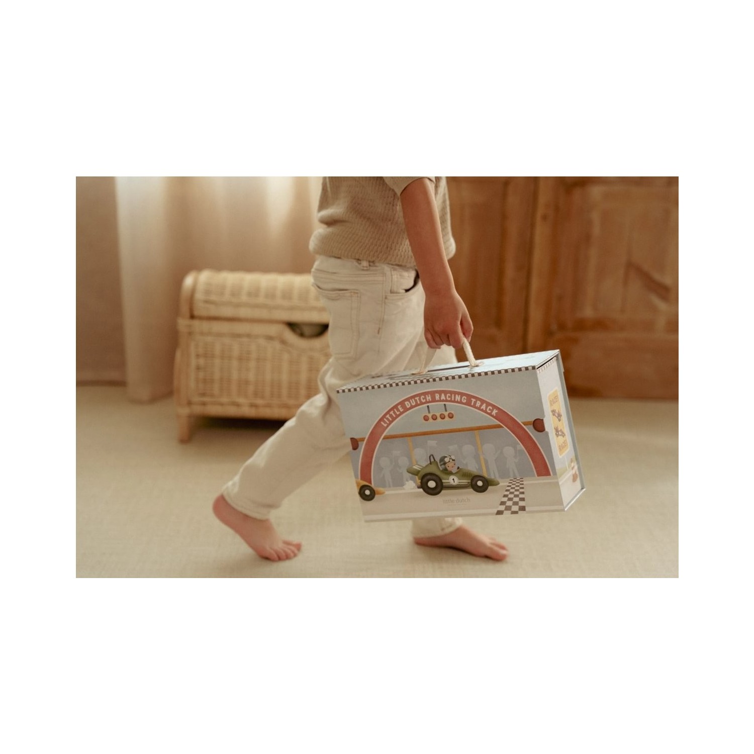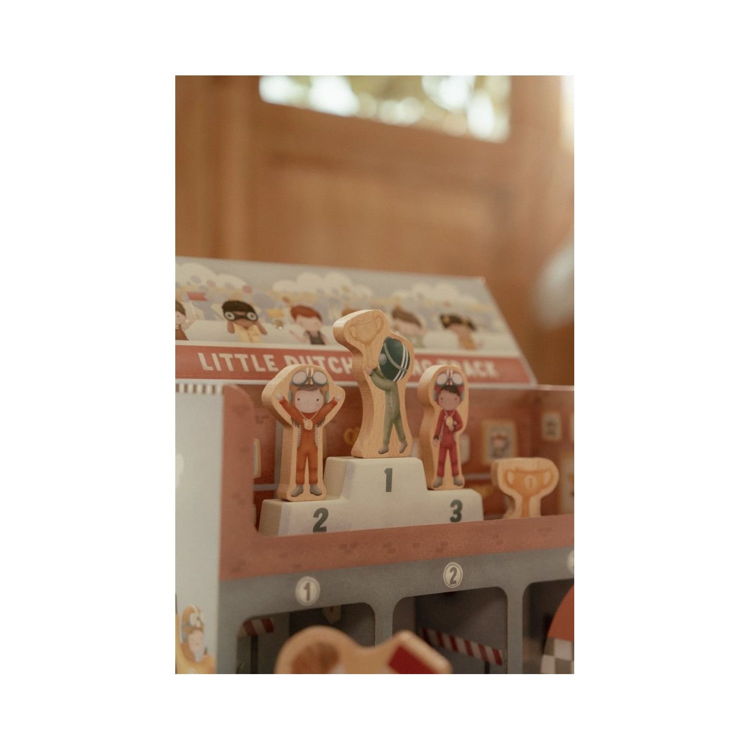 ¡Arranquen motores! Este estuche de cartón se transforma en una pista de carreras completa. El set incluye todo lo necesario para una carrera emocionante: coches de carreras, pilotos, una línea de meta, señales de tráfico, un trofeo y un podio de ganadores. La pista de cartón consta de piezas independientes que se ensamblan fácilmente como un rompecabezas. Después de la carrera, puedes guardar todo cuidadosamente en el estuche. ¿Listo para la siguiente carrera?