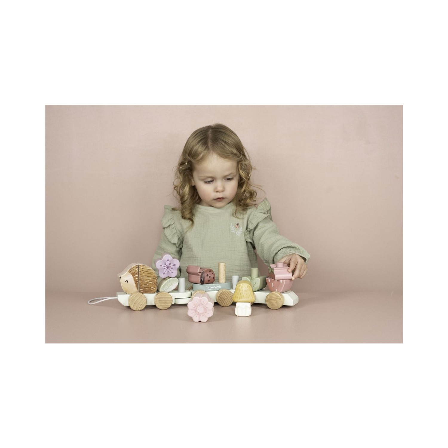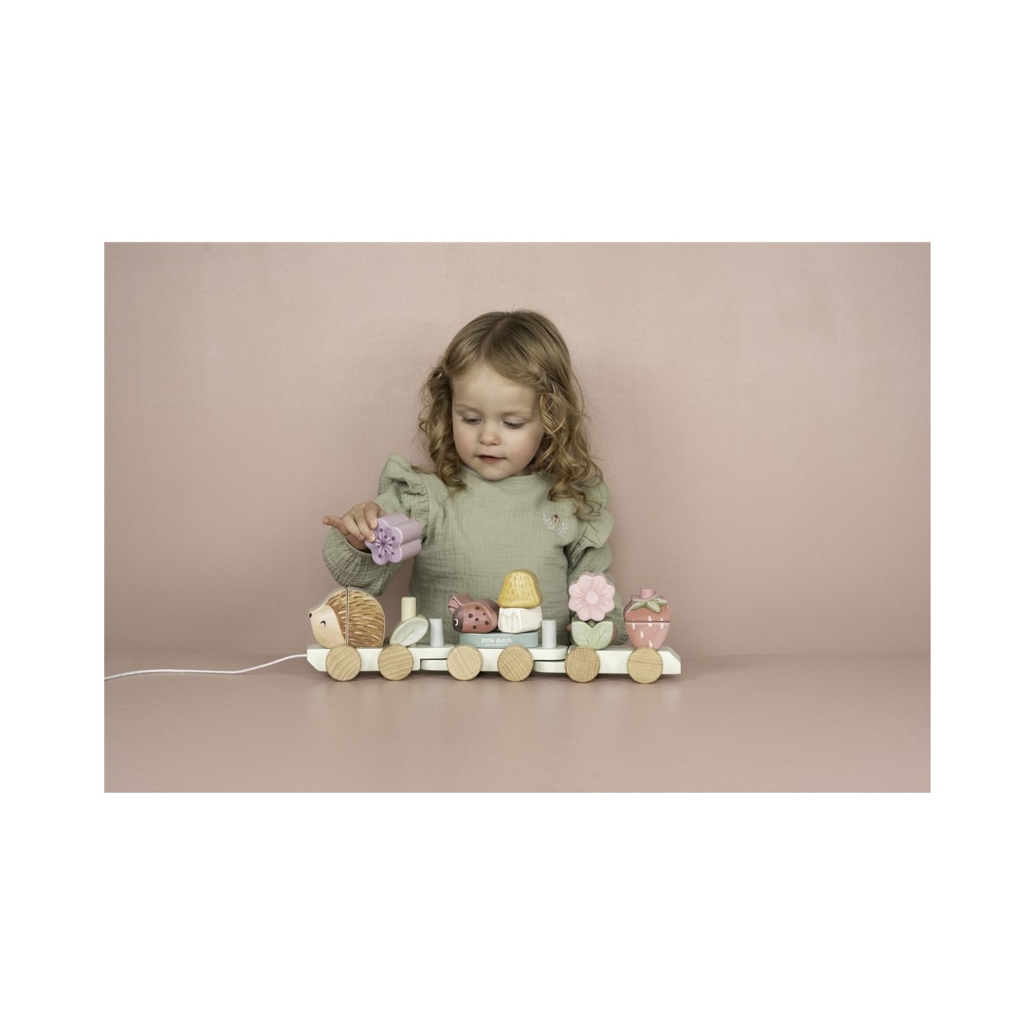 ¡Chú, chú! Reúne todos los adorables animales, flores y tesoros del Jardín de las Hadas y súbete a bordo para emprender un viaje mágico. Apila todos los bloques uno por uno en los tres vagones de este tren apilable de madera. El erizo tomará la delantera y se sentará en la parte delantera. ¿Qué flor le seguirá y dónde se sentará la mariquita? Cada bloque se convierte en una parte de la historia de tu imaginación. Una forma divertida de jugar y desarrollar la coordinación mano-ojo al mismo tiempo