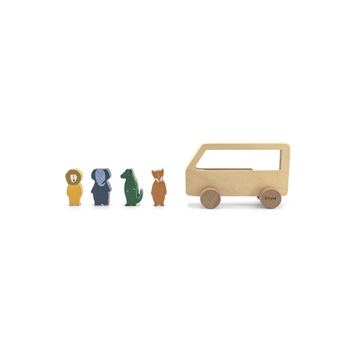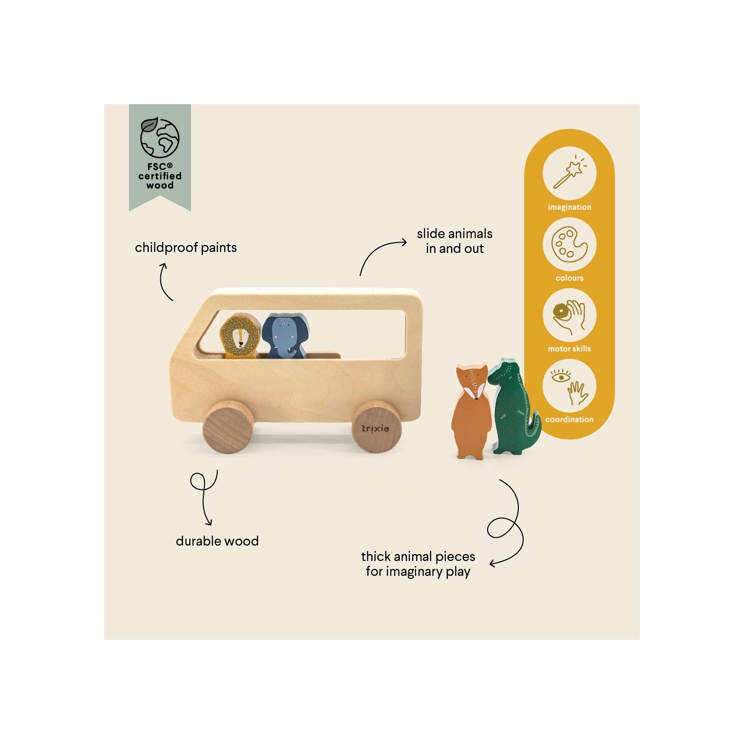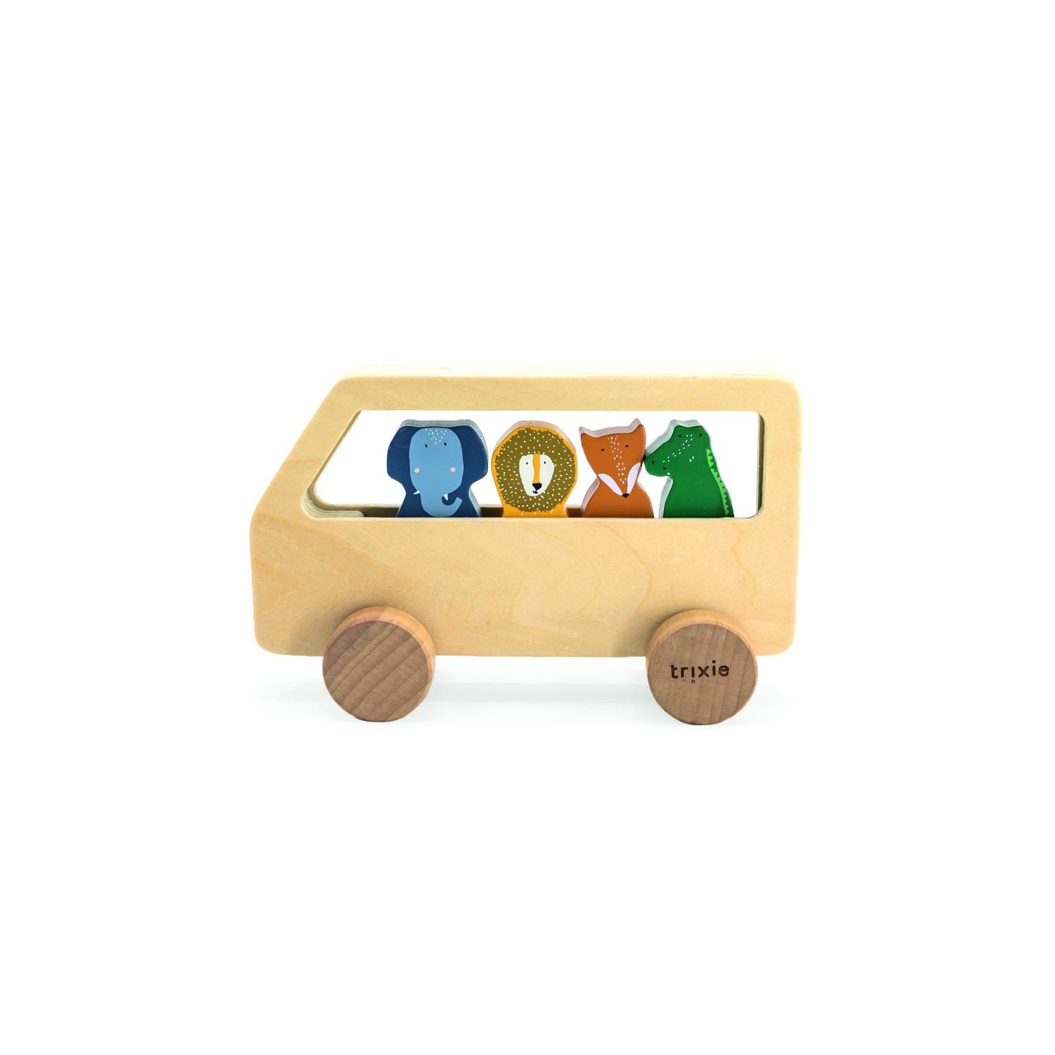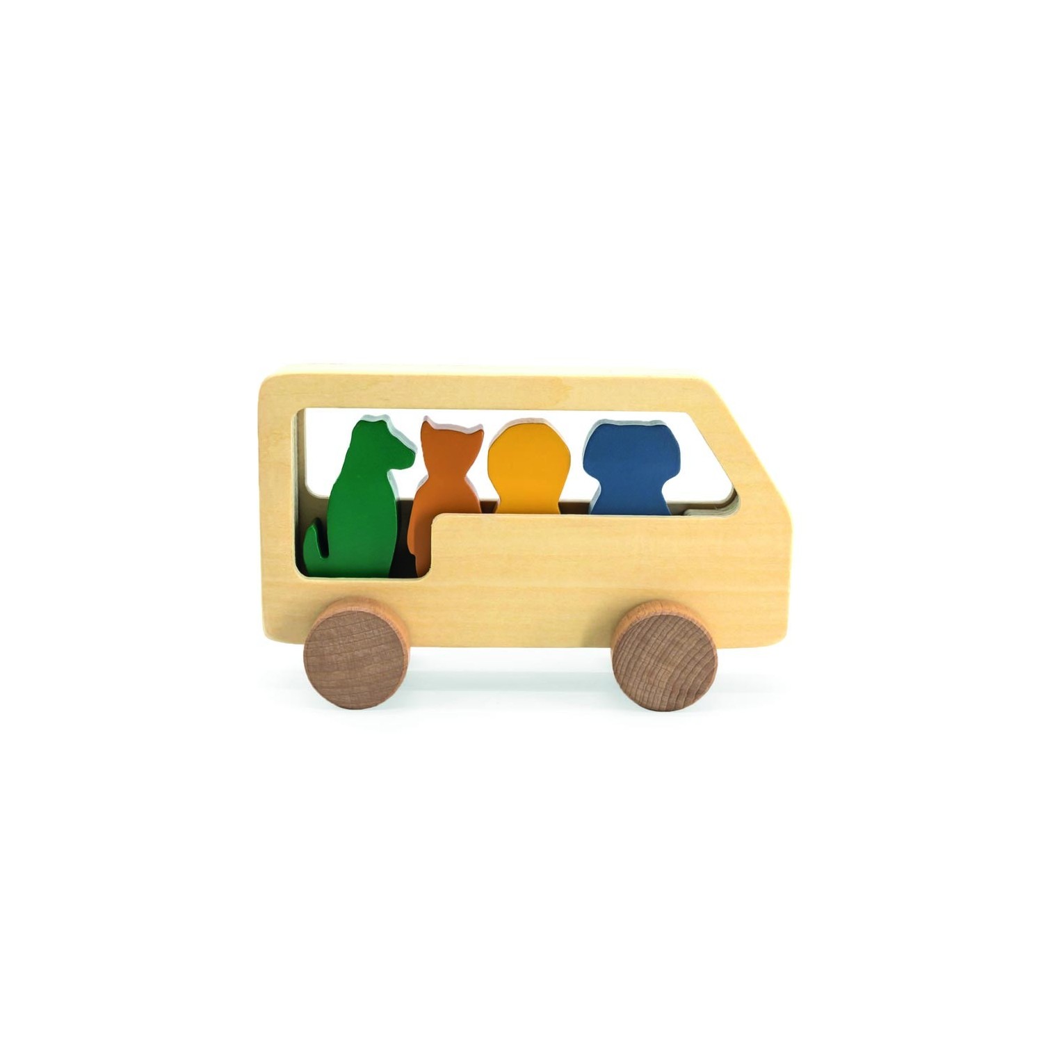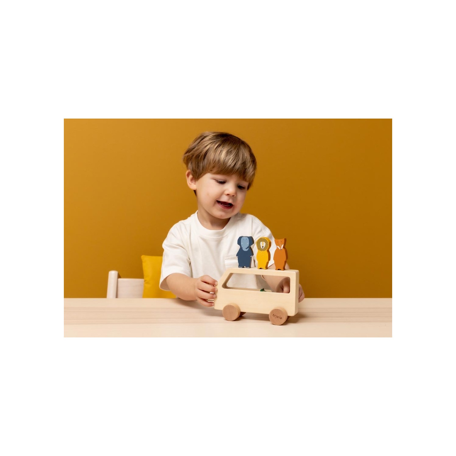"¡Todos a bordo de nuestro bus de animales! El autobús tiene 4 pasajeros a bordo, que puedes deslizar hacia adentro y hacia afuera. ¡Los animales fornidos son ideales para divertirse durante horas! El autobús y los animales están hechos de madera 100% certificada FSC®. Todas las pinturas utilizadas son a base de agua, seguras para los niños y no tóxicas."