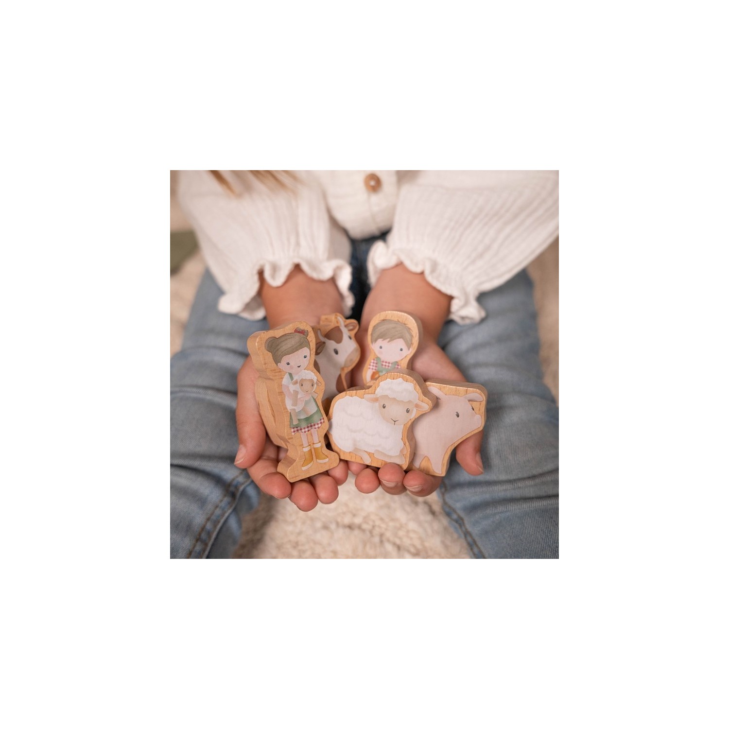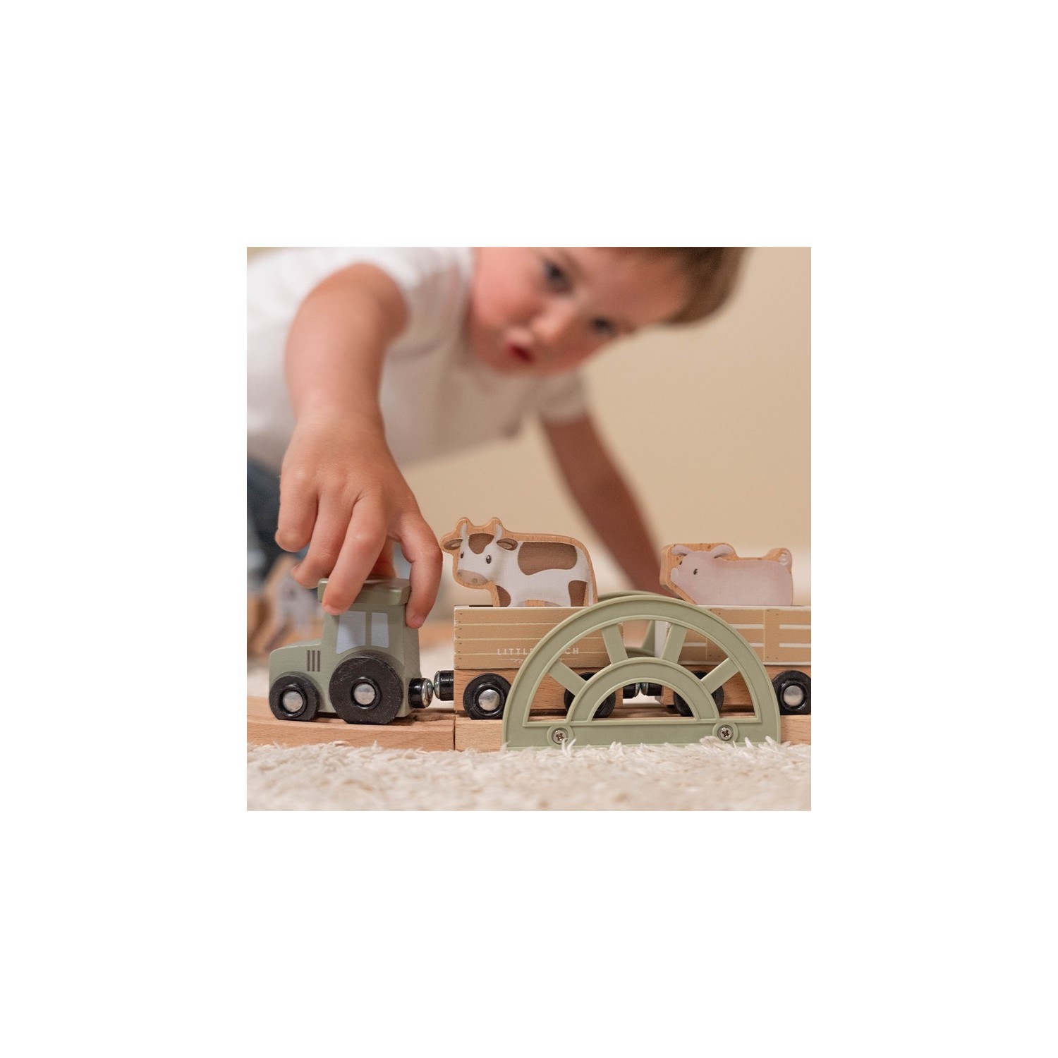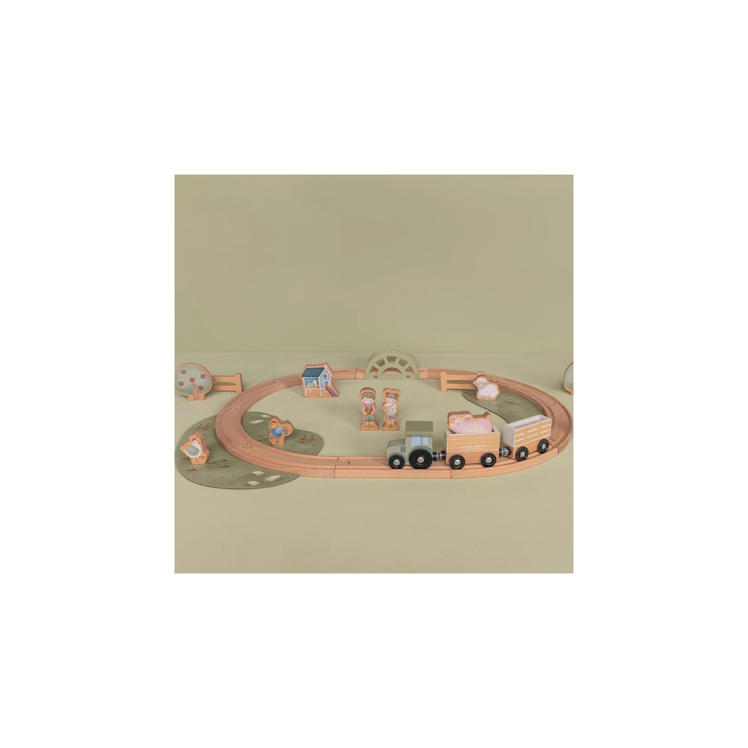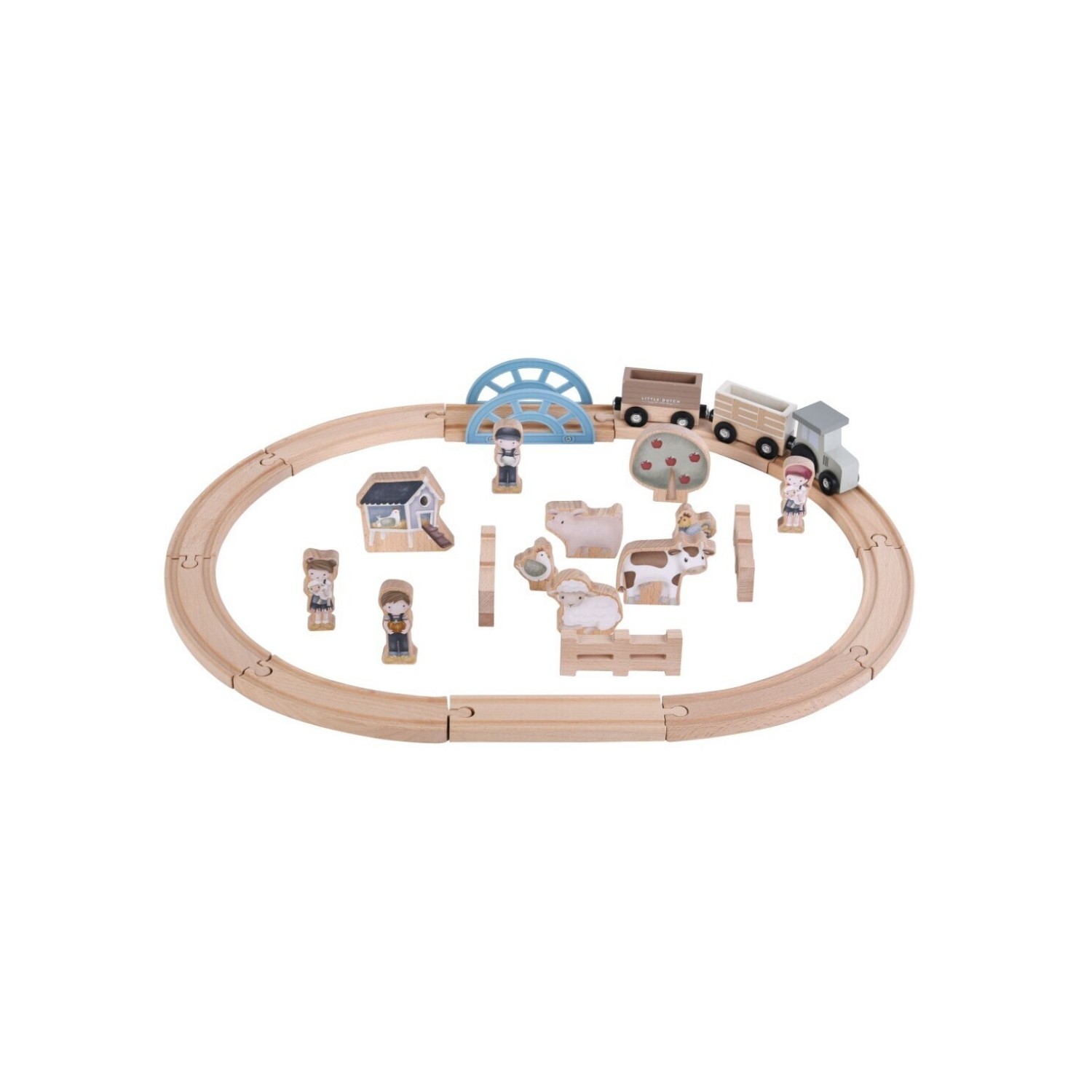 ¡Toc, toc! Embárcate en infinitas aventuras con esta vía de tren de madera de la colección Little Farm. Súbete al tren y dirígete a la granja con todos los animales. ¡Qué viaje tan acogedor! Cada figura de madera está ilustrada en detalle en ambos lados.
