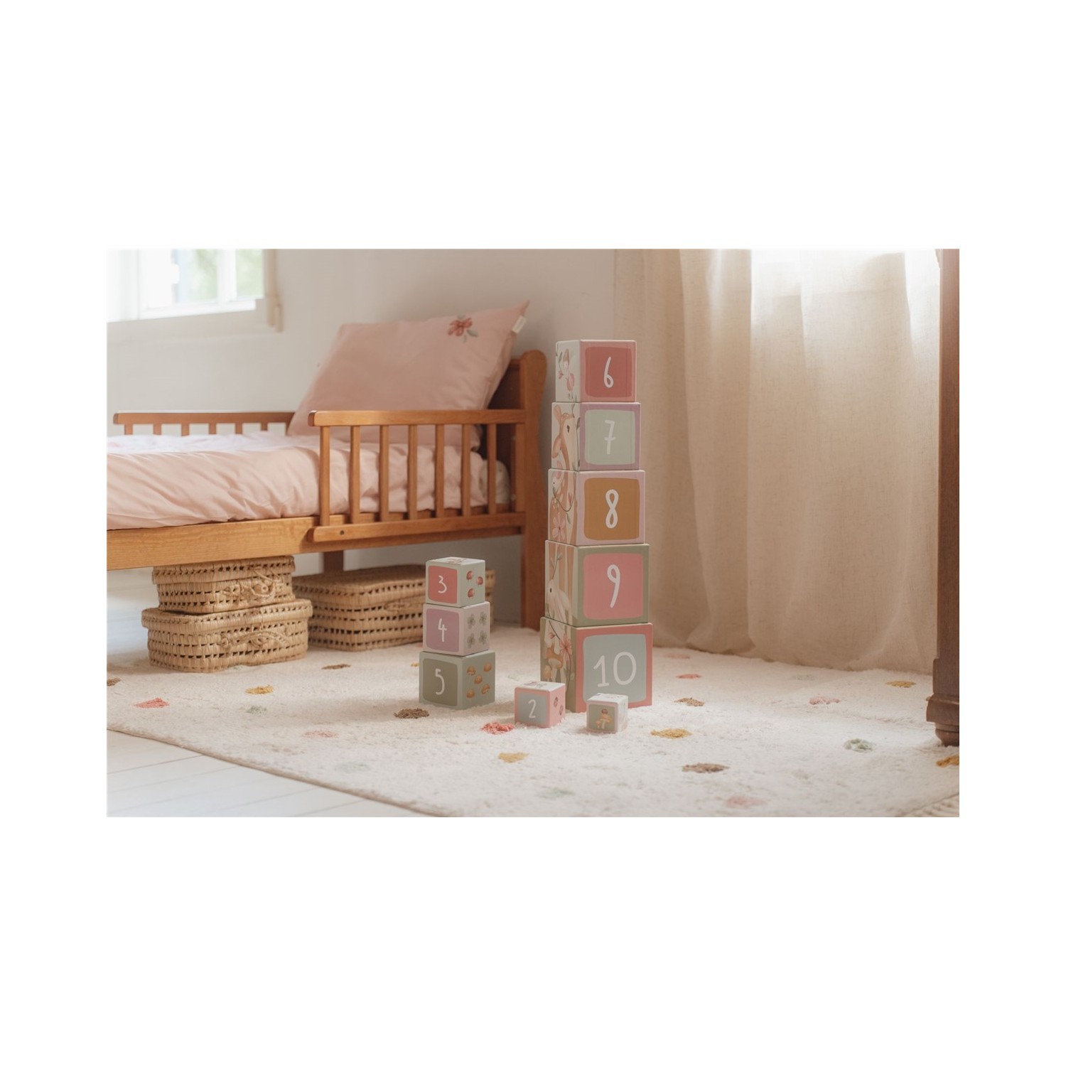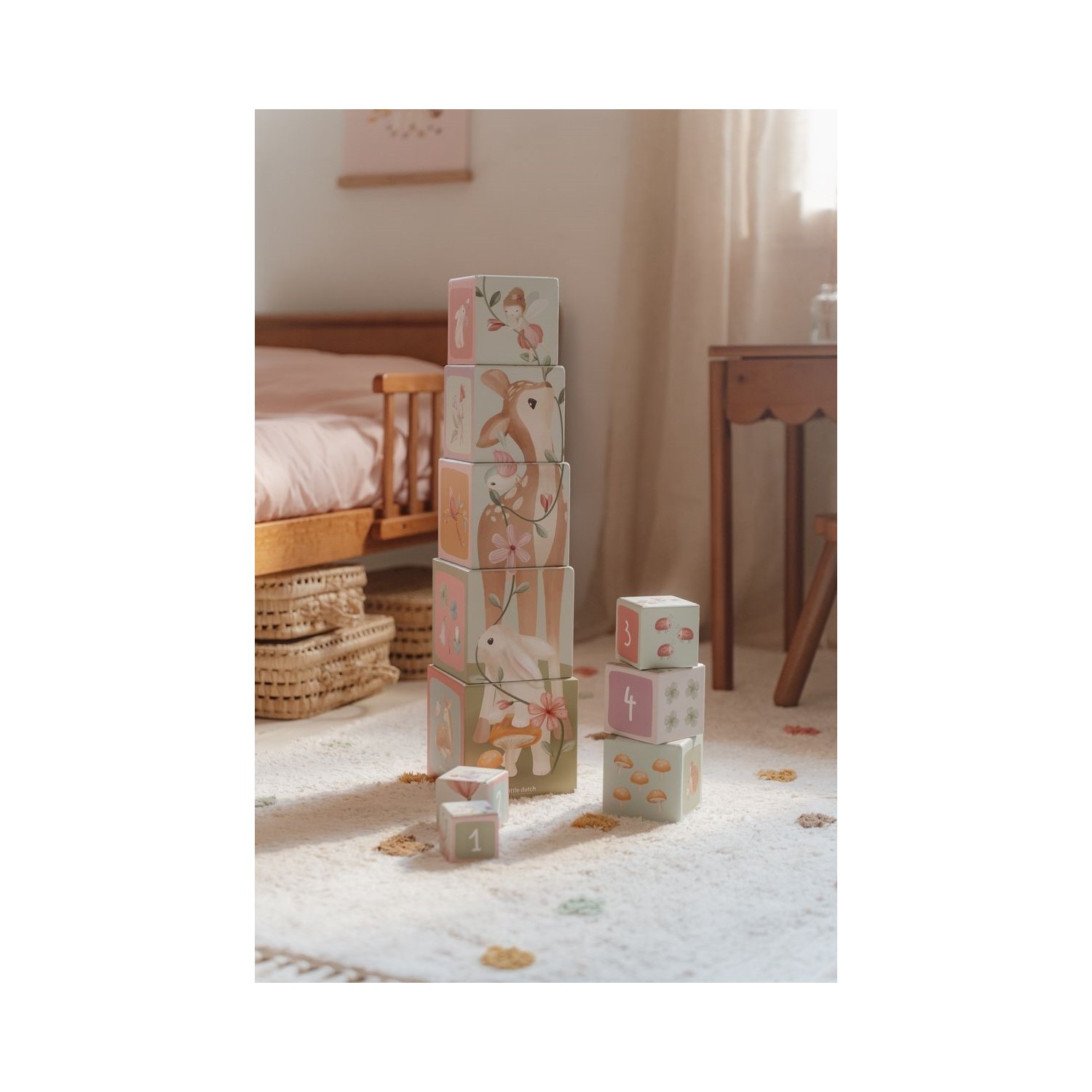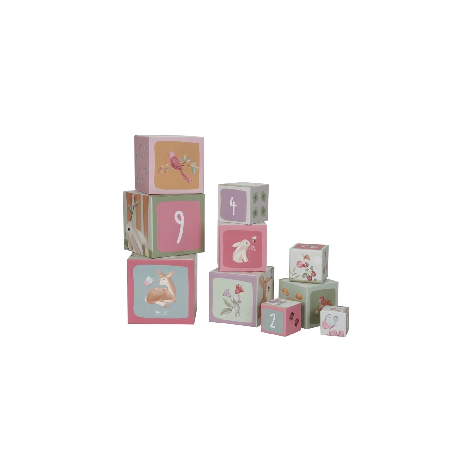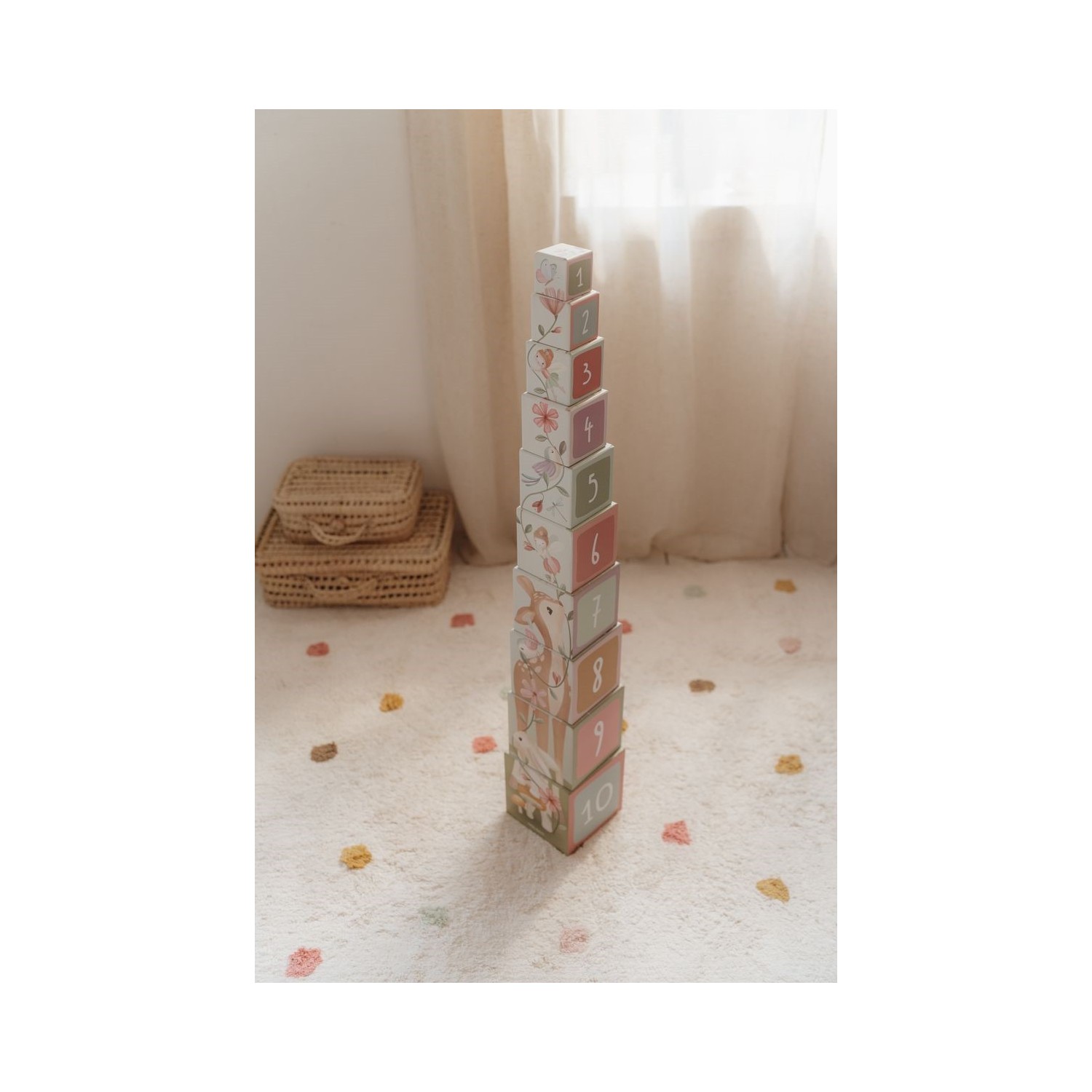 Con estos bloques de construcción, los niños aprenderán a contar hasta 10 de forma lúdica. Cada bloque presenta encantadoras ilustraciones de la colección Fairy Garden, que incluyen ciervos, conejos, erizos, hadas, mariquitas y alegres flores. Los bloques más pequeños se pueden colocar dentro de los más grandes, por lo que son fáciles de ordenar. Los bloques están hechos de cartón resistente, por lo que son muy duraderos. El bloque más pequeño mide 5 cm y el más grande, 14 cm.
