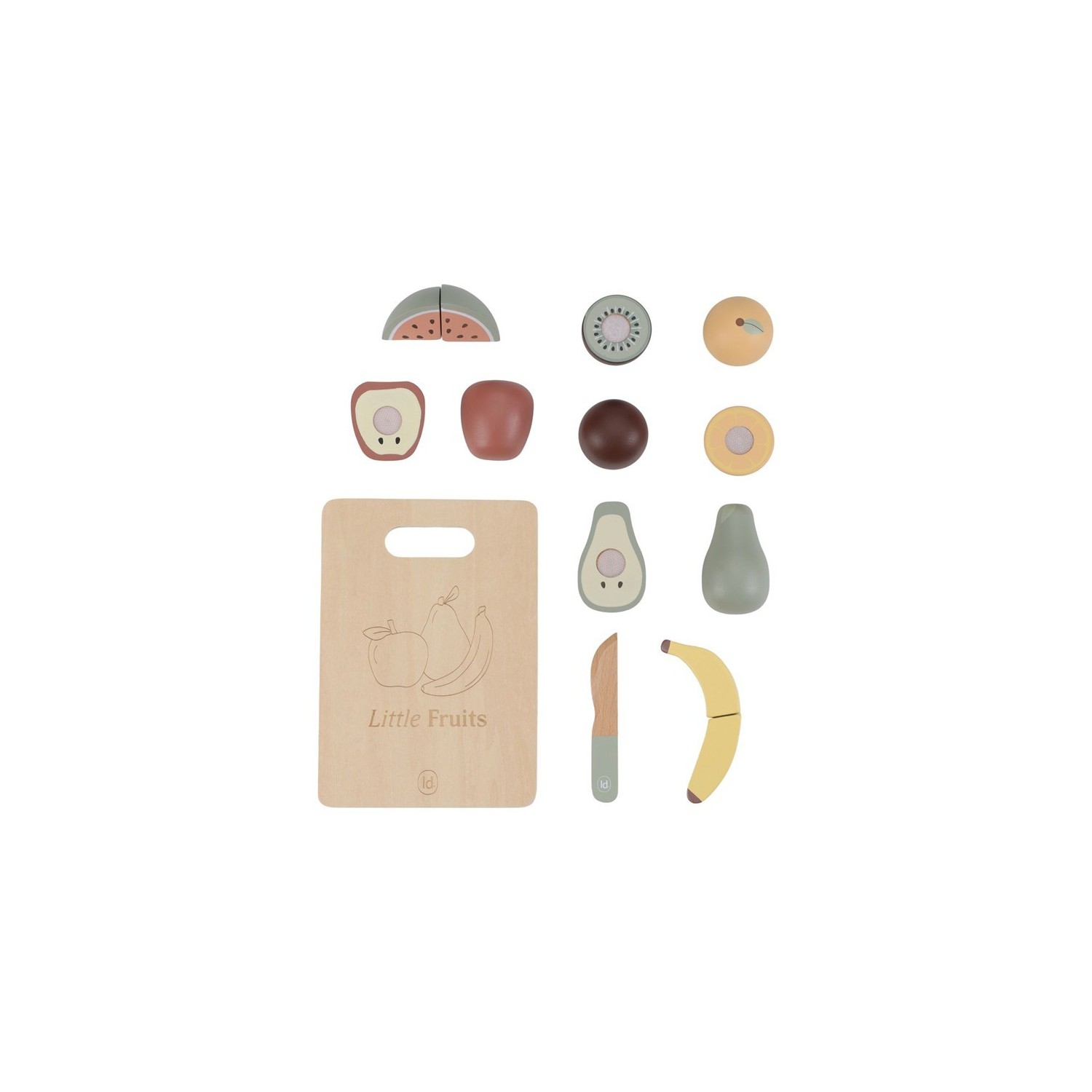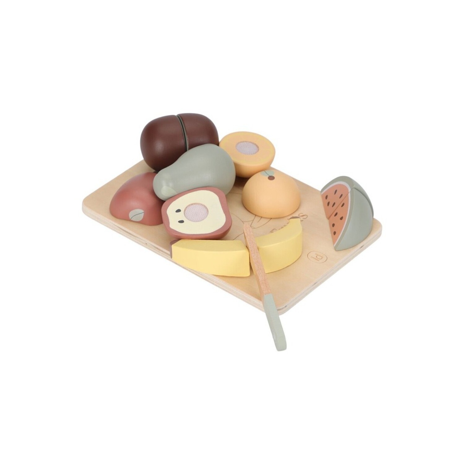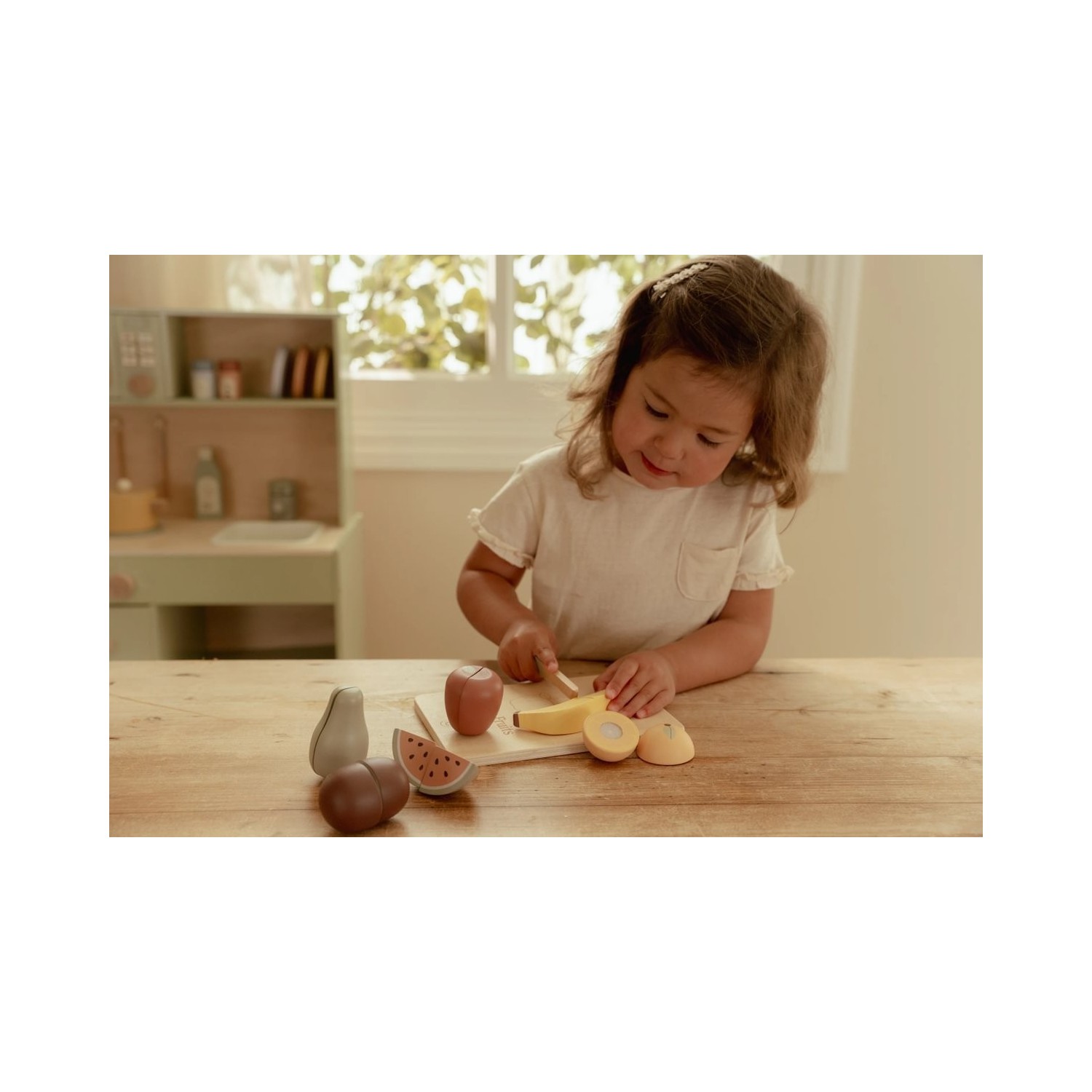 Prepara deliciosas frutas! Este alegre juego de madera para cortar frutas incluye seis tipos diferentes: una manzana, una pera, un plátano, un kiwi, una naranja y una rodaja de sandía. Cada pieza de fruta se puede cortar por la mitad con el cuchillo de madera y se vuelve a unir fácilmente con velcro. ¡Perfecto para pequeños chefs a los que les encanta jugar y practicar cortando!