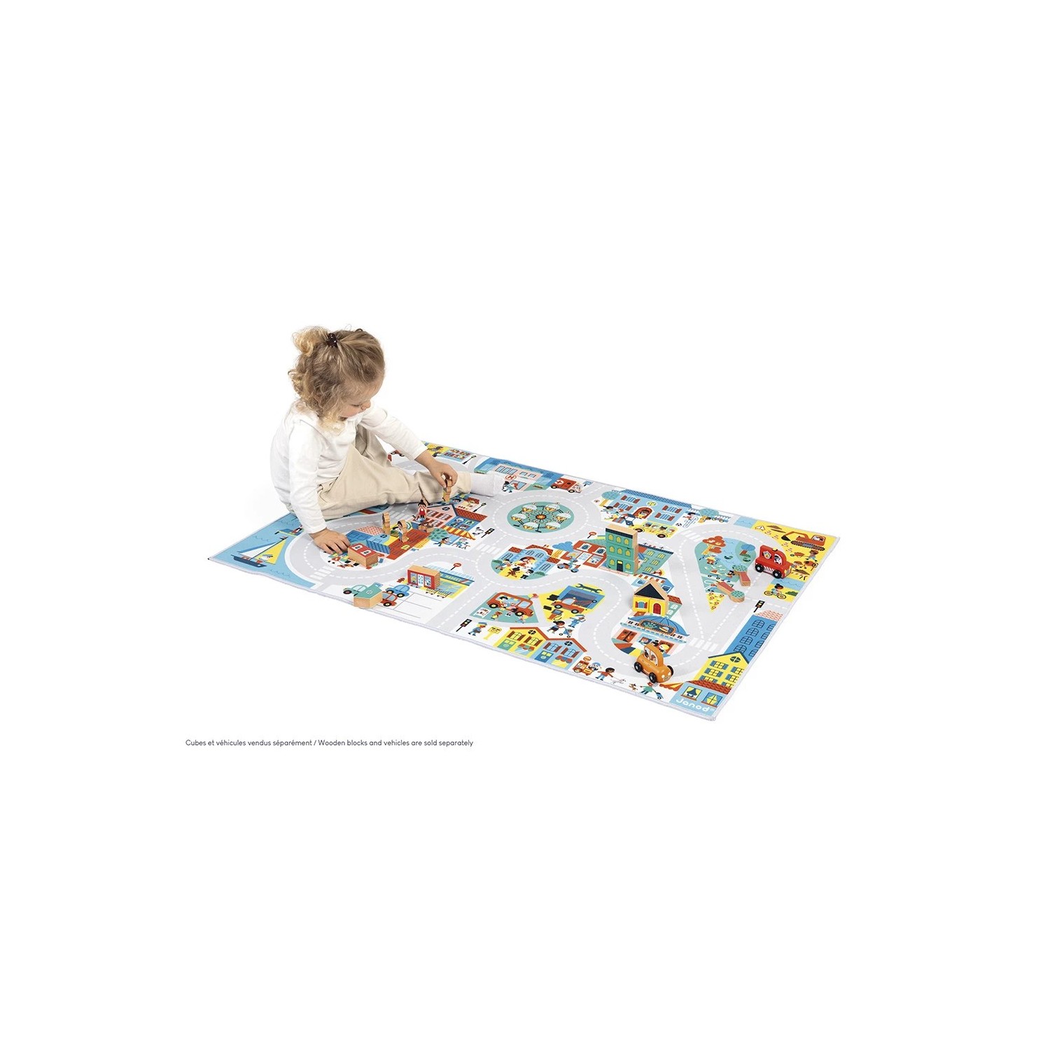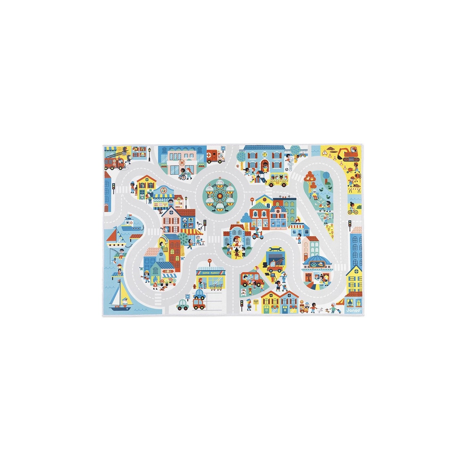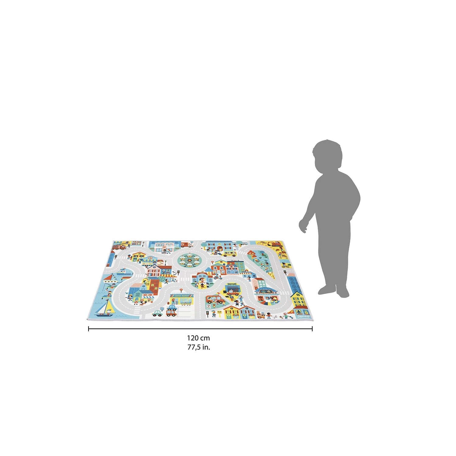 ¡Bienvenido a la ciudad! En este colorido y animado escenario urbano, ¡cada esquina esconde una sorpresa! Esta alfombra de ciudad es adecuada para niños a partir de 2 años. Tiene una calle larga y ancha, ¡para que puedan explorar todos los barrios e imaginar un sinfín de historias! En su alfombra de juegos con circuito, los pequeños se divertirán cruzando cruces y rotondas en busca de objetos ocultos, como en un juego de buscar y encontrar. Podrán descubrir dónde está el cartero, los transeúntes que pasean a su perro o los recién casados en la explanada del ayuntamiento...