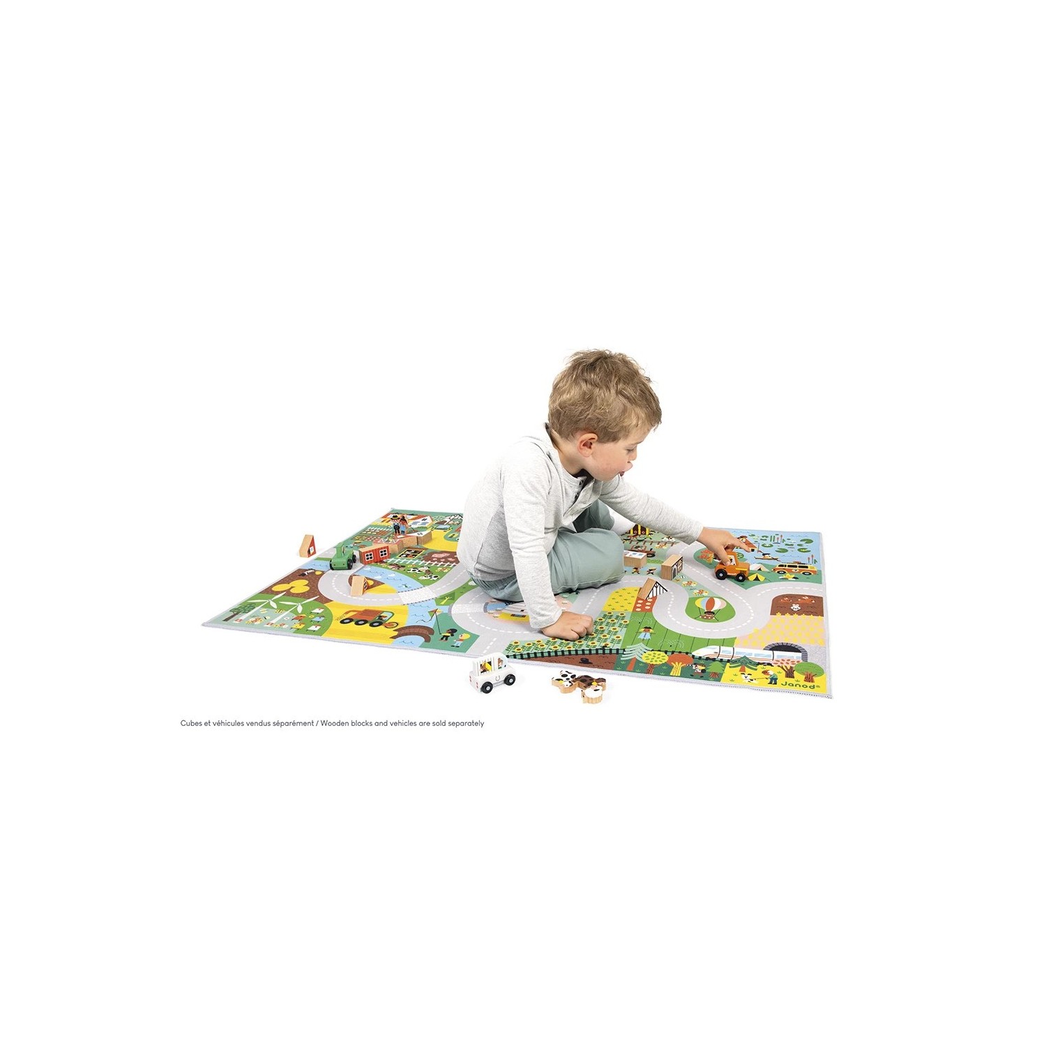 Con su alfombra de tela, los niños pueden desarrollar su imaginación y su vocabulario, así como su sentido de la observación. Los más pequeños podrán incluso descubrir los colores y los números del 1 al 10. Otra ventaja de esta alfombra de juego infantil es que ¡es antideslizante! Perfecta para hacer rodar los coches de juguete, o simplemente para los pequeños a los que les gusta estar en movimiento. En su formato de 120 x 78 cm, esta alfombra para dormitorios infantiles ofrece otras posibilidades de juego con sus accesorios (se venden por separado): puede completarse con una gama de vehículos y bloques de madera, también de nuestra gama Cross Roads. También puedes unir esta alfombra granja con otras alfombras de la colección para crear una zona de juego gigante y ampliar las aventuras de tus hijos. Los circuitos están diseñados para unirse por los 4 lados de la alfombra. ¿Por qué no montar la tienda esta noche?