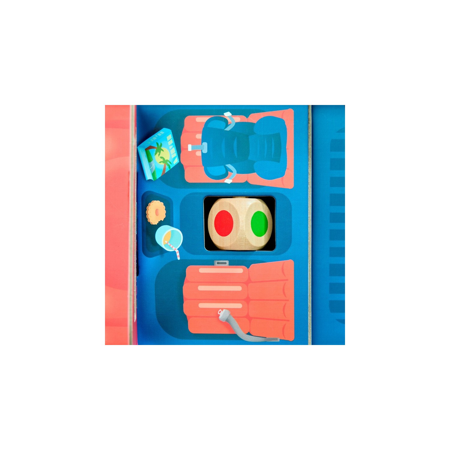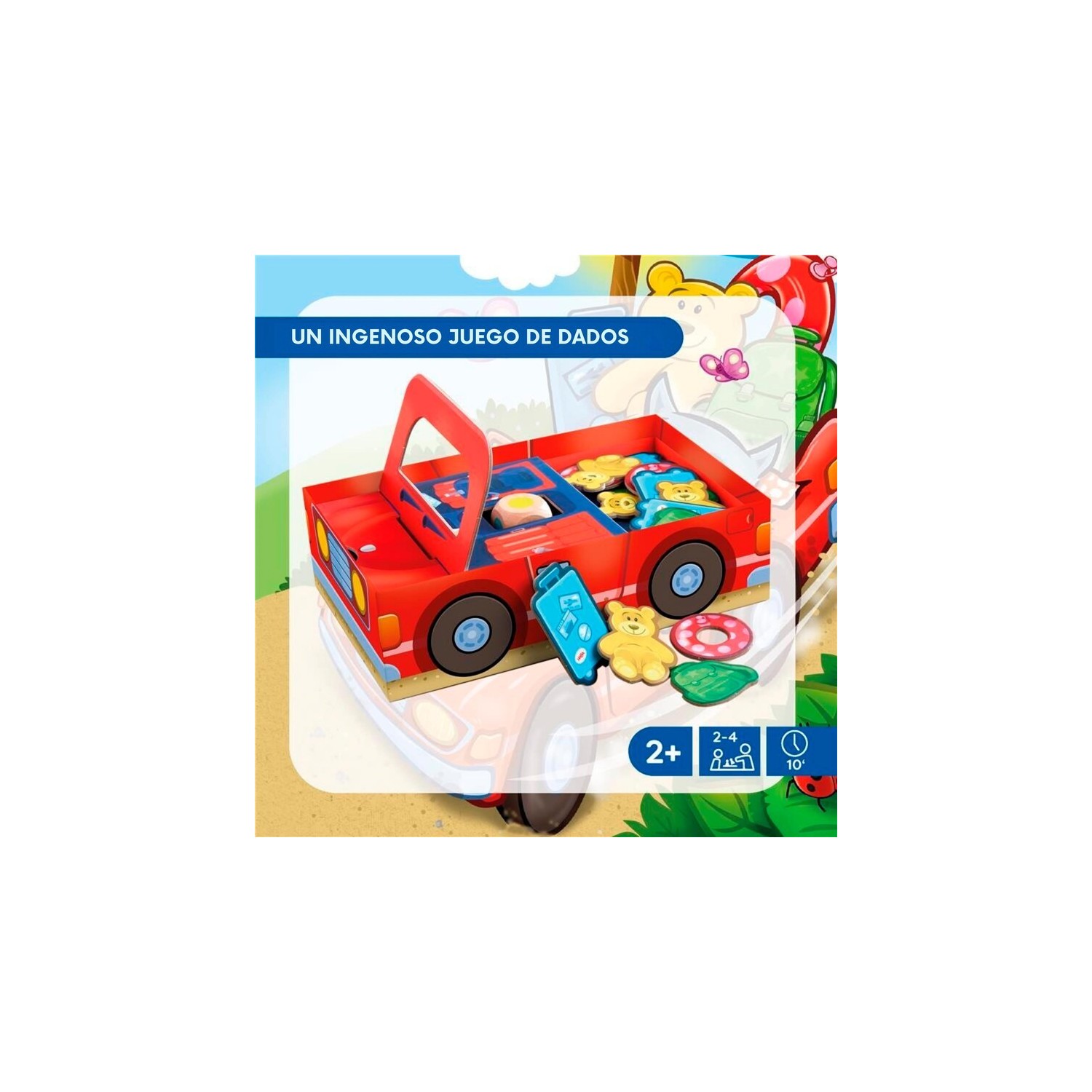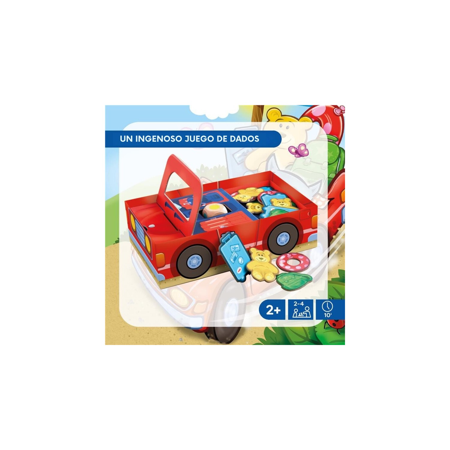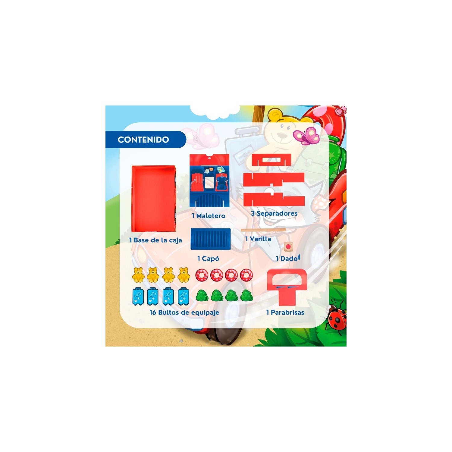 CONTENIDO: 1 base de la caja, 3 separadores, 1 capó, 1 maletero, 1 parabrisas, 16 bultos de equipaje (4 maletas, 4 mochilas, 4 flotadores, 4 ositos de peluche), 1 varilla, 1 dado, 1 instrucciones
