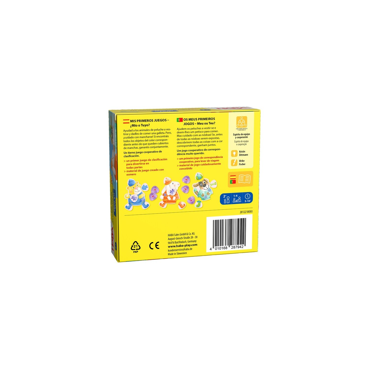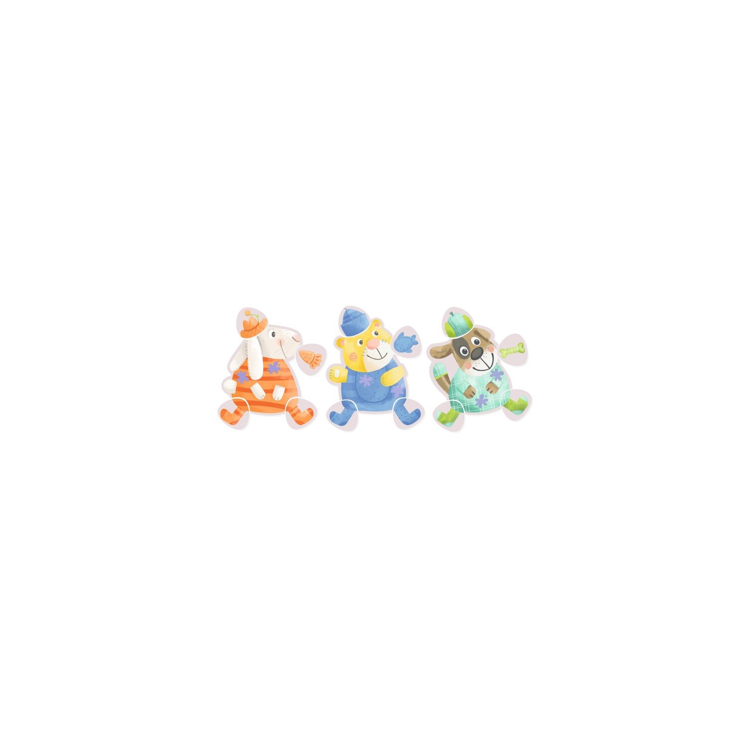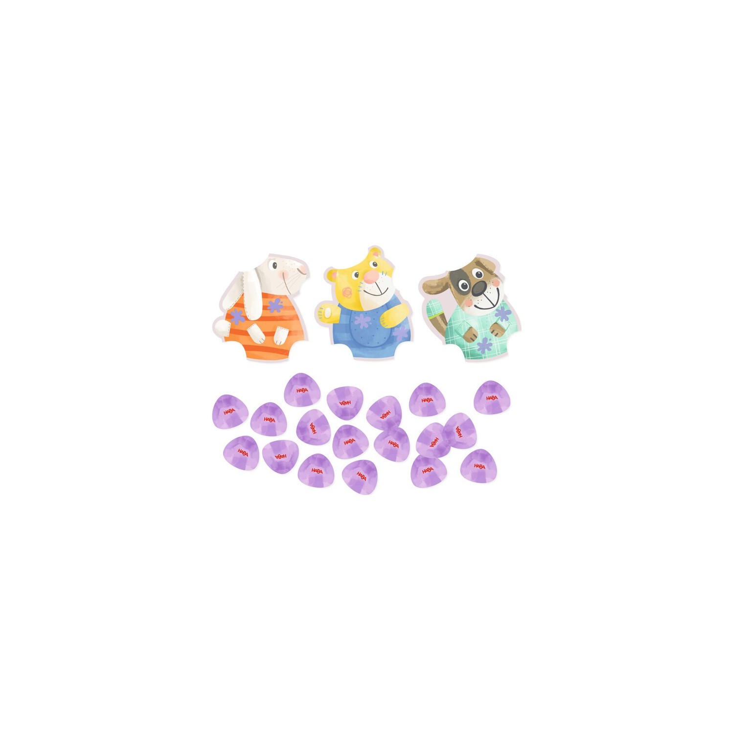 CONTENIDO: 3 animales de peluche (liebre, perro y oso), 18 fichas (12 de ellas con objetos y 6 con manchas) y 1 instrucciones del juego