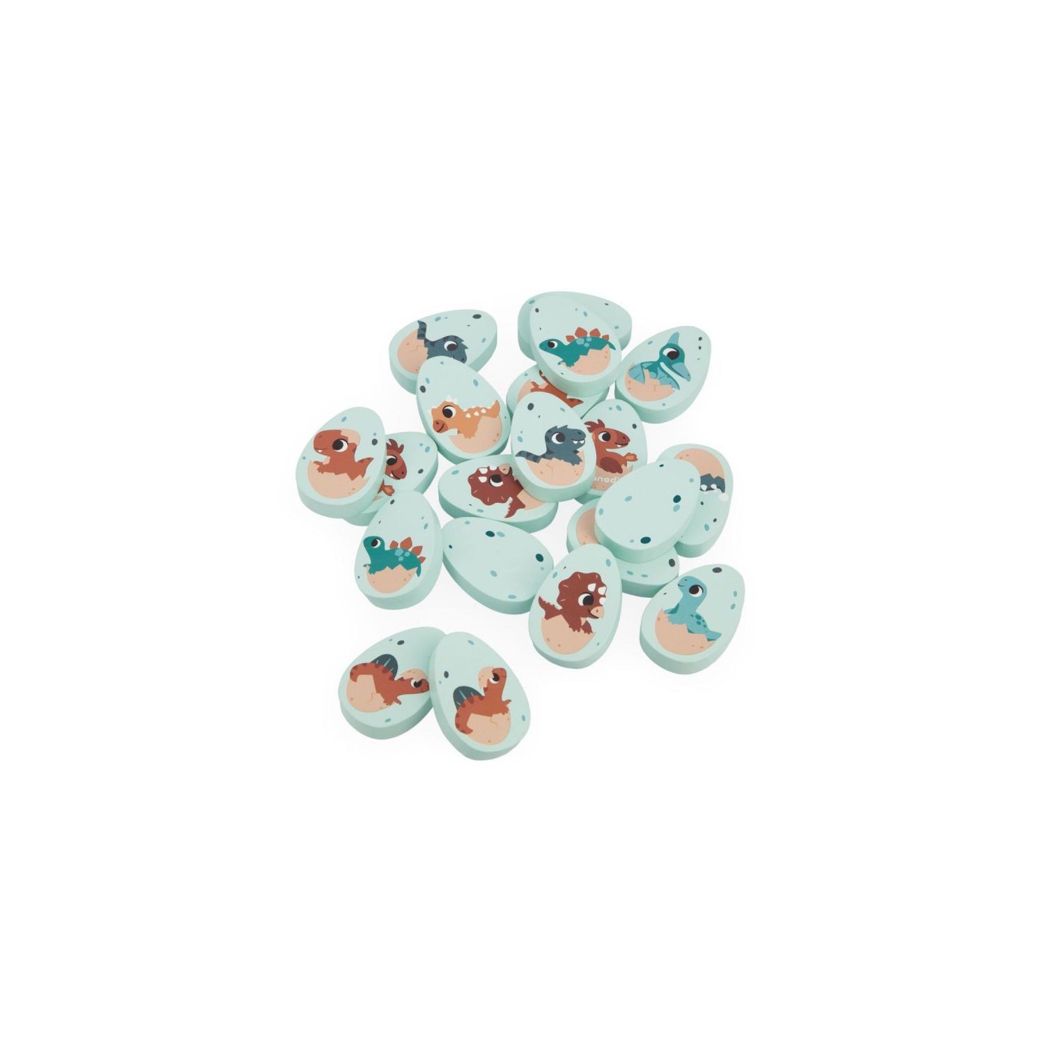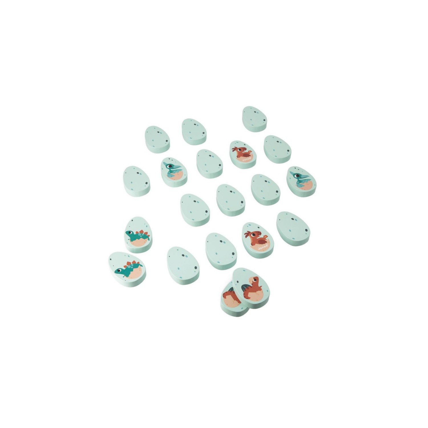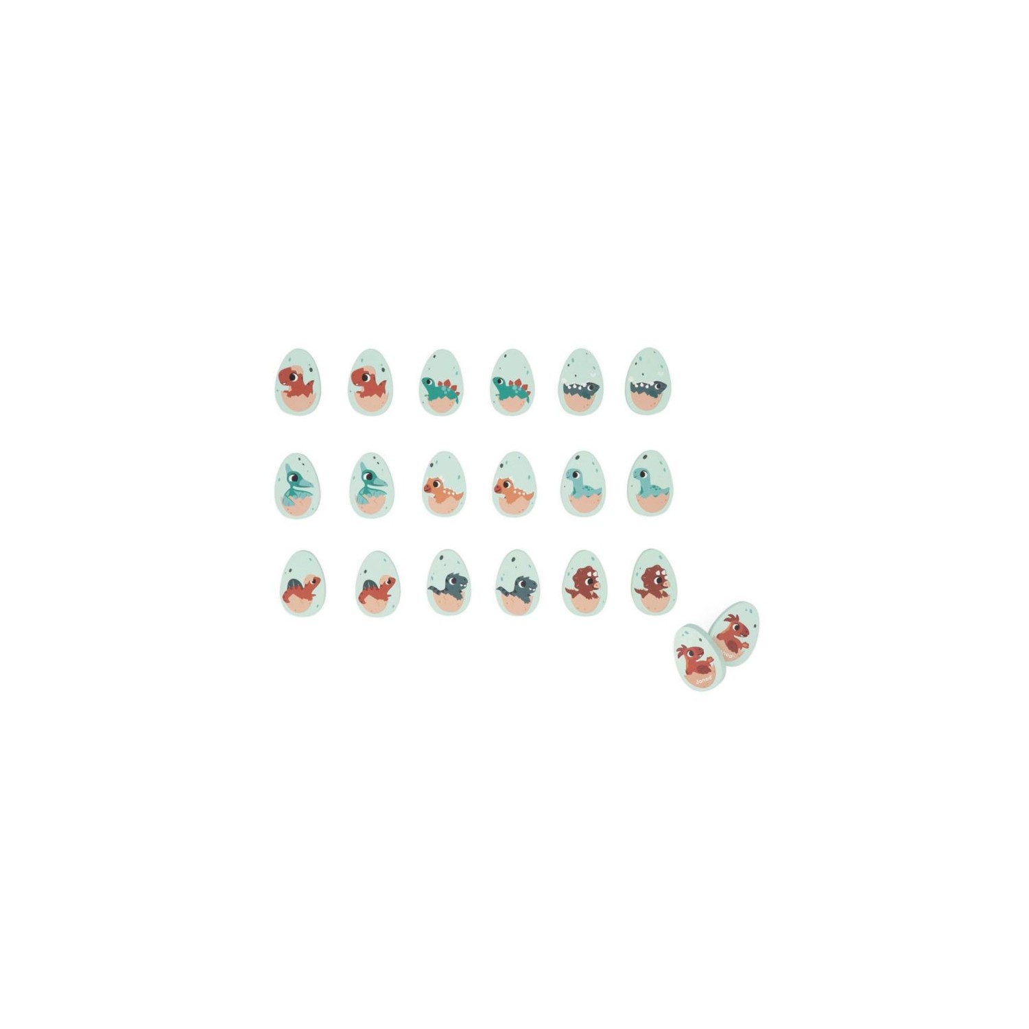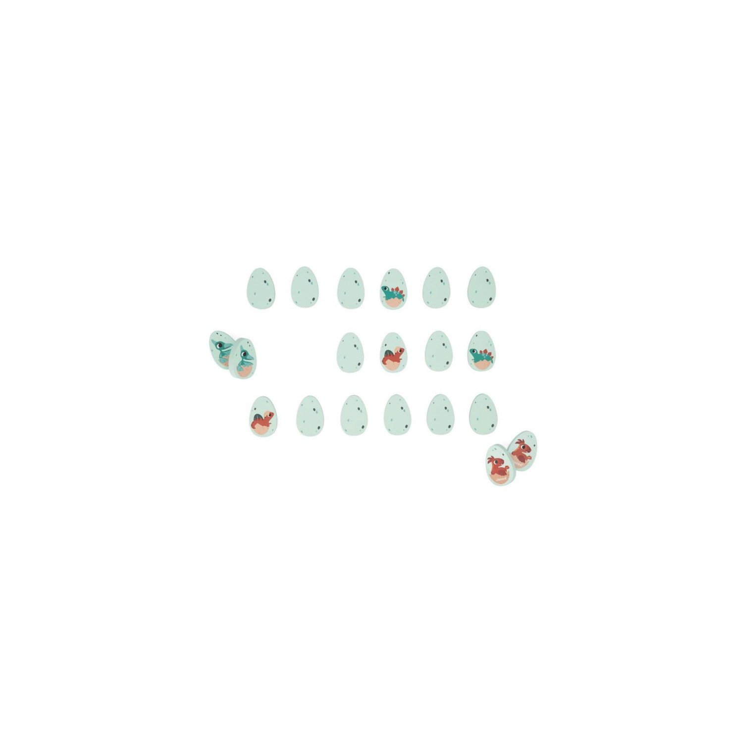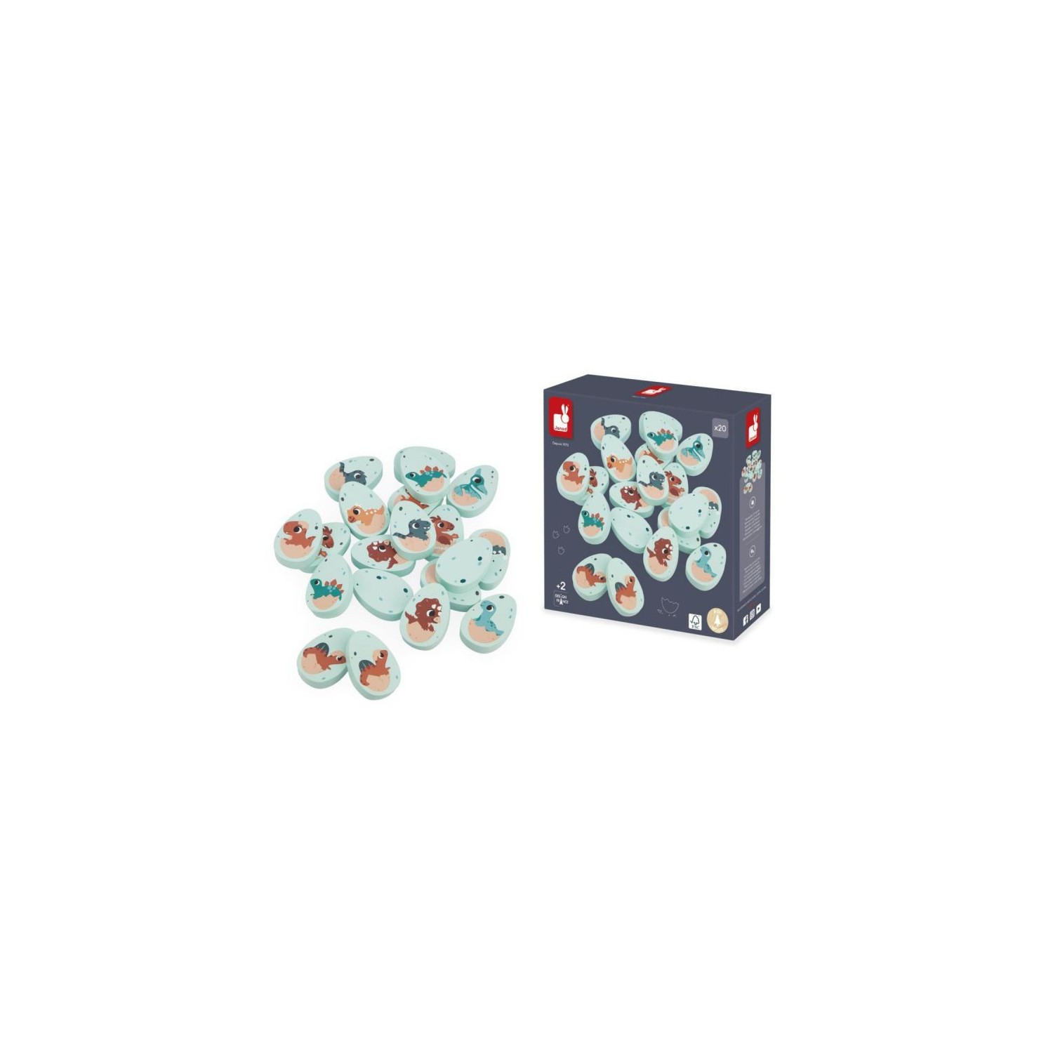 ¡Dinosaurios en apuros! ¿Quién va con quién? Las crías de dinosaurio se han mezclado y hay que juntarlas por parejas. Este set está compuesto por 20 huevos de madera ilustrados con diferentes dinosaurios. Da la vuelta a los huevos uno a uno para encontrar dos idénticos. Ideal para desarrollar la memoria y la destreza. Juguete de madera FSCTM. Para niños a partir de 2 años.
