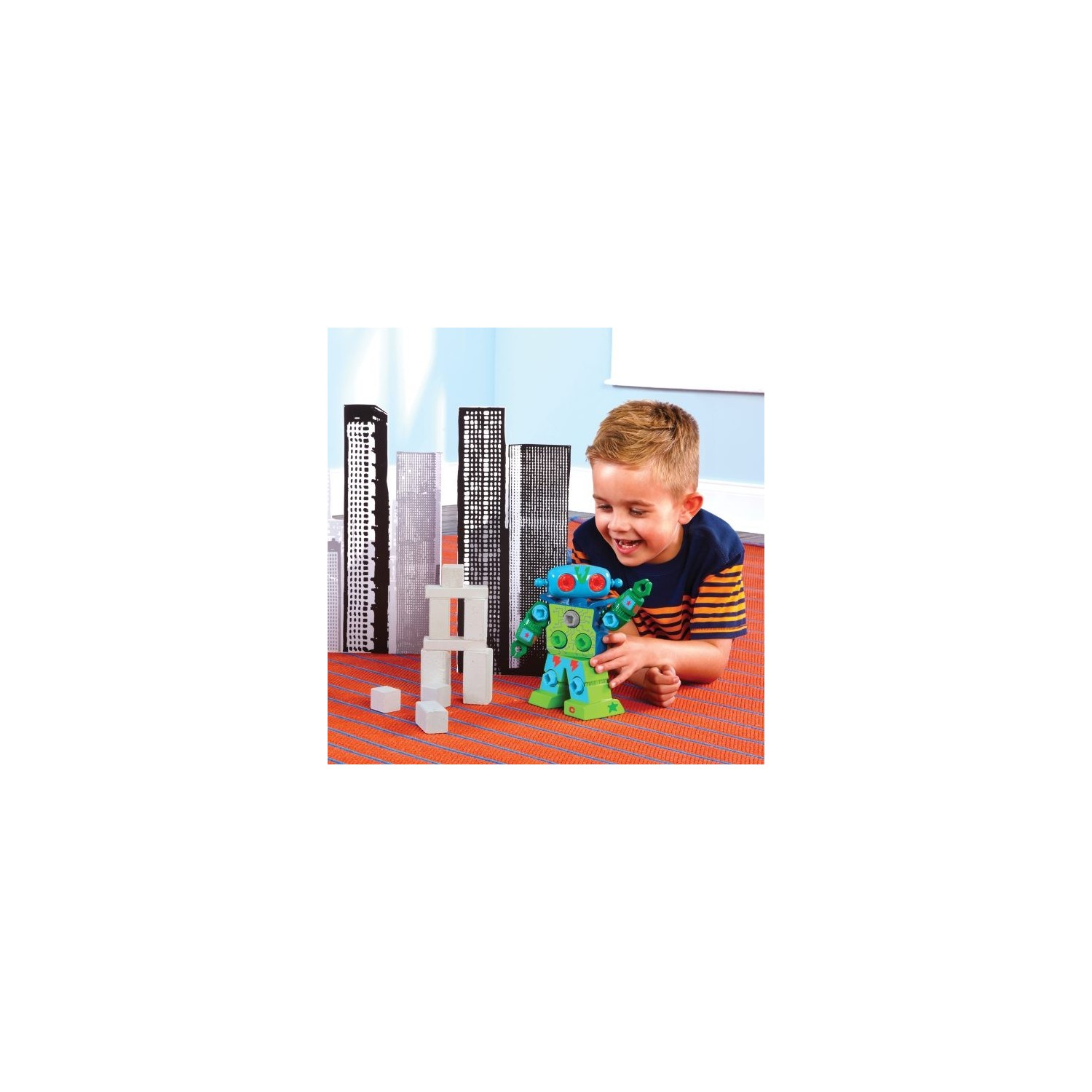 Robot de Design & Drill de Learning Resources. Los pequeños podrán crear su propio robot con este set lleno de colores con el que pueden combinar construcción y creatividad. Con el destornillador de juguete, los niños enroscarán los tornillos de colores en el resistente cuerpo del robot. Además, podrán personalizar sus robot con los adhesivos incluidos. Una vez montado, los brazos, la cabeza y el torso del robot pueden moverse, ideal para actividades imaginativas. El set puede usarse una y otra vez, lo único que hay que hacer es desenroscar los tornillos y empezar de nuevo. El set incluye un robot, 15 tornillos de colores, destornillador de juguete y lámina con adhesivos. El robot mide 20 cm de altura. Idóneo para niños de 3+ años de edad
