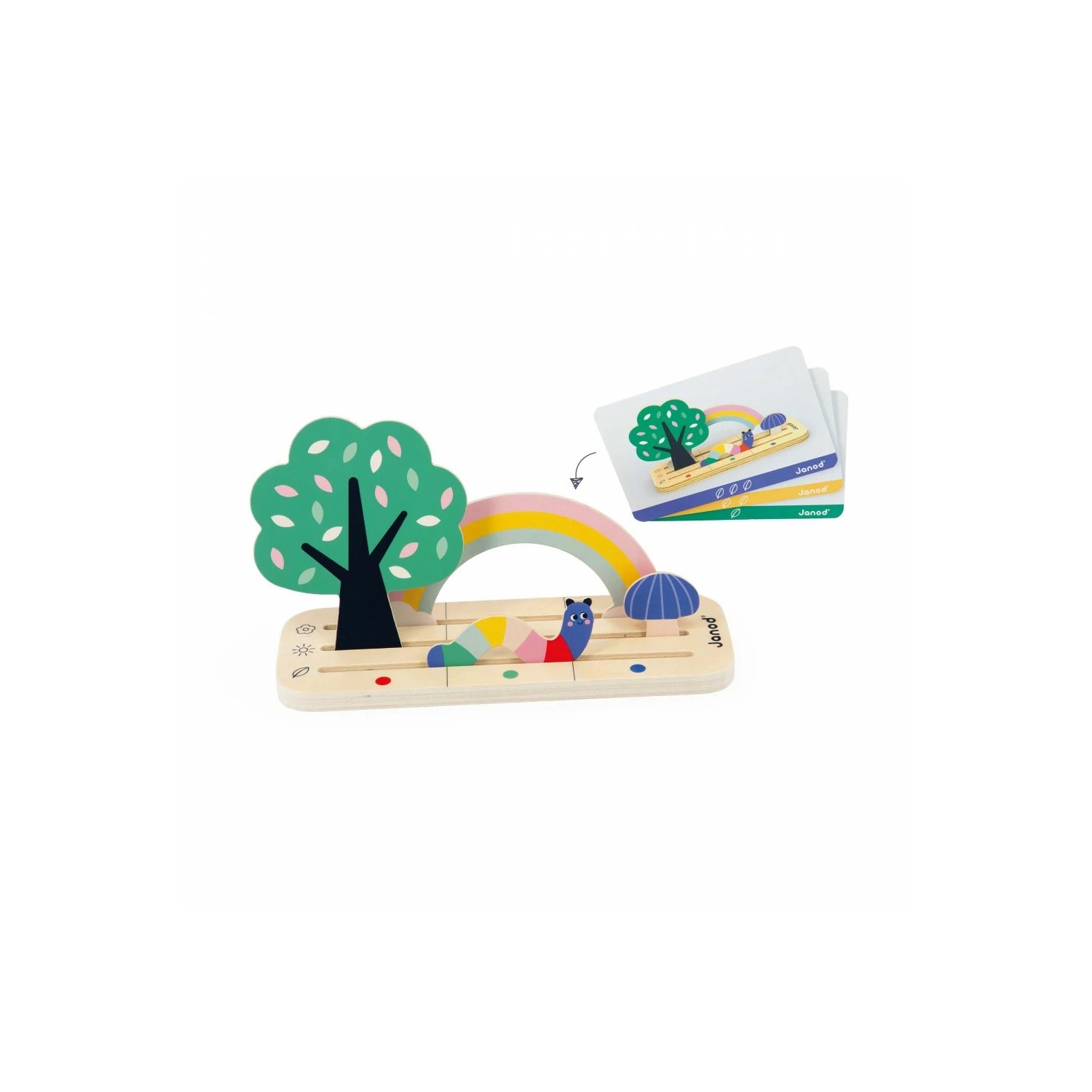 Hay 3 niveles de dificultad representados por los colores de las cartas. A medida que juegue, el niño irá pasando de colocar 2 elementos a 5. El niño puede jugar de forma autónoma o con un adulto que puede ir describiéndole la escena del jardín que debe replicar. ¡Es muy práctico! Los puntos de colores que hay en el soporte de madera y en las cartas de modelo ayudan al niño a orientarse. ¡Este juego educativo de madera además es muy bonito! ¡A los niños les encantará descubrir y manipular los adorables animalitos y los coloridos elementos del jardín! Gracias al folleto explicativo, podrás utilizar de la mejor manera posible este juego para niños de primero de infantil. Este juguete forma parte de una gama pedagógica diseñada en colaboración con una maestra para ajustarse al máximo a los aprendizajes y programas de cada nivel. Juguete de madera y cartón FSC®.