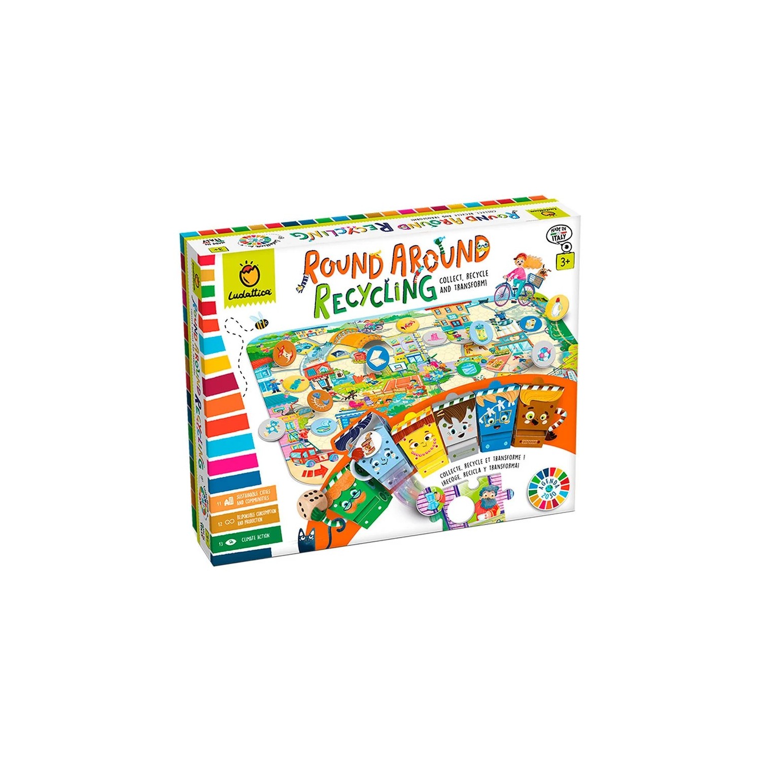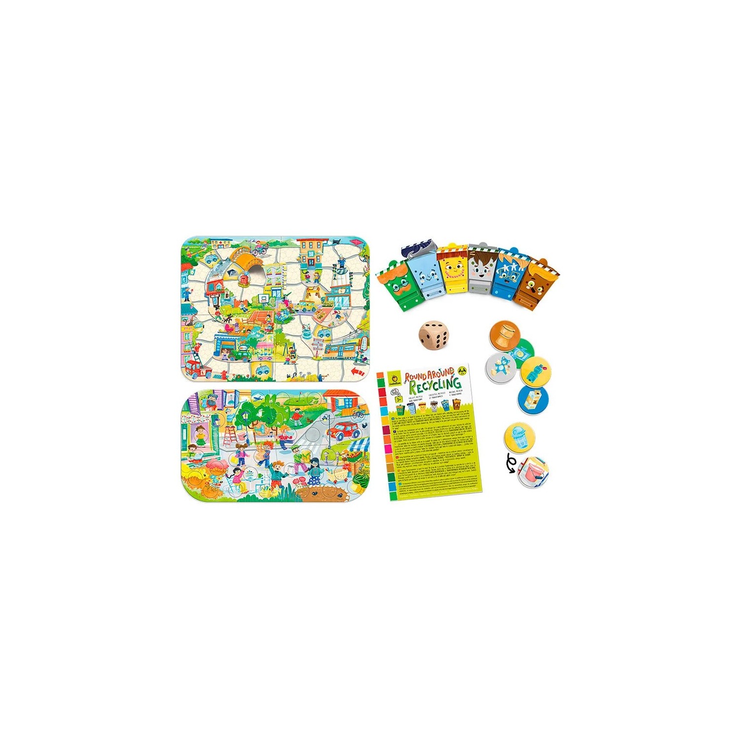 - Contiene: Tablero de ciudad, tablero puzzle de la planta de reciclaje, 6 contenedores 3D, fichas de residuos, dado e instrucciones