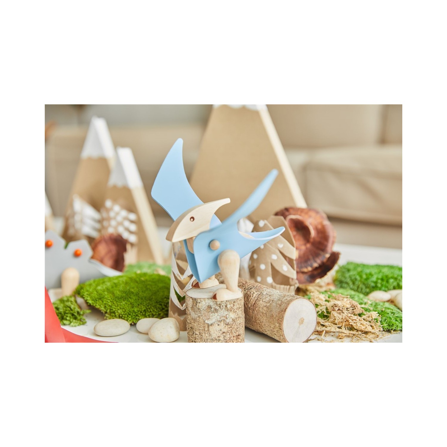 ¡Mira! ¡Es un Pterodactilo! Este dinosaurio volador, conocido como pterosauro puede transformarse en una forma tridimensional combinando variedad de diferentes partes, ambas de goma y madera. Lleva esta transformación más allá añadiendo materiales a tu elección con una pizca de imaginación. Incluye una ficha infográfica para combinar el aprendizaje con el juego