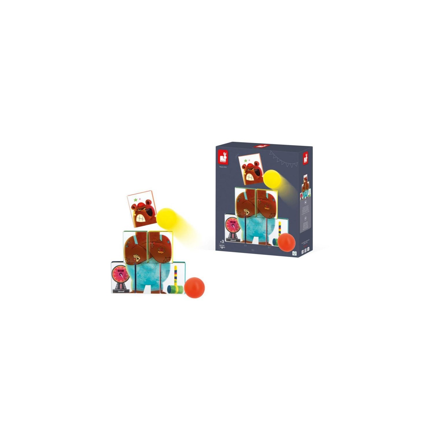 ¿Quién está listo para enfrentarse al Sr. Oso? ¡¡Prueba suerte!! Simplemente derriba todas las cajas con los menos lanzamientos posibles. Set compuesto por 6 cajas metálicas y 2 bolas de espuma. ¡Perfecto para cumpleaños o tardes con amigos! Este juego es ideal para desarrollar la coordinación mano-ojo, así como la motricidad fina. Juguete de metal. Juguete de exterior. Para niños a partir de 3 años.