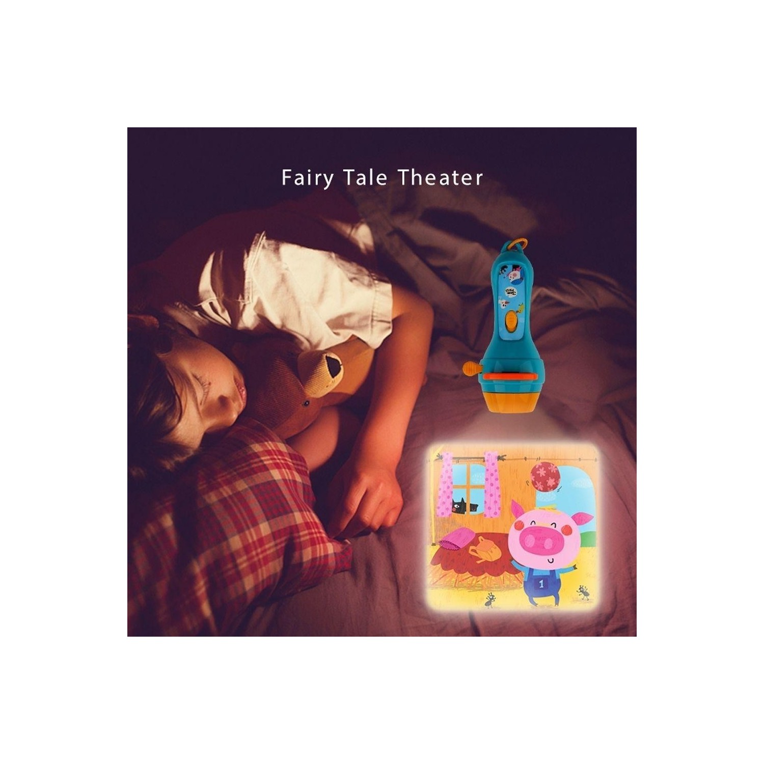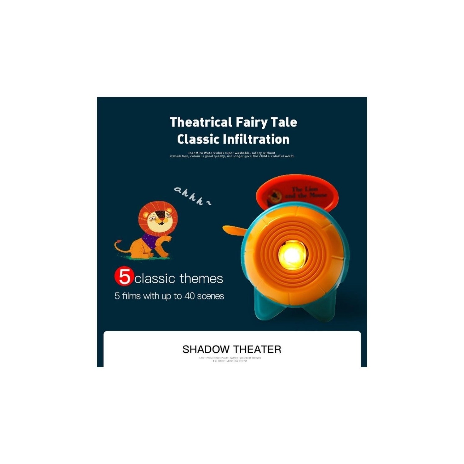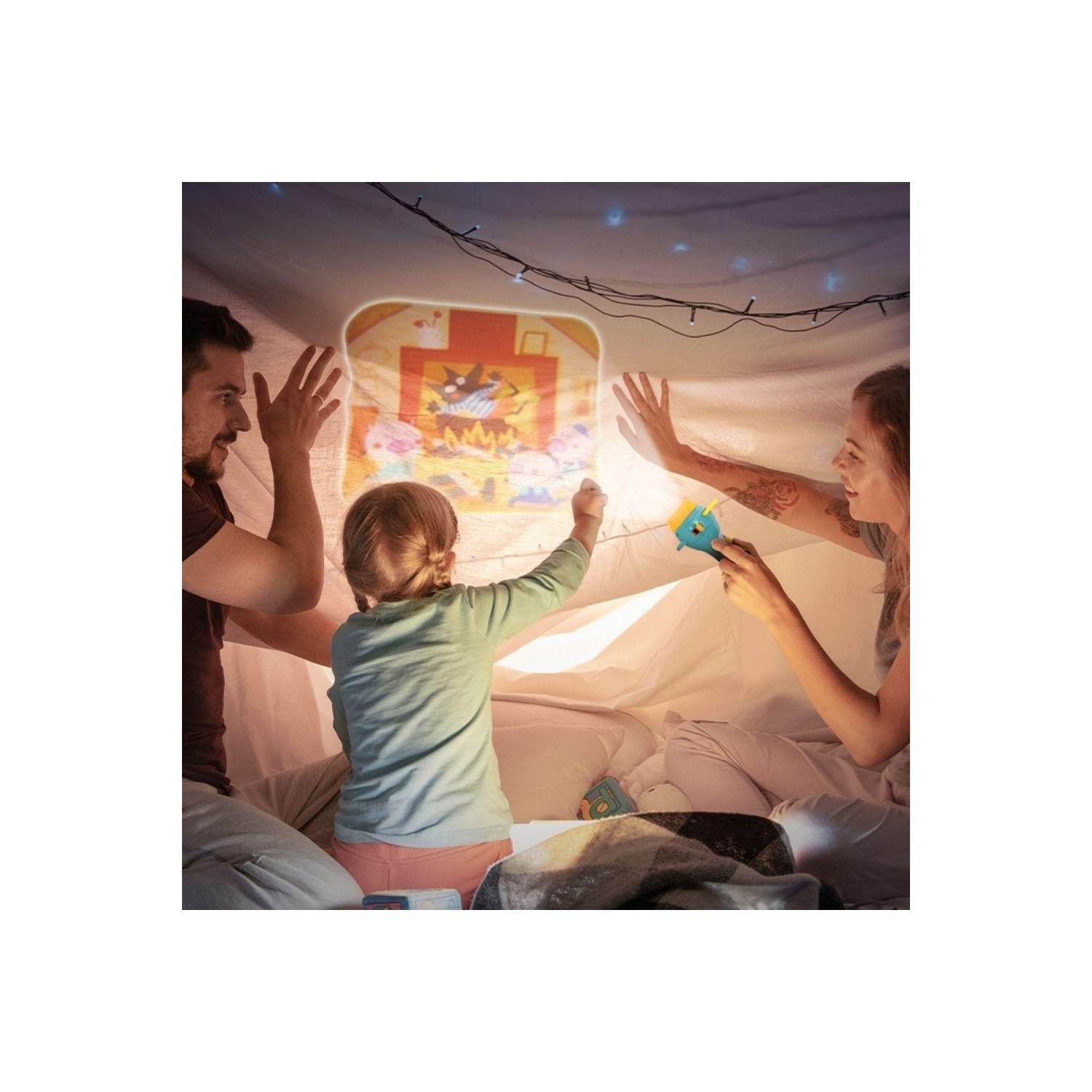 El proyector con linterna permite reproducir distintas historias al insertar los discos de cuentos, proyectando las imágenes sobre la pared o sobre el teatro incluido. Las escenas cobran vida con una luz suave que envuelve el espacio y estimula la imaginación, favoreciendo un ambiente de calma y atención compartida.