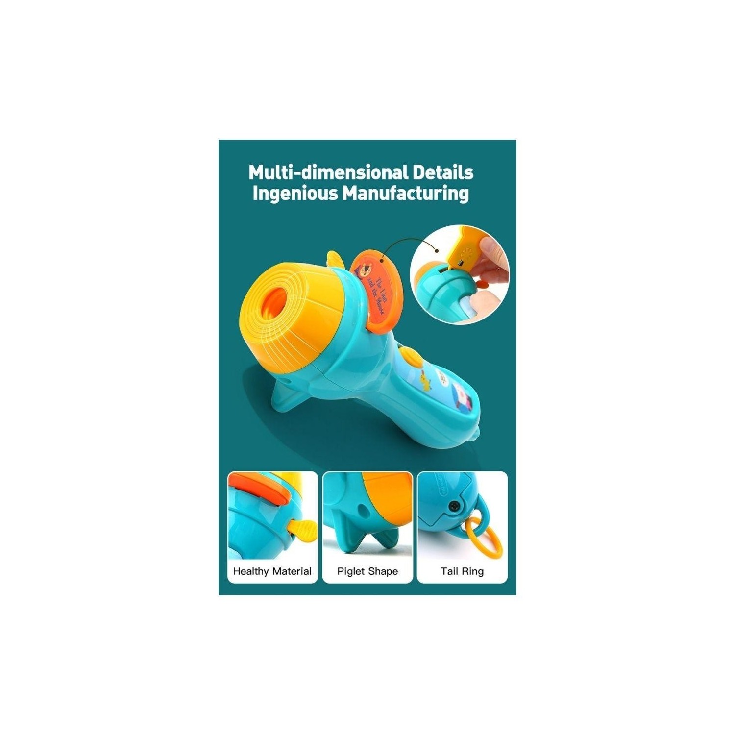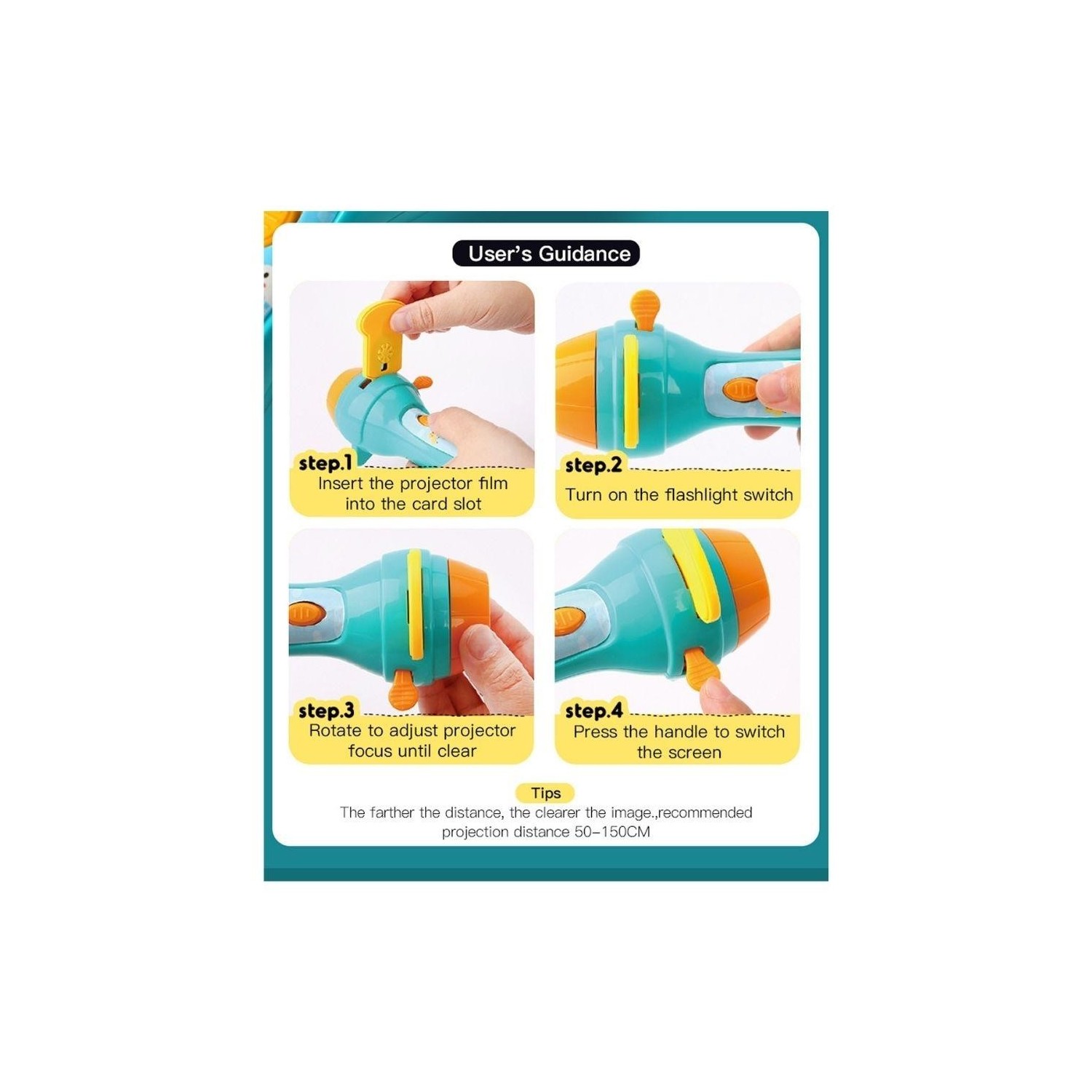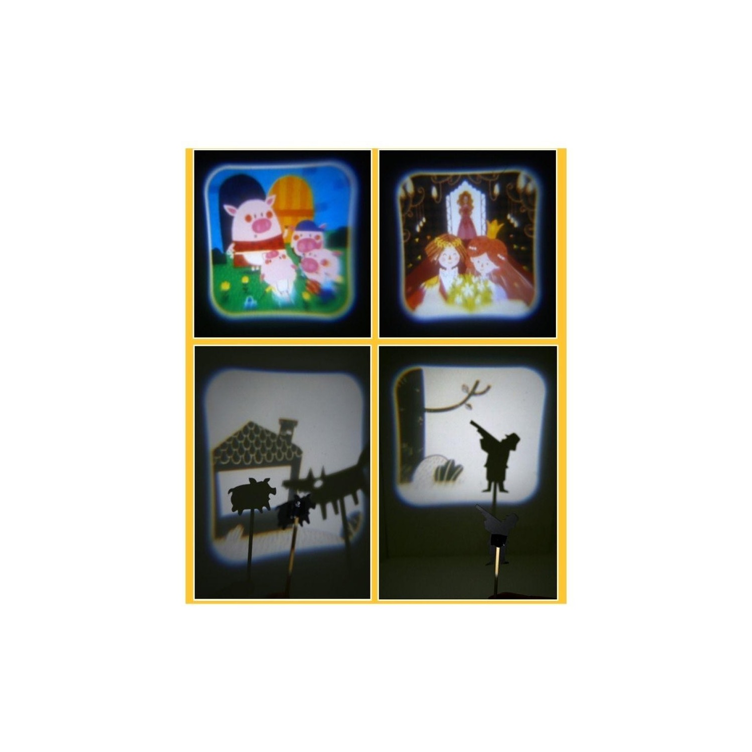 El proyector con linterna permite reproducir distintas historias al insertar los discos de cuentos, proyectando las imágenes sobre la pared o sobre el teatro incluido. Las escenas cobran vida con una luz suave que envuelve el espacio y estimula la imaginación, favoreciendo un ambiente de calma y atención compartida.
