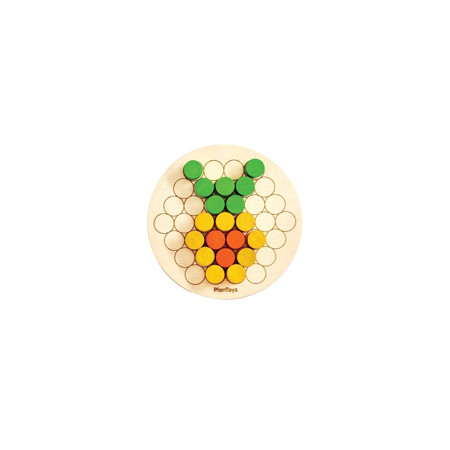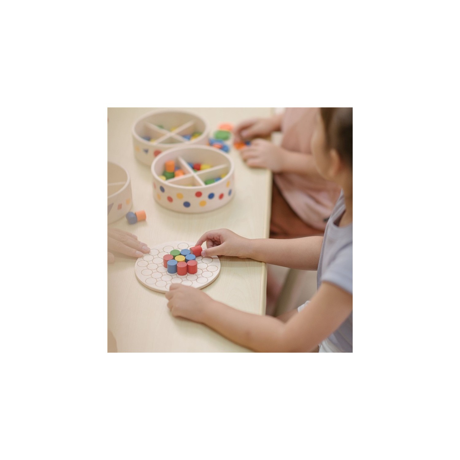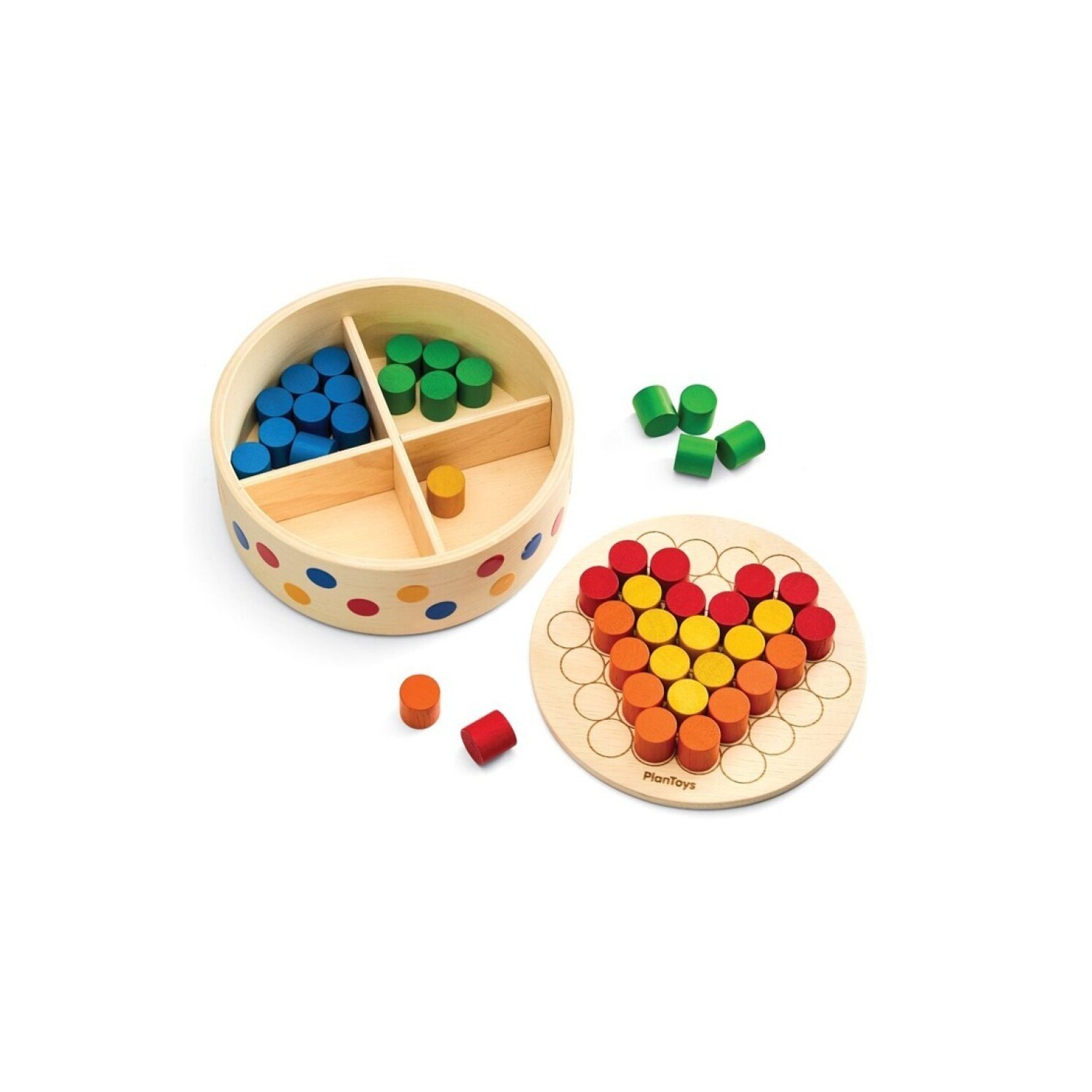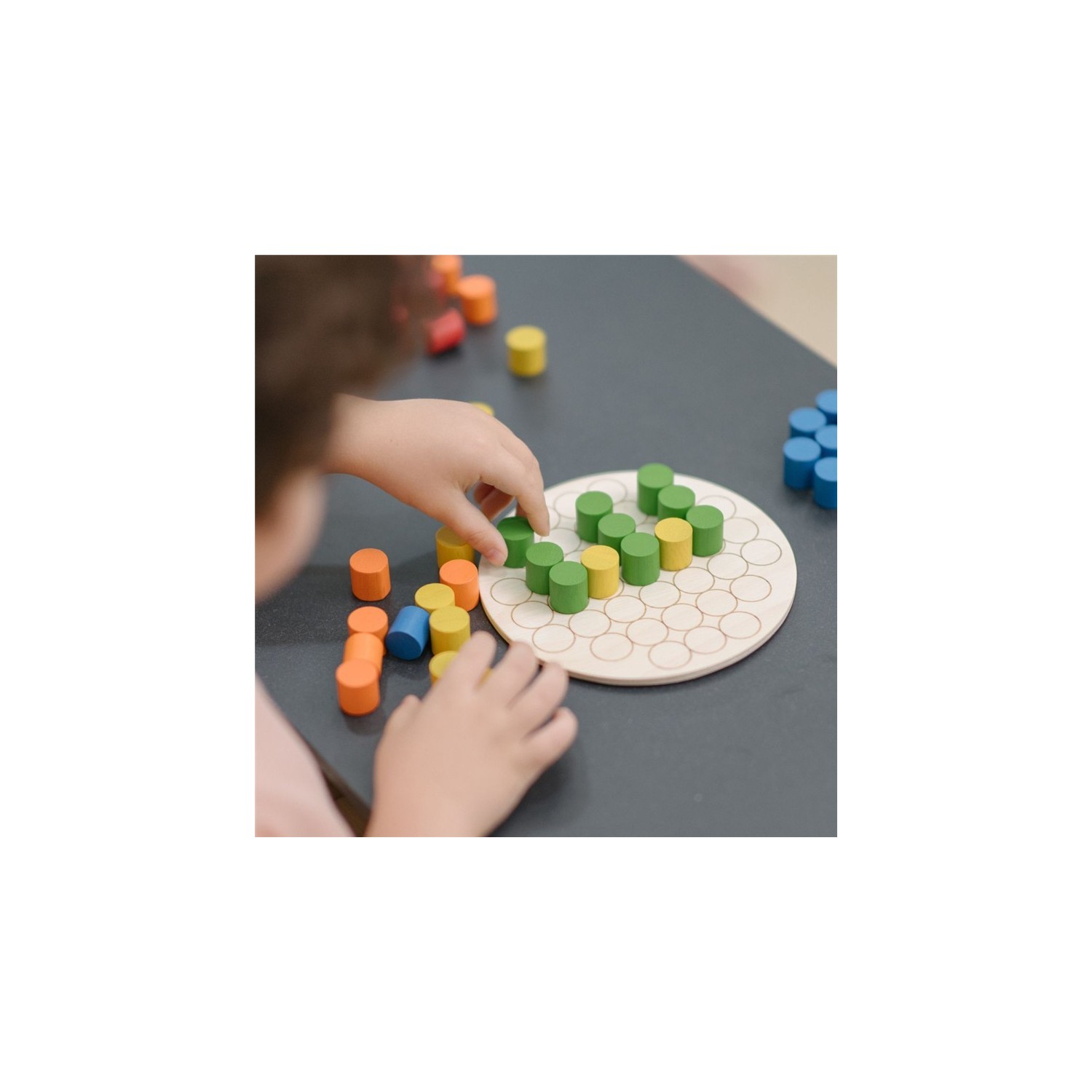 Las guías circulares del tablero facilitan la colocación precisa de las clavijas, lo que permite a los niños diseñar libremente, seguir patrones, clasificar por color y practicar el conteo y conceptos matemáticos básicos. También funciona como caja de almacenamiento para facilitar la organización. El juego incluye: un tablero redondo de madera con 37 ranuras grabadas con láser (en ambos lados) y 45 clavijas de colores (9 de cada uno en rojo, azul, verde, amarillo y naranja).
