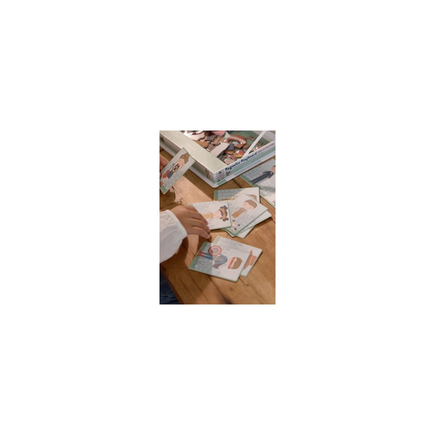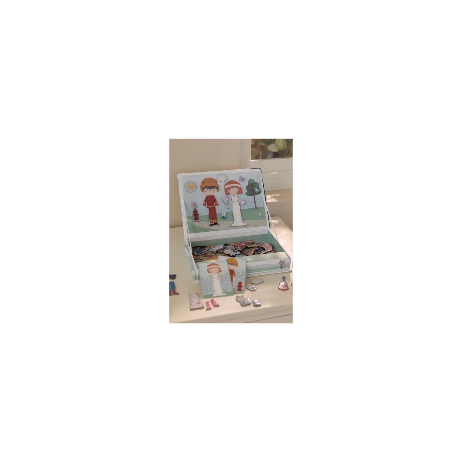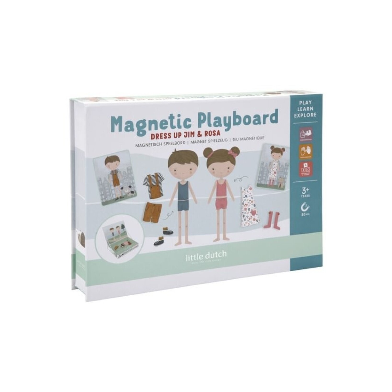 ¡Juega a disfrazarte con Jim & Rosa! Con este puzle magnético puedes copiar los atuendos de las cartas en el tablero con piezas magnéticas. O usar tu propia fantasía. Hay un sinfín de combinaciones que garantizan mucha diversión mientras fomentan el vocabulario y la coordinación. Para jugar en casa, pero también de viaje.Incluye 80 imanes pequeños, 6 tarjetas para Rosa y 6 para Jim. La caja está hecha de cartón resistente para un fácil almacenamiento de todos los artículos y la tapa magnética funciona como tablero de juego .