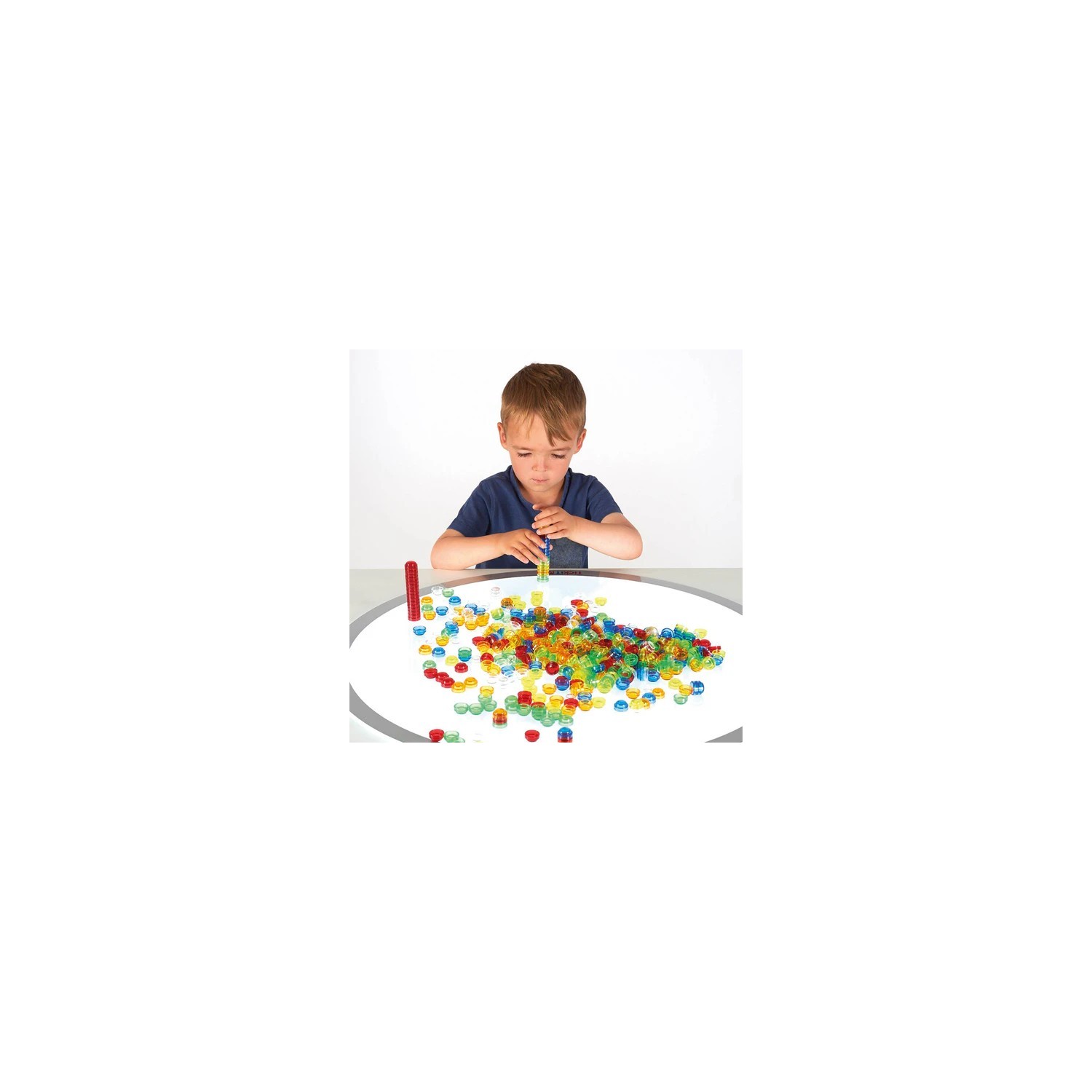 Los mostradores apilables translúcidos tickit ® son un conjunto de mostradores acrílicos de colores que se apilan fácilmente para que su hijo pueda crear torres translúcidas vibrantes.