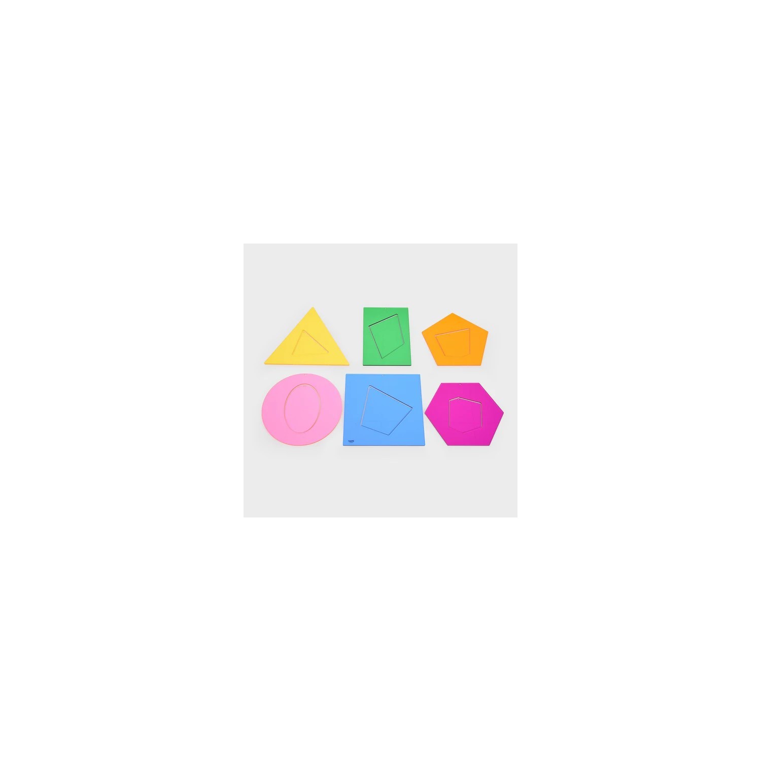Las piezas interiores y exteriores del rompecabezas coinciden, por su color y sus atributos, por ejemplo, los hexágonos morados tienen cada uno 6 lados; la forma irregular encaja dentro de la forma regular para reforzar la comprensión de que ambas formas siguen siendo hexágonos, aunque se ven diferentes. El aprendizaje de extensión es que la suma de los ángulos interiores de una forma regular siempre será igual a la suma de los ángulos interiores de la forma irregular correspondiente.