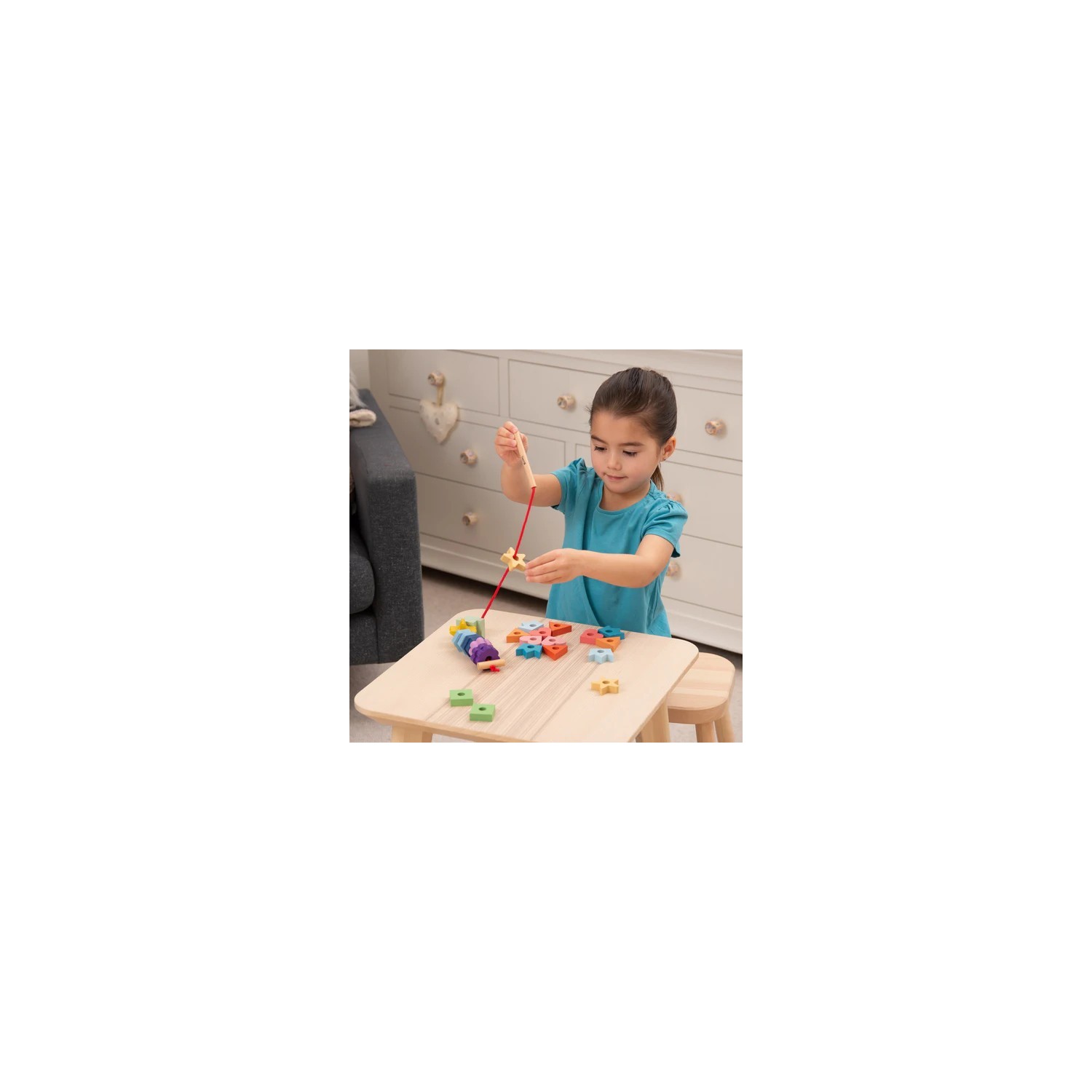 Este conjunto incluye 28 piezas, con cuatro de cada una de las siete formas diferentes. Cada forma está emparejada en un tono claro y oscuro de su color, acompañada de un cordón con un enhebrador de madera y un tapón para mayor comodidad. Las formas corresponden a las de nuestro Apilador de Formas de Madera Arcoíris: flor, hexágono, corona, cuadrado, estrella, triángulo y corazón.