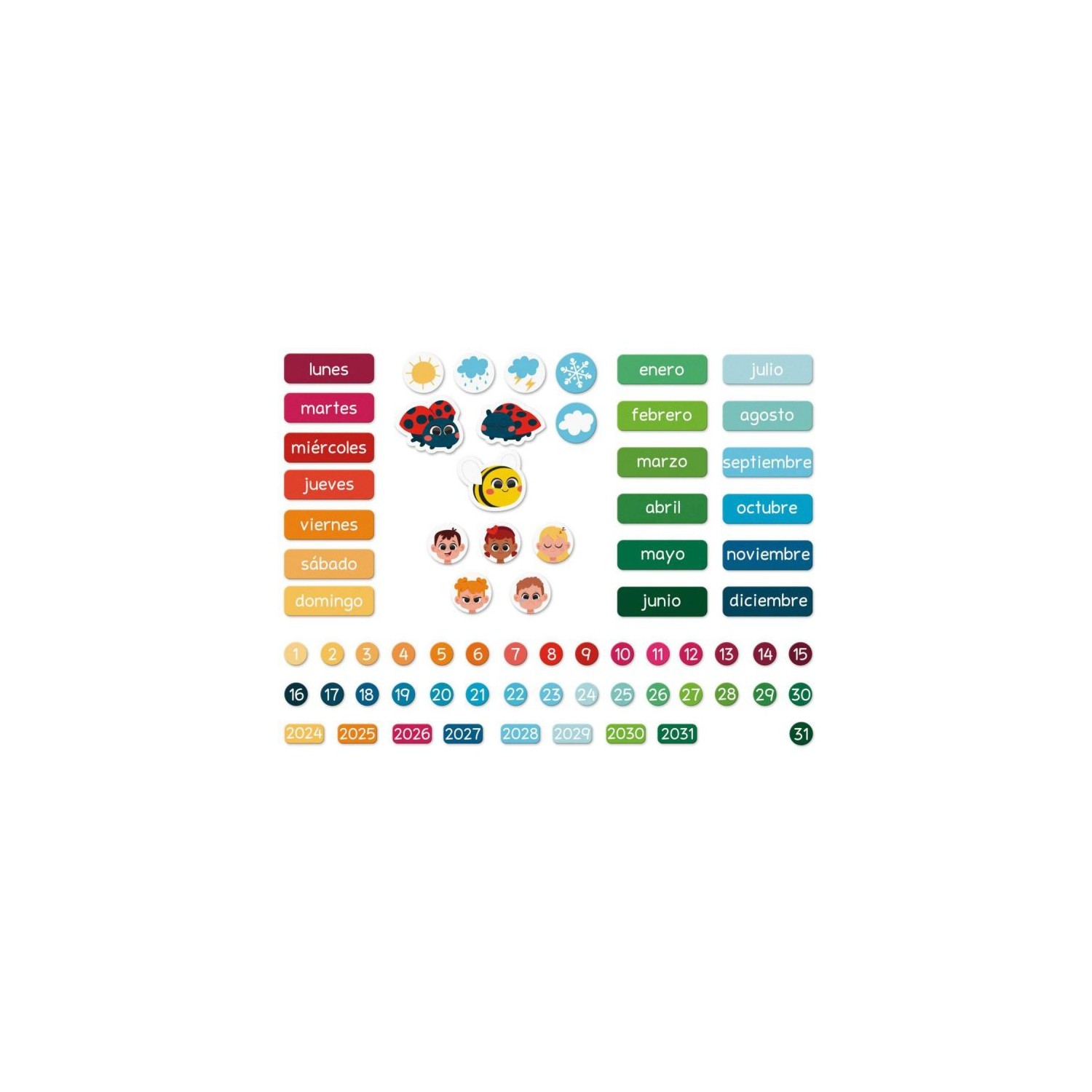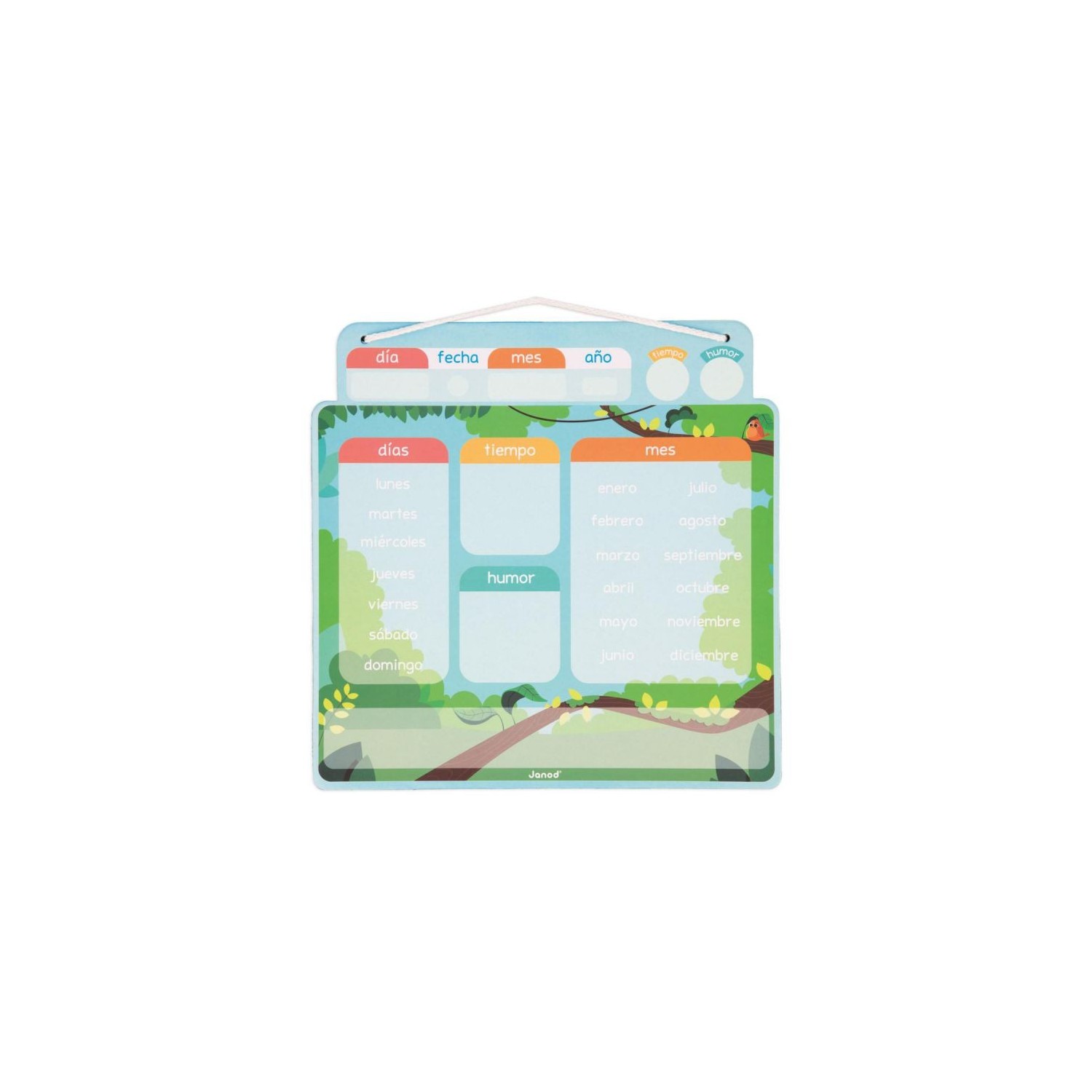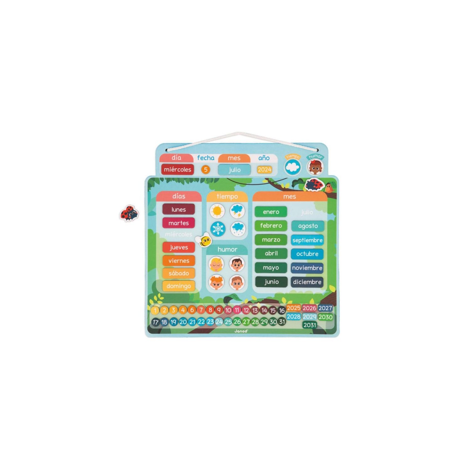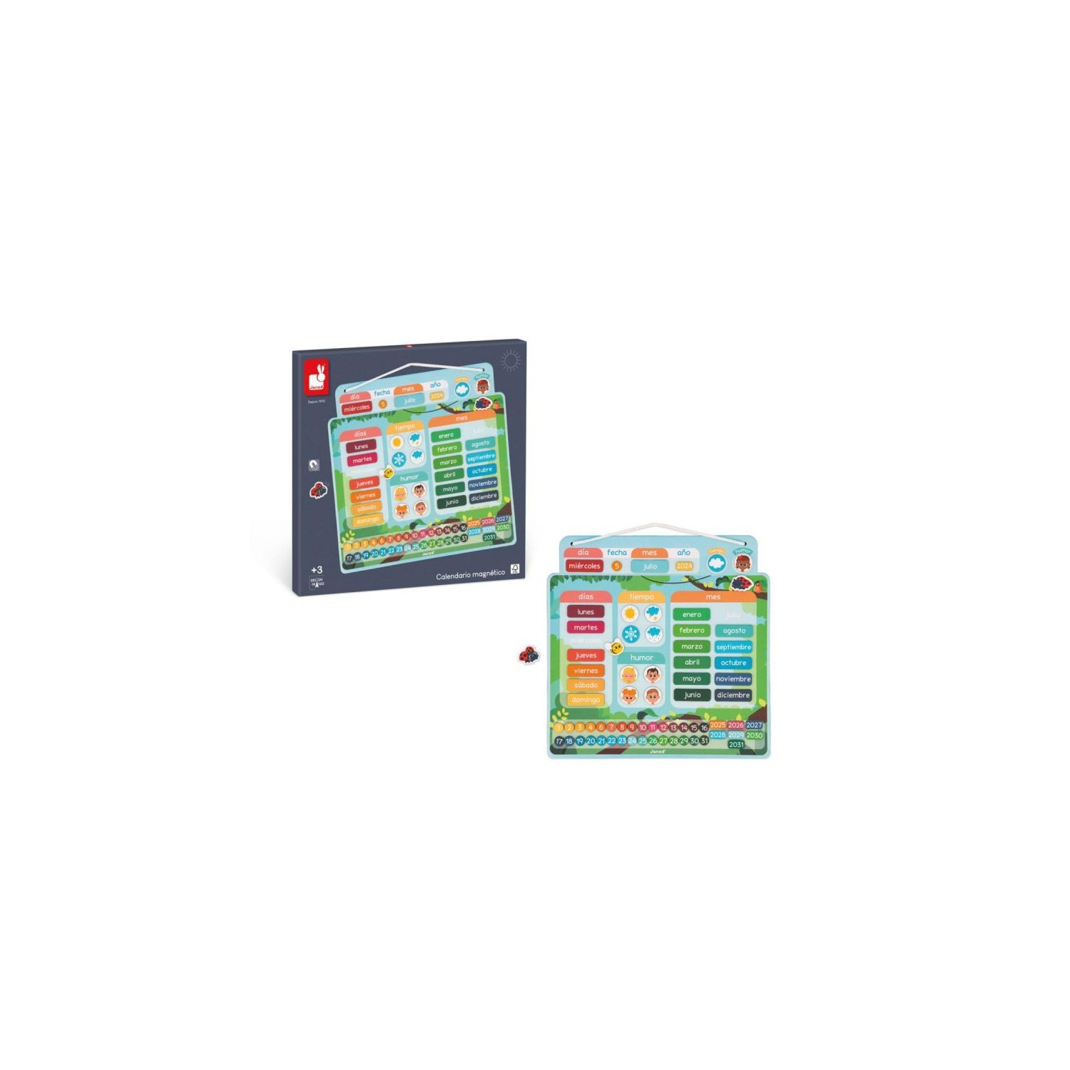 Comienza un nuevo día, ¿qué día es hoy? ¿Qué tiempo hace? Cada día, su hijo disfrutará completando el día, la fecha, el mes, el tiempo meteorológico y su estado de ánimo con este calendario magnético de alegres colores. ¡El calendario está compuesto por una tabla para colgar y 68 imanes para indicar la fecha (día/mes/año) y 3 imanes con forma de animales para divertirse colocándolos en la tabla! Este juguete lúdico y educativo es ideal para que su hijo aprenda a orientarse en el tiempo. Juguete magnético de cartón FSCTM para niños a partir de 3 años.