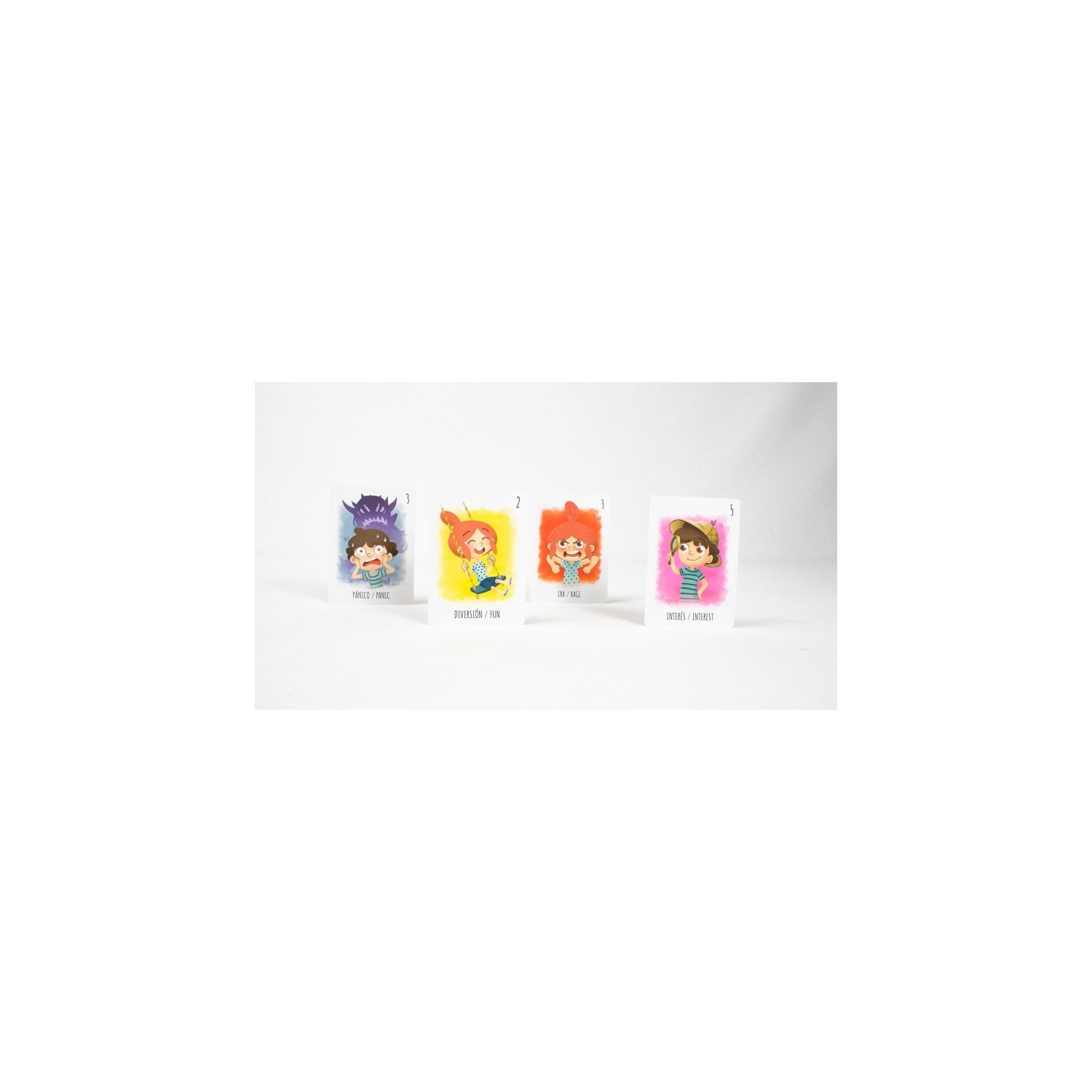 • 40 cartas asociadas a un color según la emoción. Felicidad-verde, Alegría-amarillo, Amor-rosa, Ira-rojo, Tristeza-azul, Miedo-gris y Sorpresa-lila.