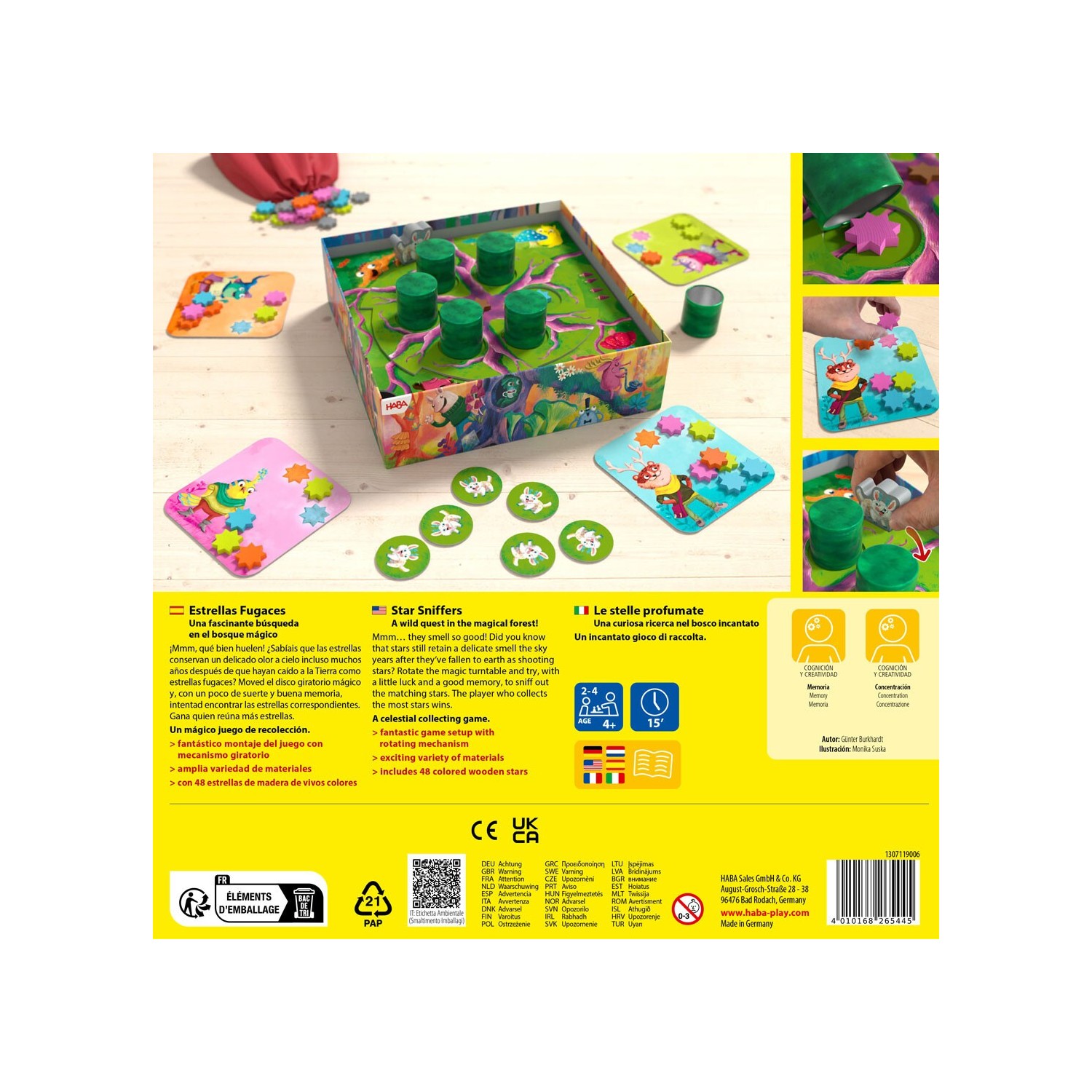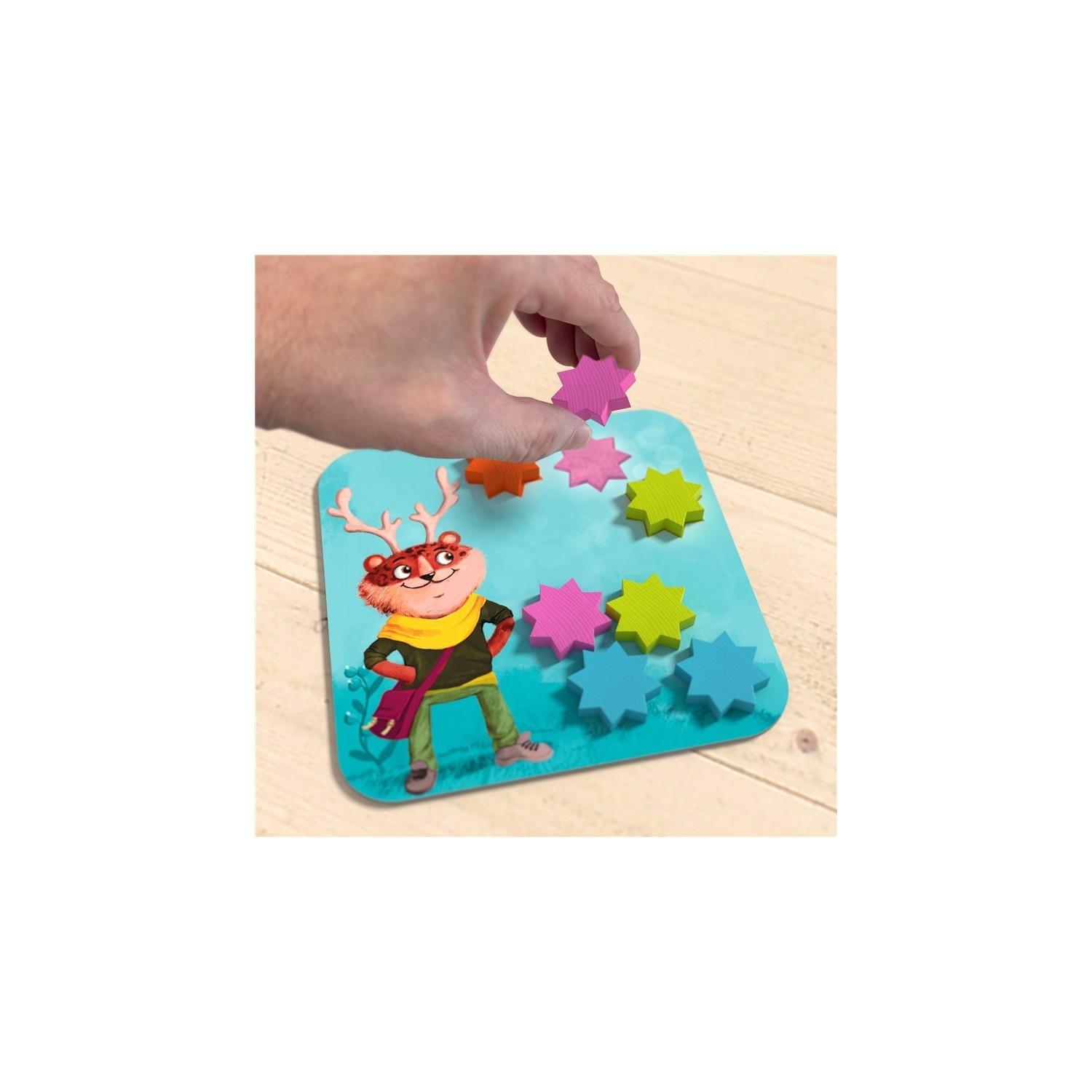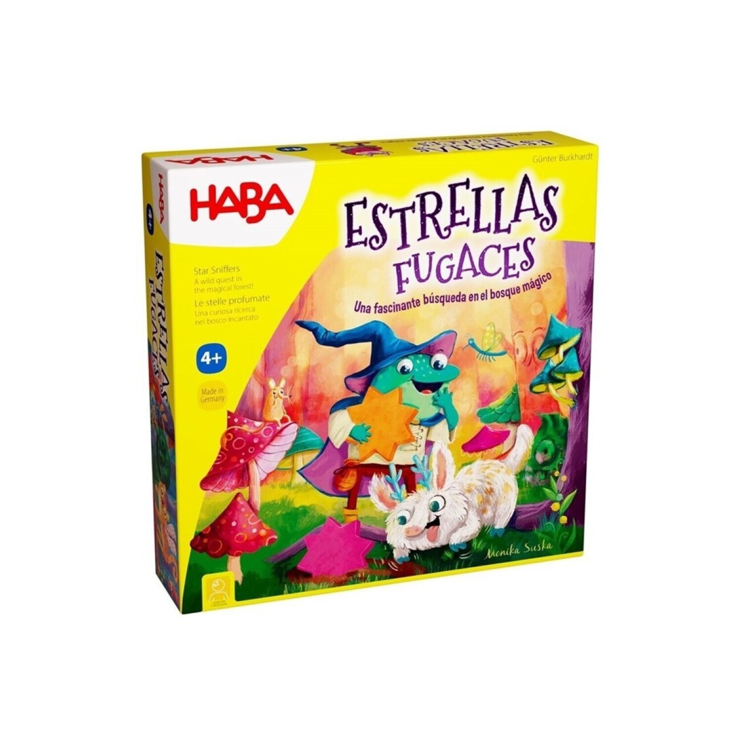 La caja sirve de tablero de juego con un fascinante mecanismo de movimiento. Incluye 48 estrellas de colores de madera