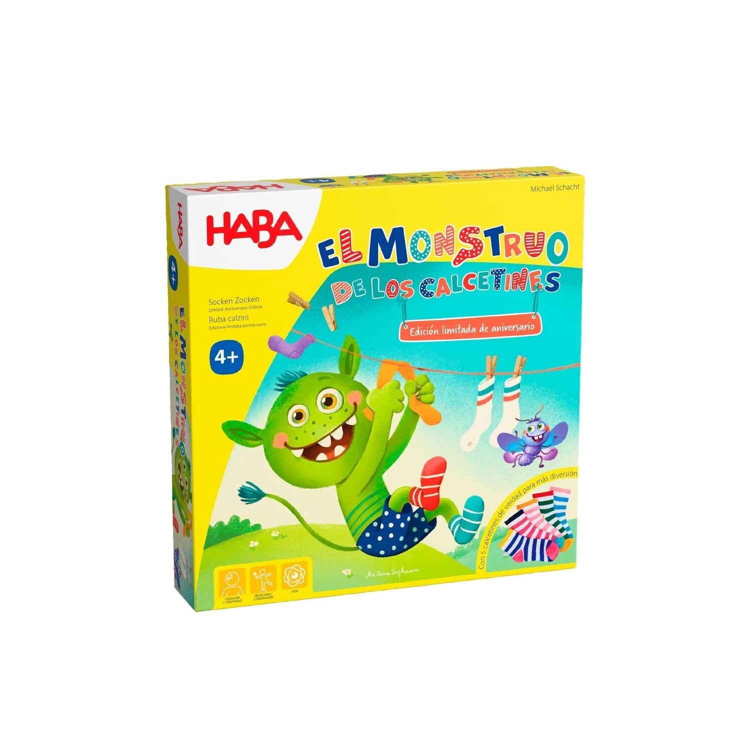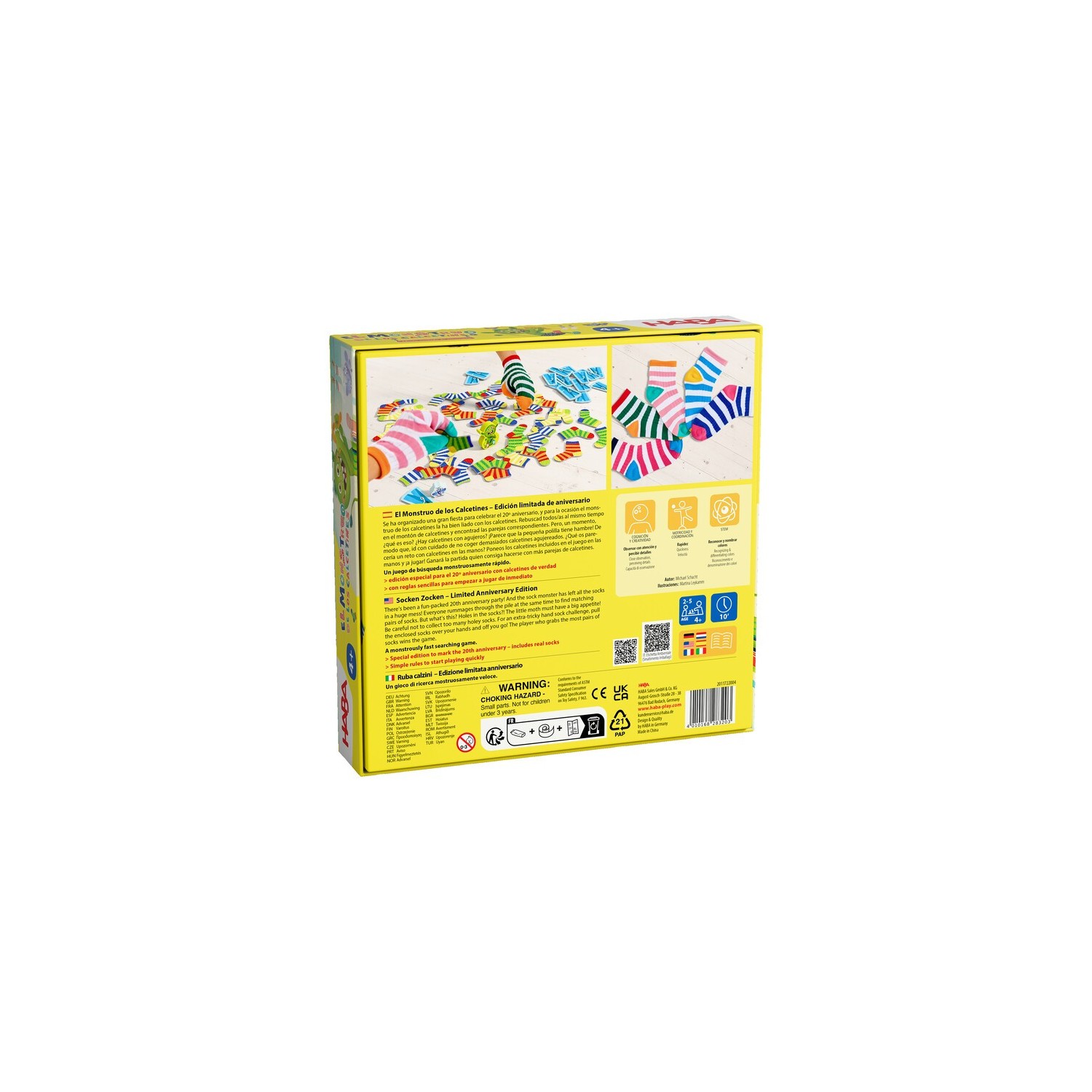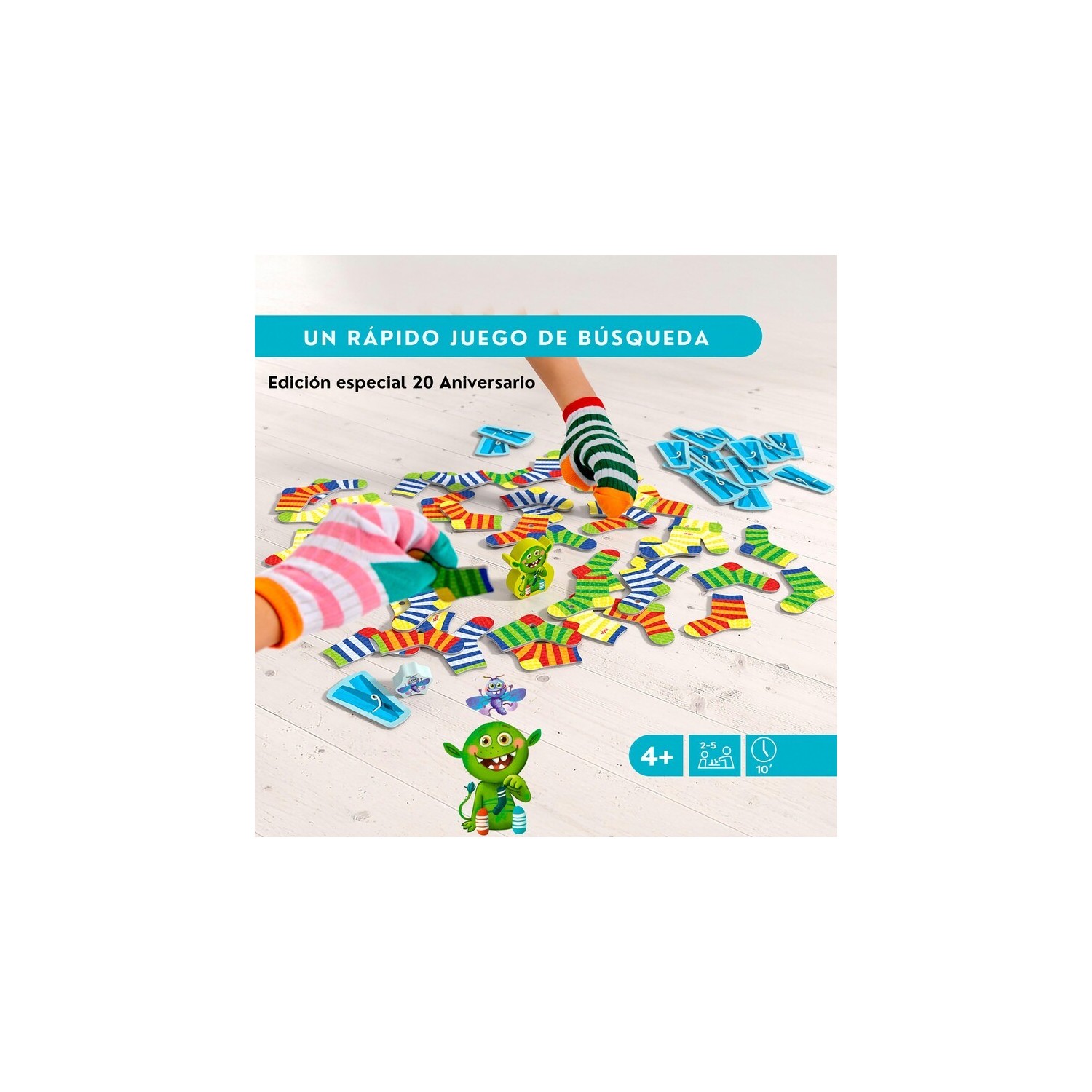 El Monstruo de los calcetines está de celebración. Lleva 20 años ya con nosotros y eso se merece celebrarlo por todo lo alto. Esta versión incluye calcetines de verdad para ponertelos en la mano, así como una polilla juguetona que enreda las cosas. Todos los jugadores jugan al mismo tiempo buscando parejas de calcetines.