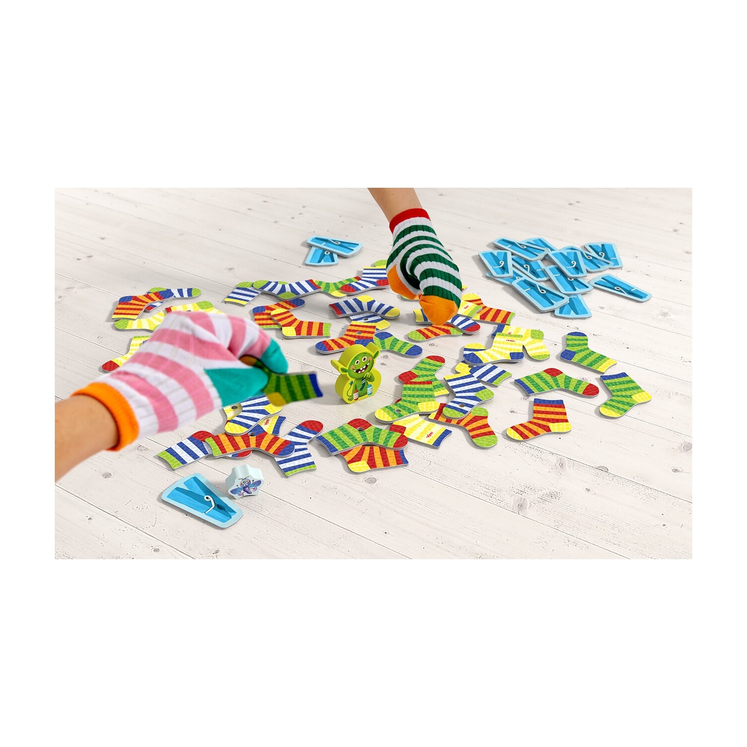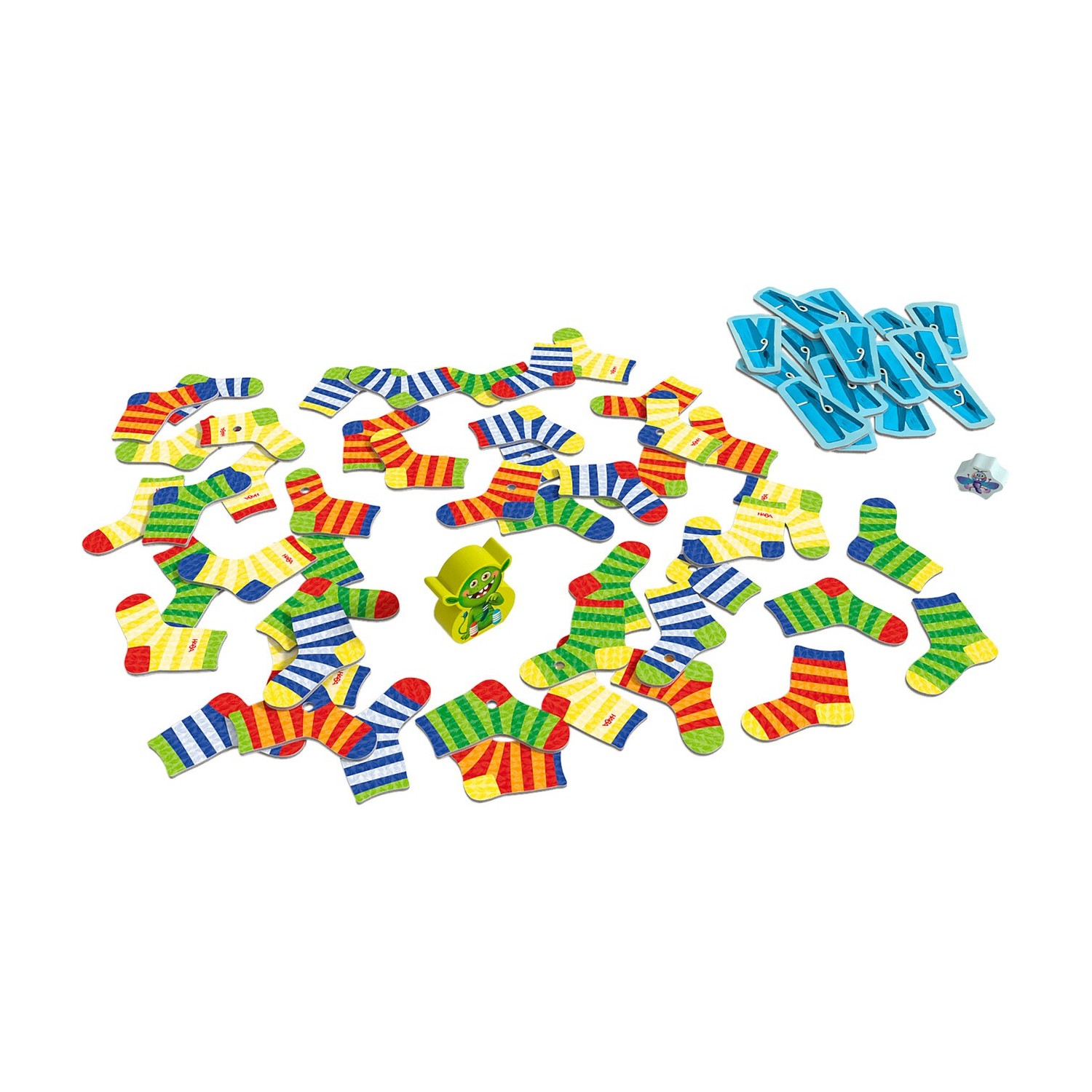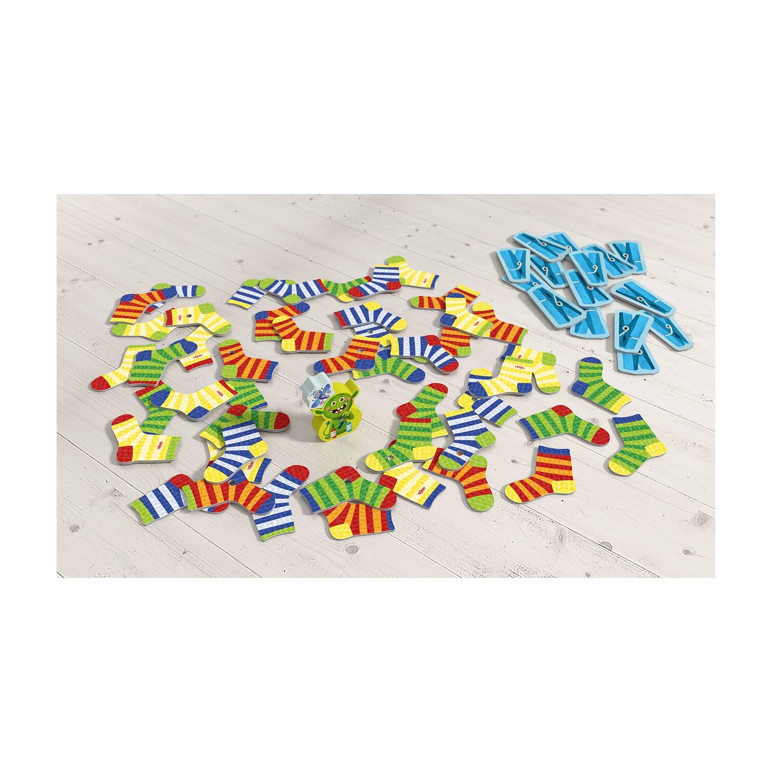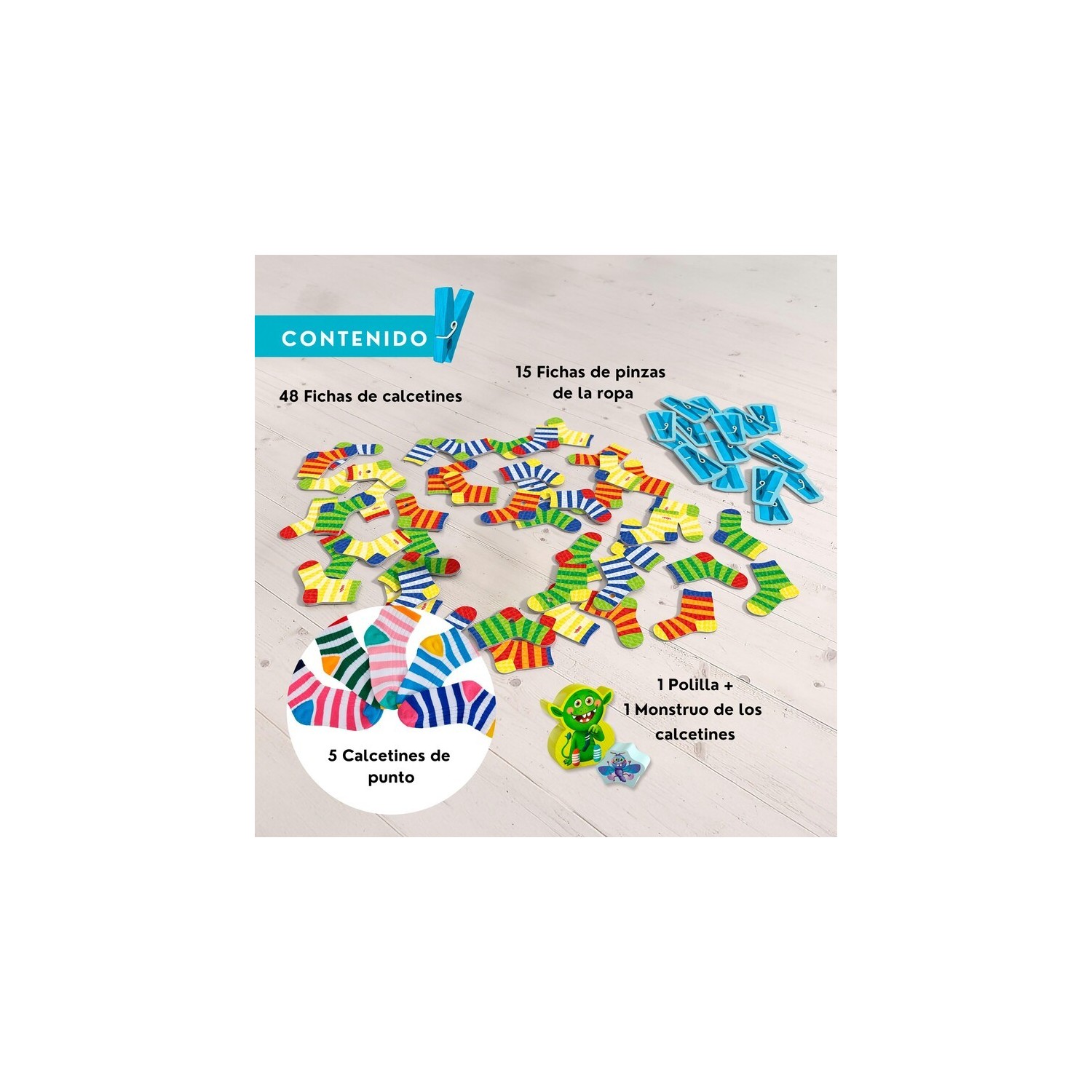 CONTENIDO: 5 calcetines, 1 figura de monstruo de los calcetines de madera, 1 figura de polilla de madera, 15 fichas de pinzas de la ropa, 48 fichas de calcetines (24 parejas), 1 instrucciones del juego