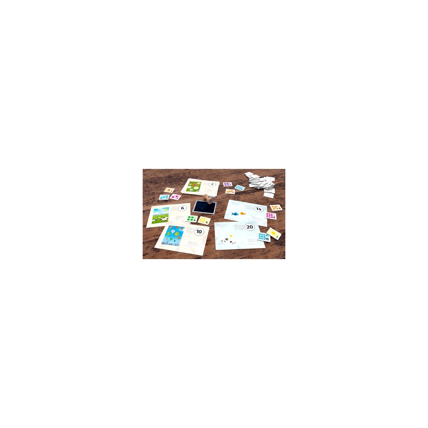 Juego de cálculo del 1 al 20 con dos niveles de dificultad en el que debemos franquear cartas o postales con al menos dos sellos propios que sumen el valor del franqueo. Gana quien consigue franquear más cartas o postales. Incluye matasellos de madera.