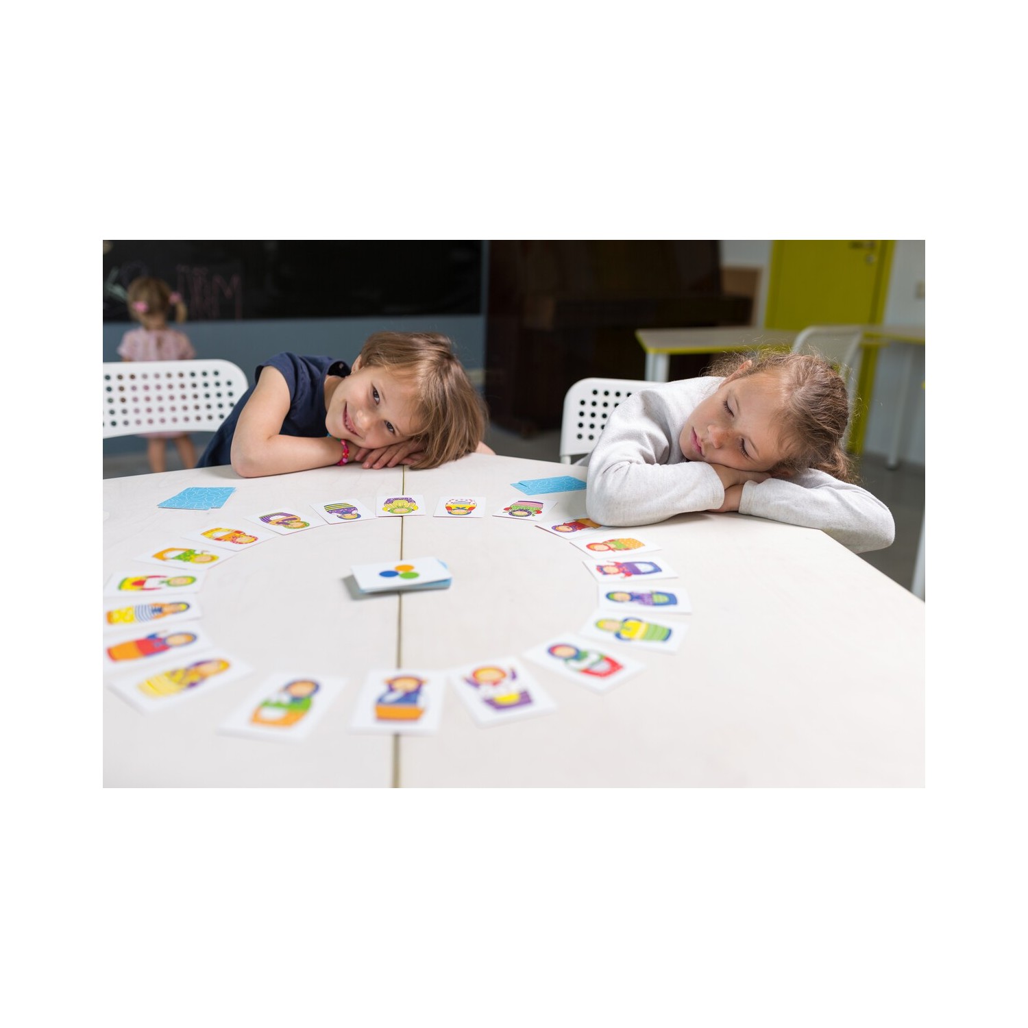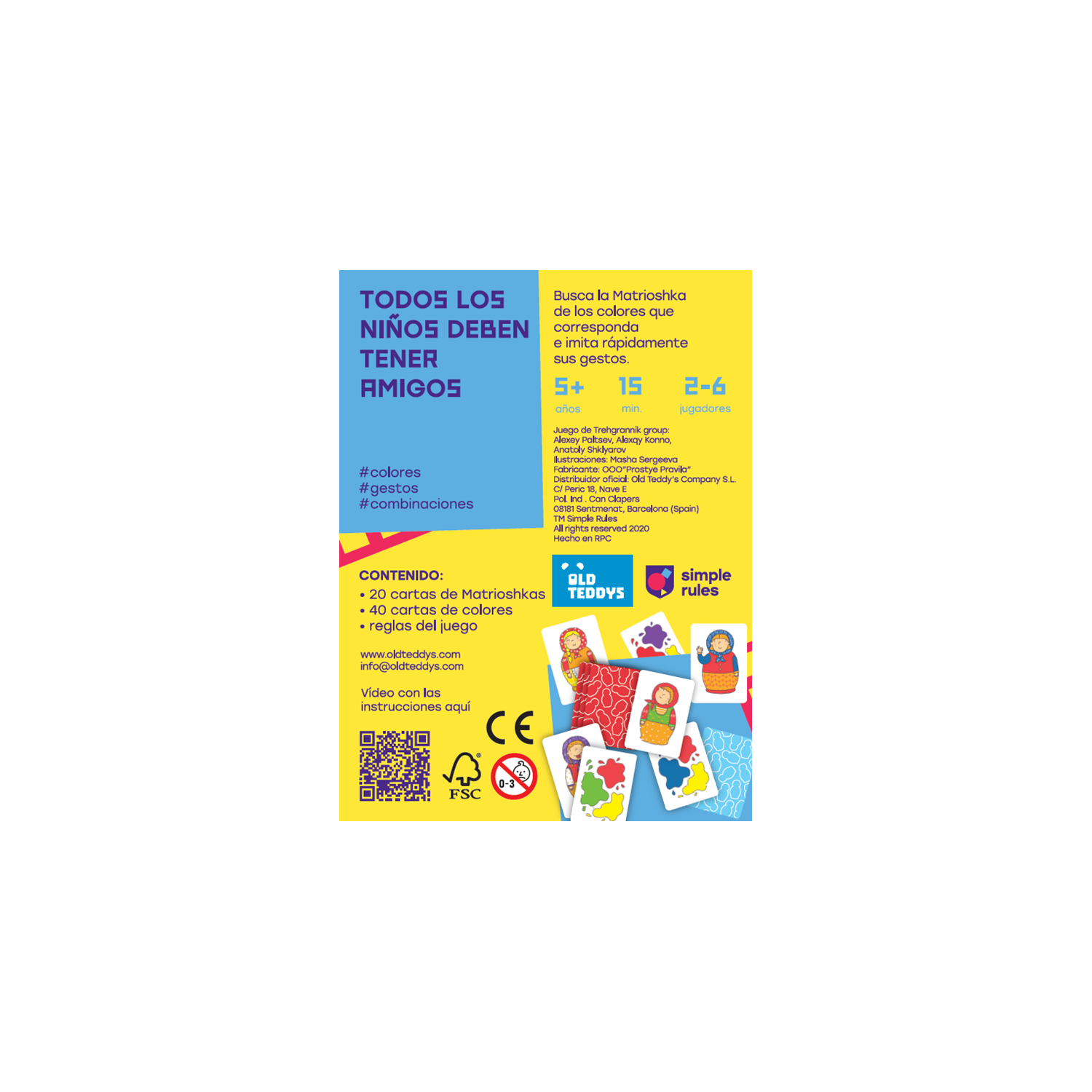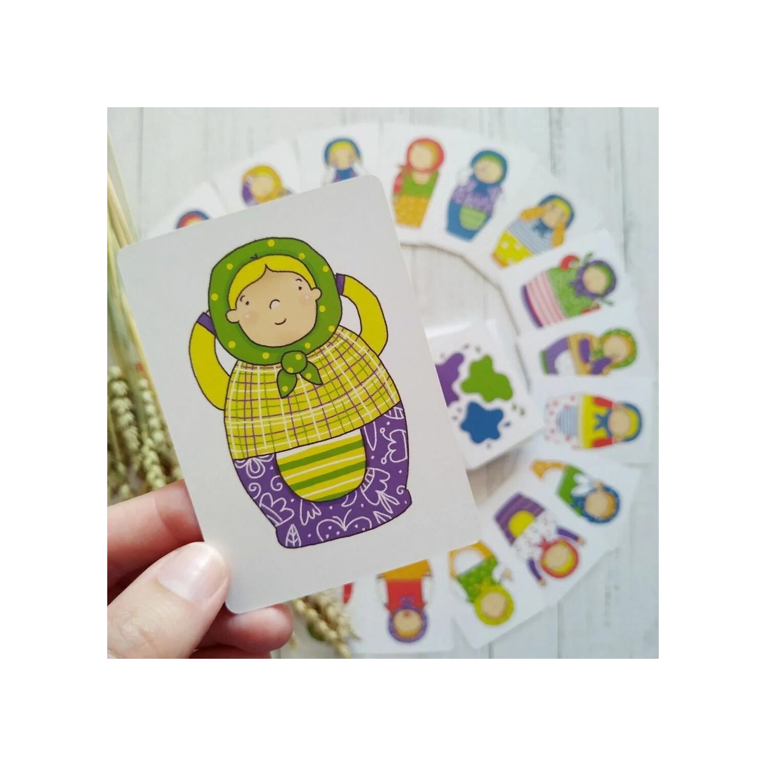 Que muñecas matrioshkas más bonitas y coloridas! Además ninguna de ellas es igual a otra, y todas hacen movimientos diferentes! Se colocan todas las cartas de matrioshkas boca arriba en el centro de la mesa y las cartas colores, se colocan formando una pila boca abajo. En cuanto se gire una carta, los jugadores/as deben de ser los más rápidos en encontrar una matrioshka que vista con los colores de la carta y reproducir el movimiento que hace. El primero en hacerlo bien, se lleva la carta, y gana quien tenga más cartas al final.