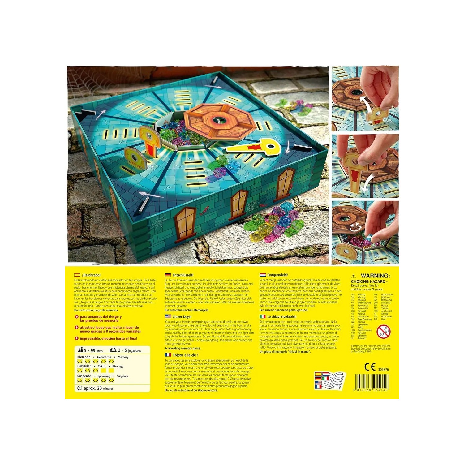 CONTENIDO: para amantes del riesgo y las pruebas de memoria, atractivo juego que invita a jugar de nuevo gracias a 8 “recorridos” variables, imprevisible, emoción hasta el final, un desarrollo atmosférico del juego con bonitas llaves de madera.