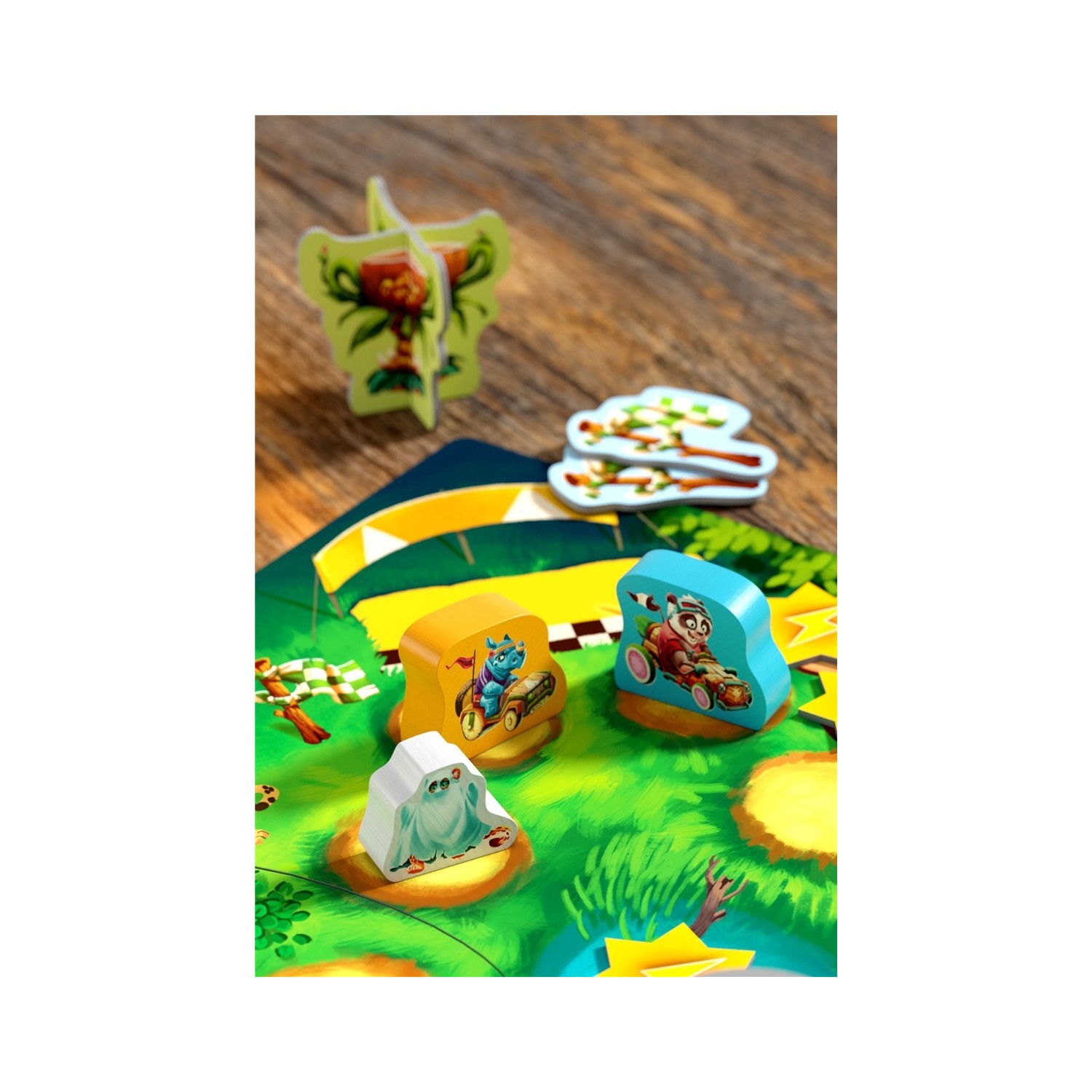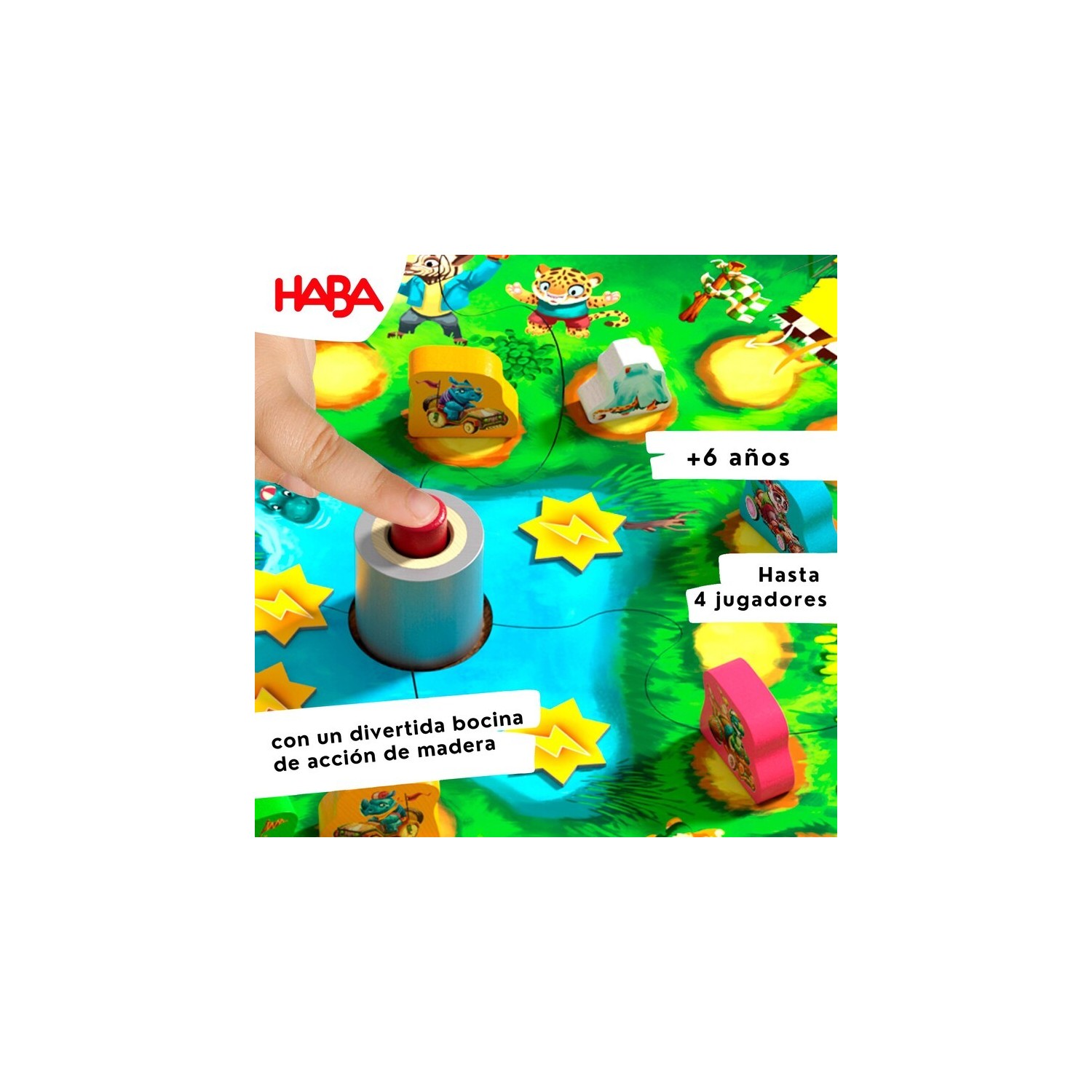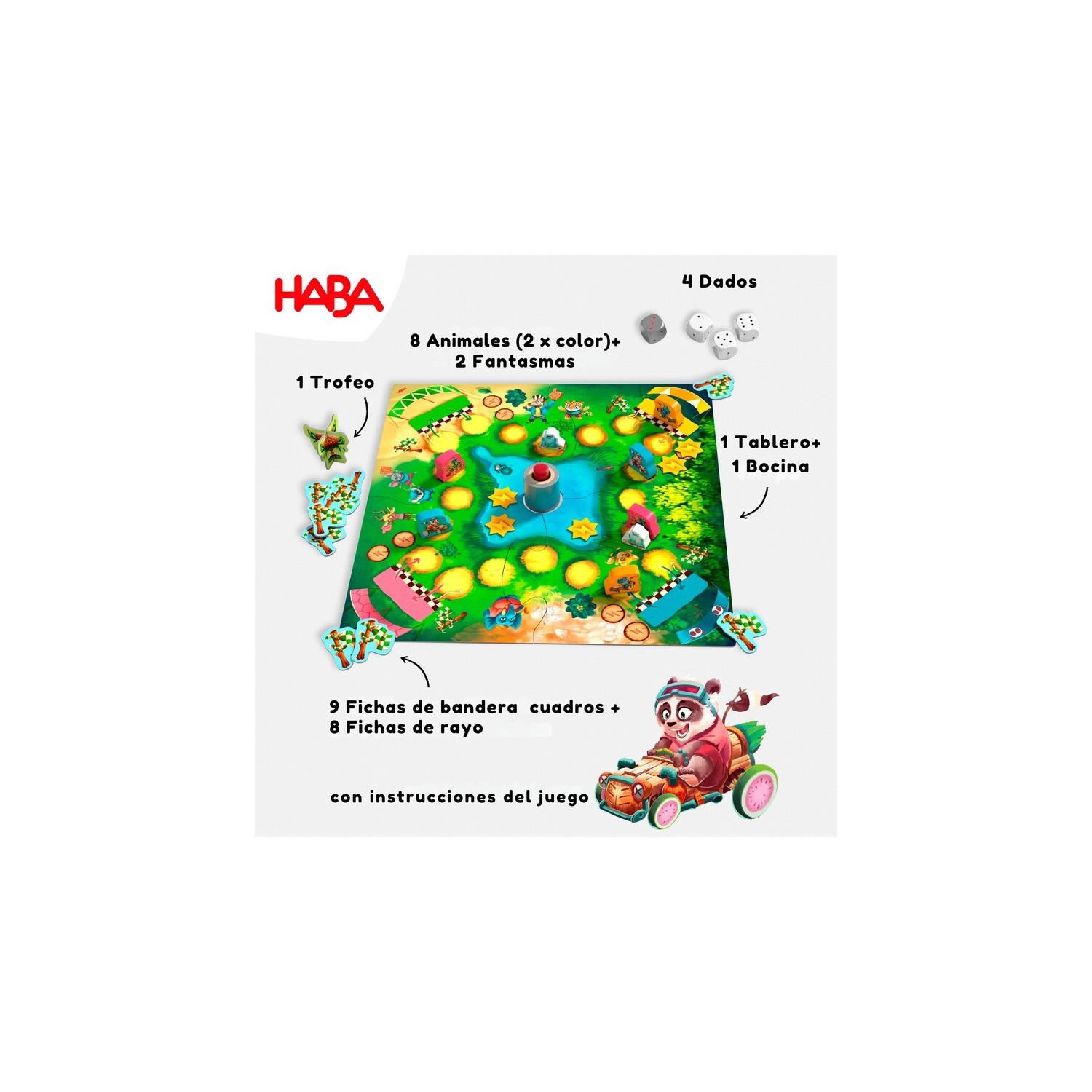 Empieza la carrera de coches locos por al jungla y el corredor/a más rápido en dar 3 vueltas al circuito será el ganador/a. Por turnos se lanzan los 4 dados y en función del resultado se avanzar por el tablero. Si el dado plateado nos indica puntos rojos, deberemos hacer avanzar también el fantasma quien puede hacernos volver al box de salida. Y si somos rápidos/as y astutos/as podremos aprovechar la tirada de un rival tocando la bocina.