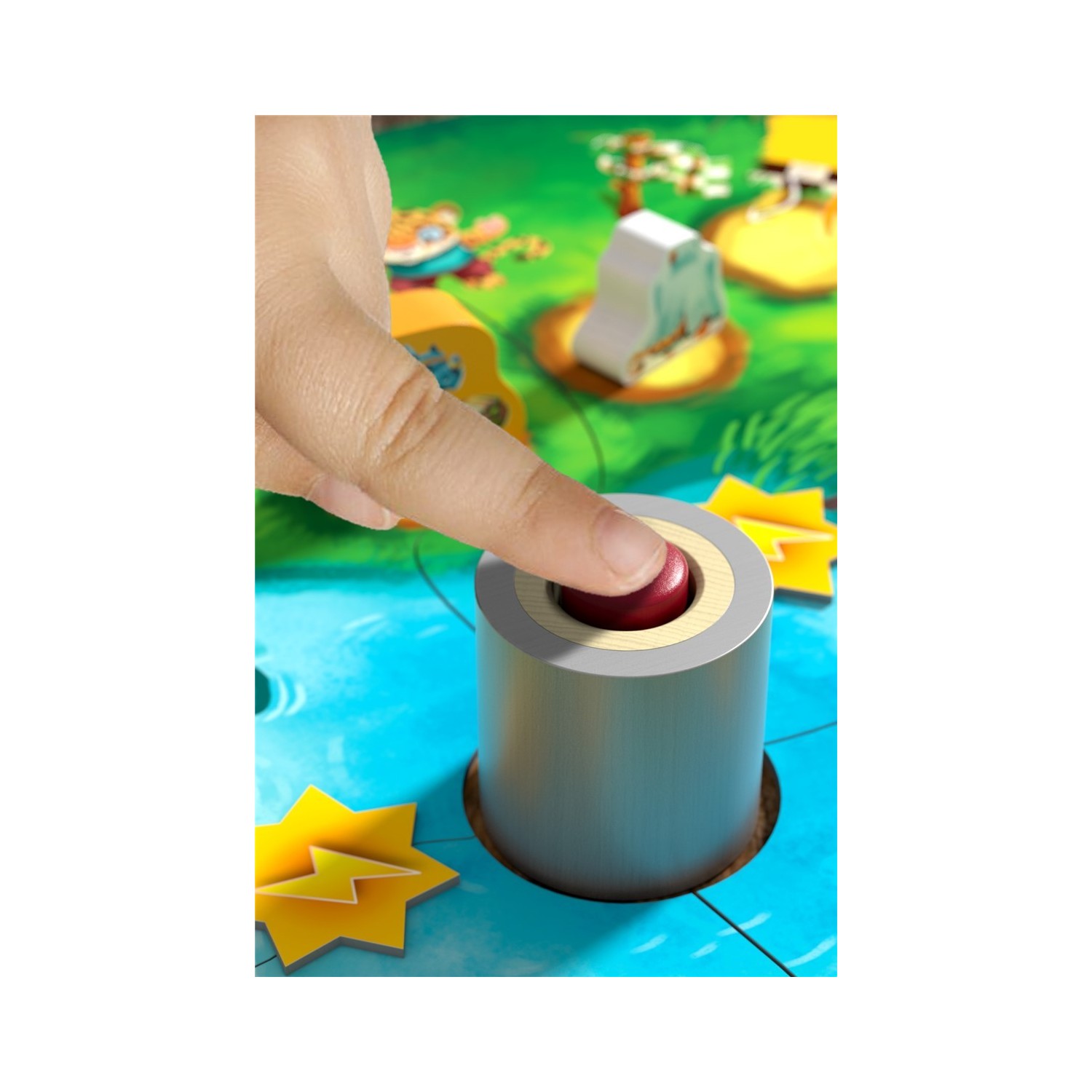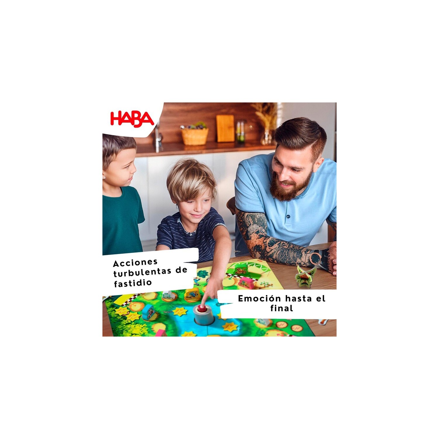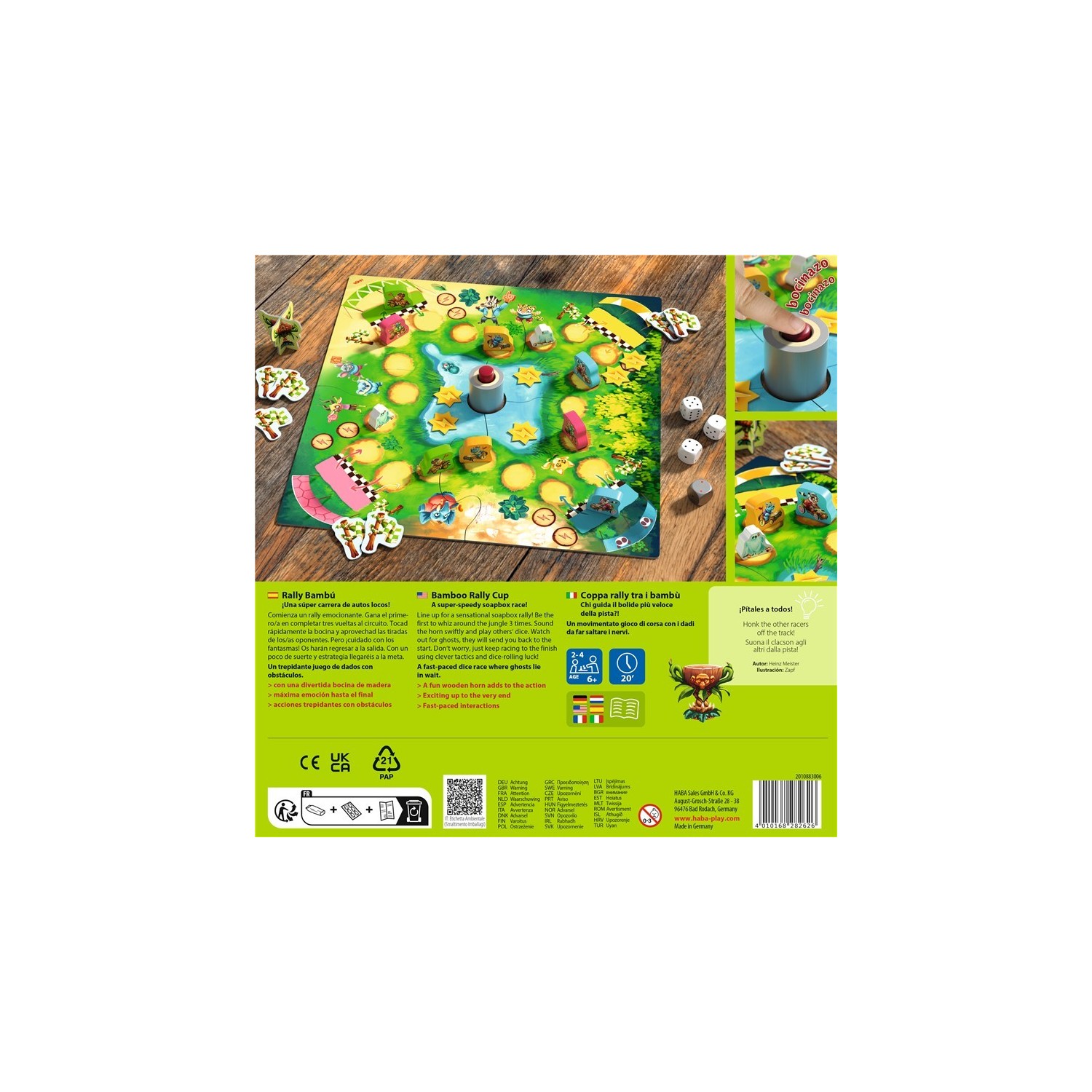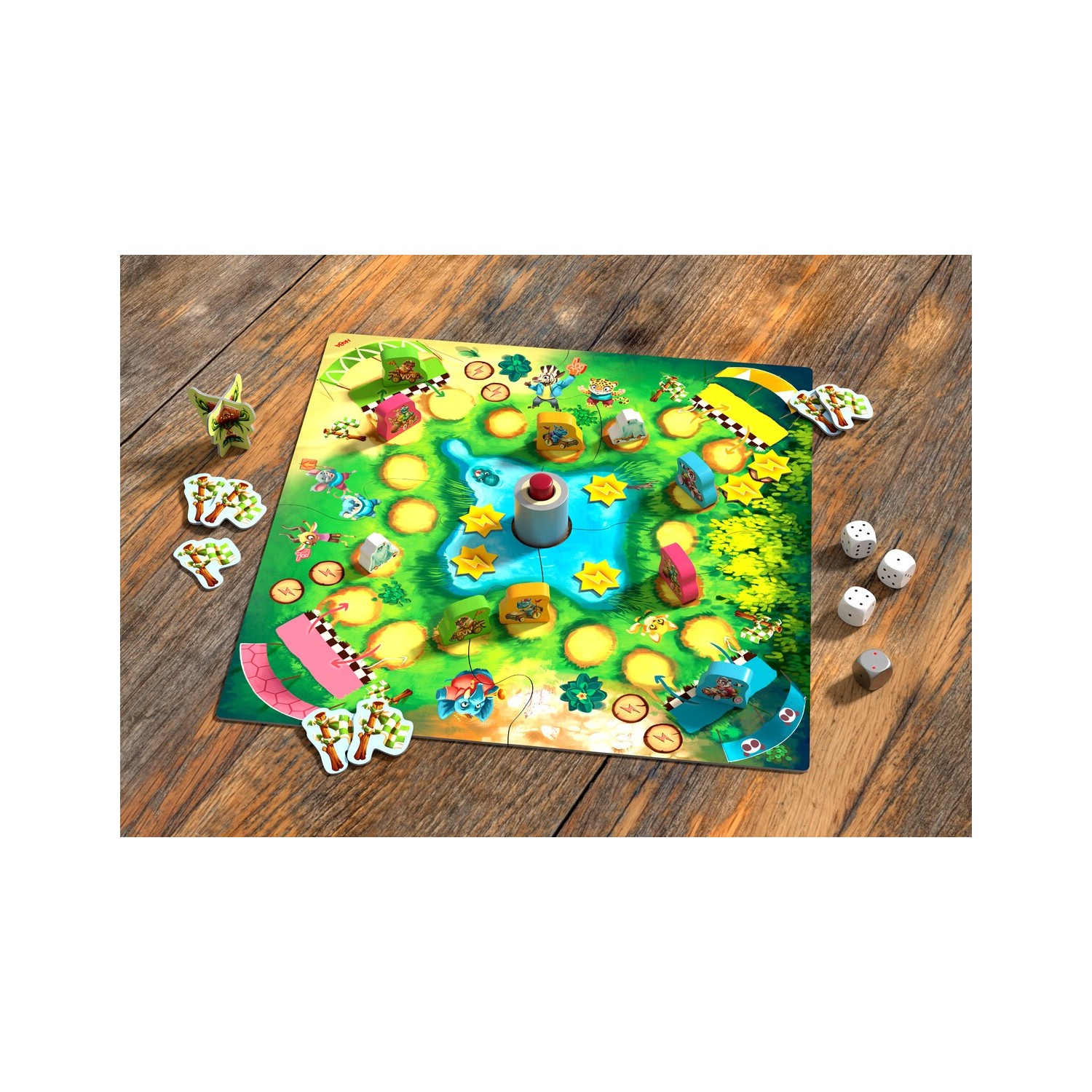 Empieza la carrera de coches locos por al jungla y el corredor/a más rápido en dar 3 vueltas al circuito será el ganador/a. Por turnos se lanzan los 4 dados y en función del resultado se avanzar por el tablero. Si el dado plateado nos indica puntos rojos, deberemos hacer avanzar también el fantasma quien puede hacernos volver al box de salida. Y si somos rápidos/as y astutos/as podremos aprovechar la tirada de un rival tocando la bocina.