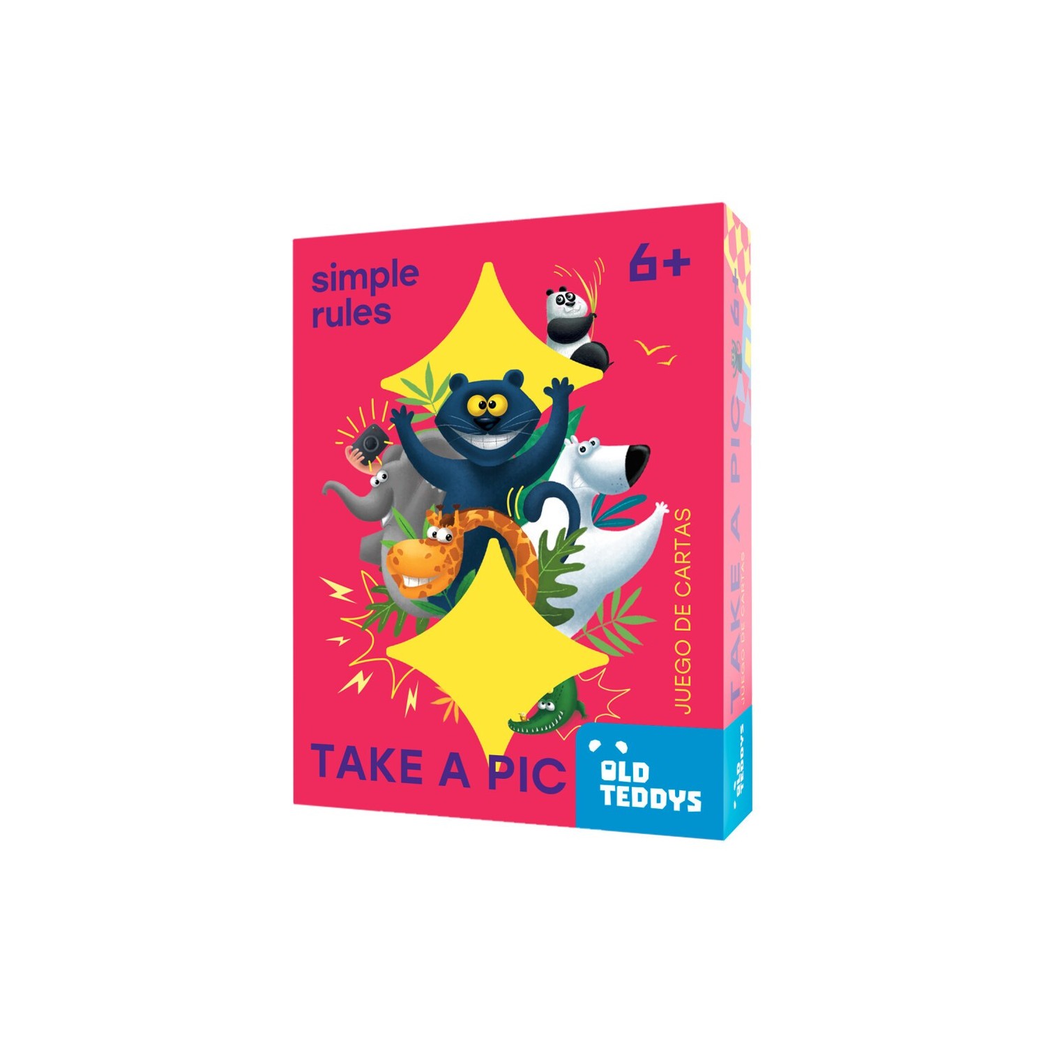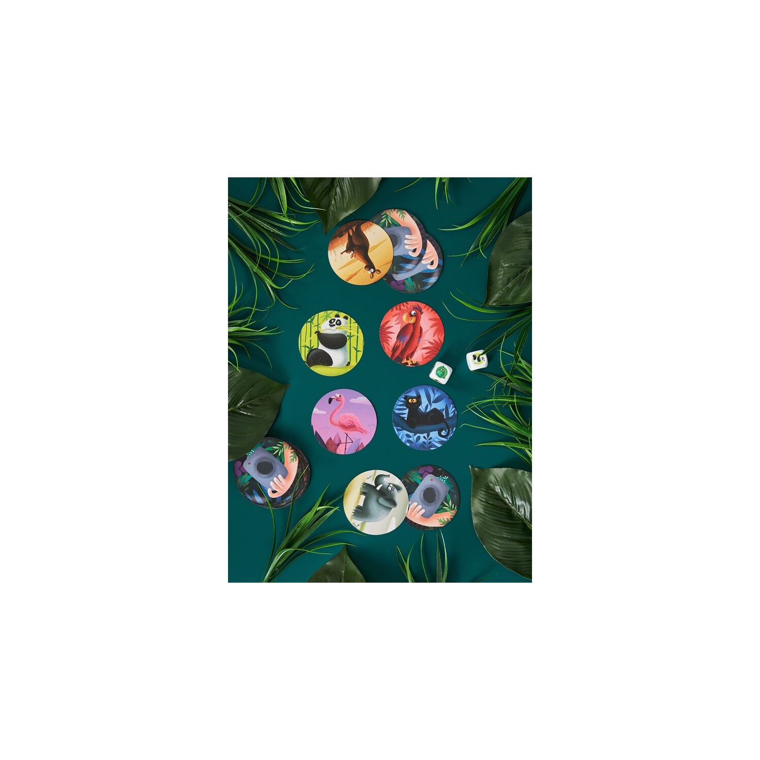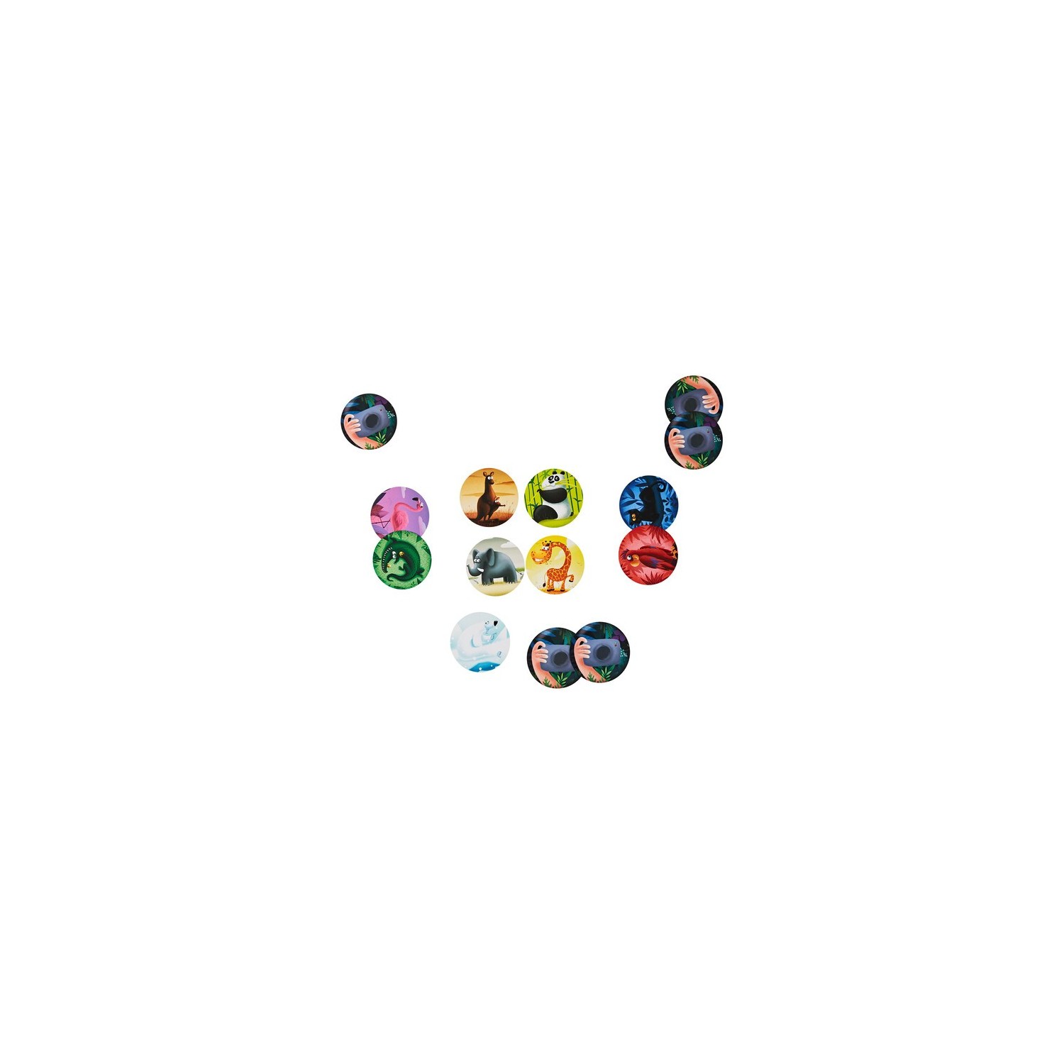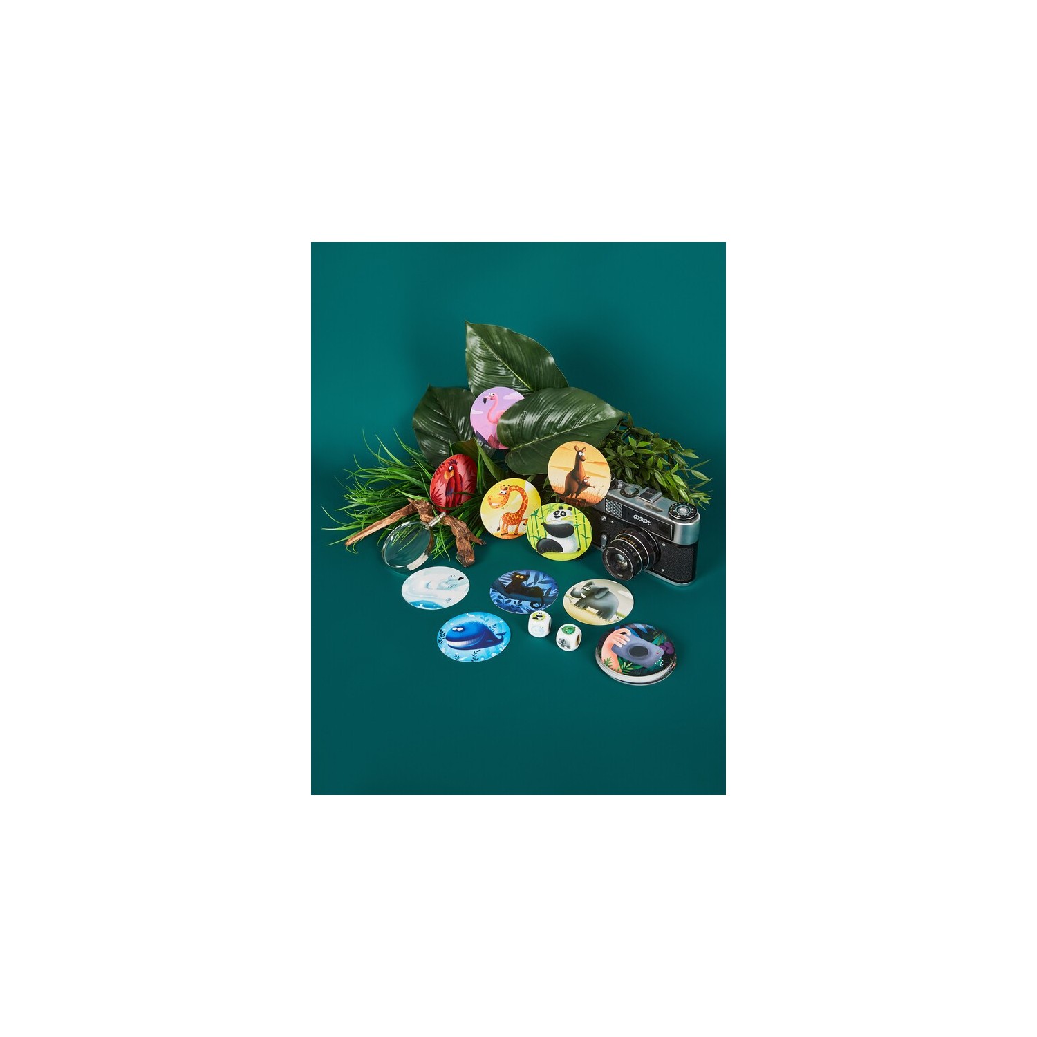 ¡Nos vamos de safari fotográfico, así que mantén los ojos bien abiertos y prepara la cámara! Por turnos, los jugadores tiran los dados y todos a la vez deben ser los primeros en localizar el animal/es de los dados entre los del centro de la mesa o los que tienen los jugadores delante suyo. El más rápido se lleva las cartas y gana quien tenga más al final de la partida. Este juego competitivo de ritmo rápido, con 2 variantes de juego de distinta dificultad, es perfecto para fiestas infantiles, encuentros familiares o escuelas.