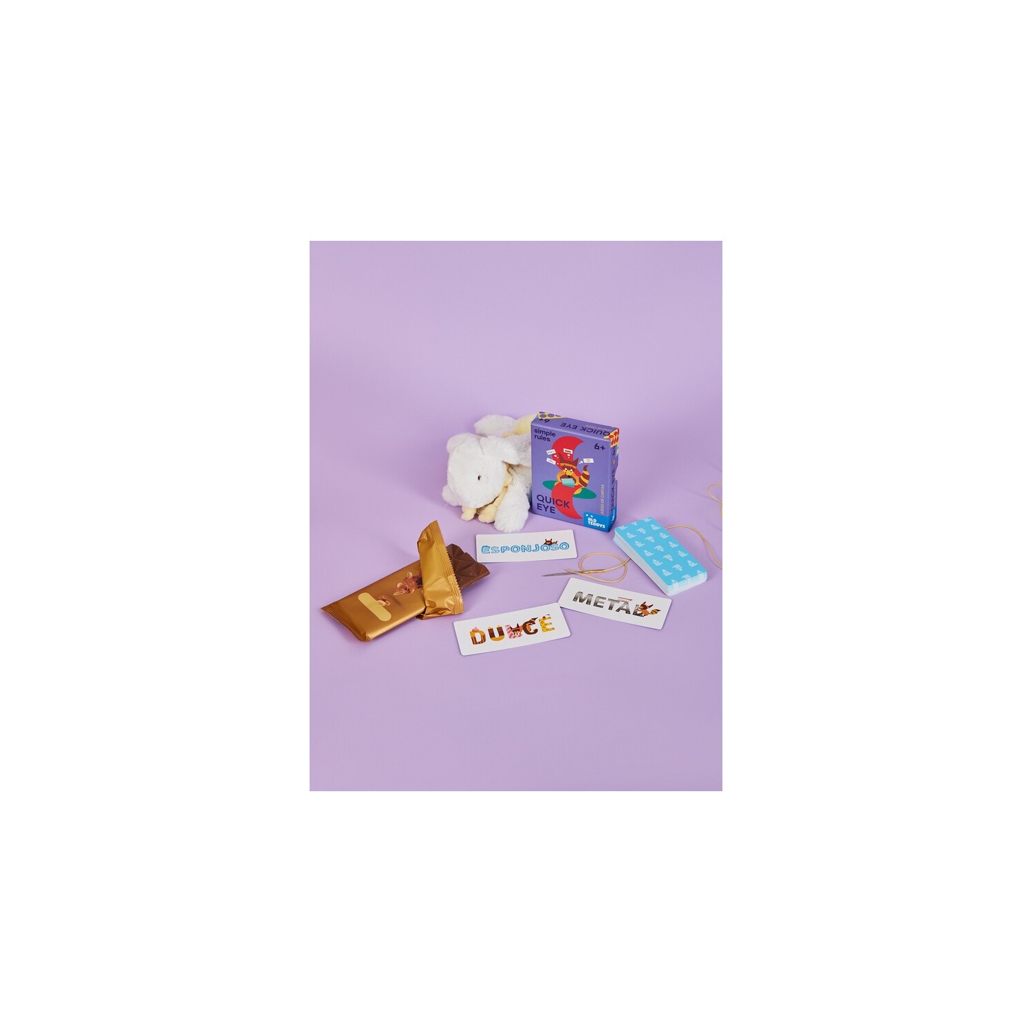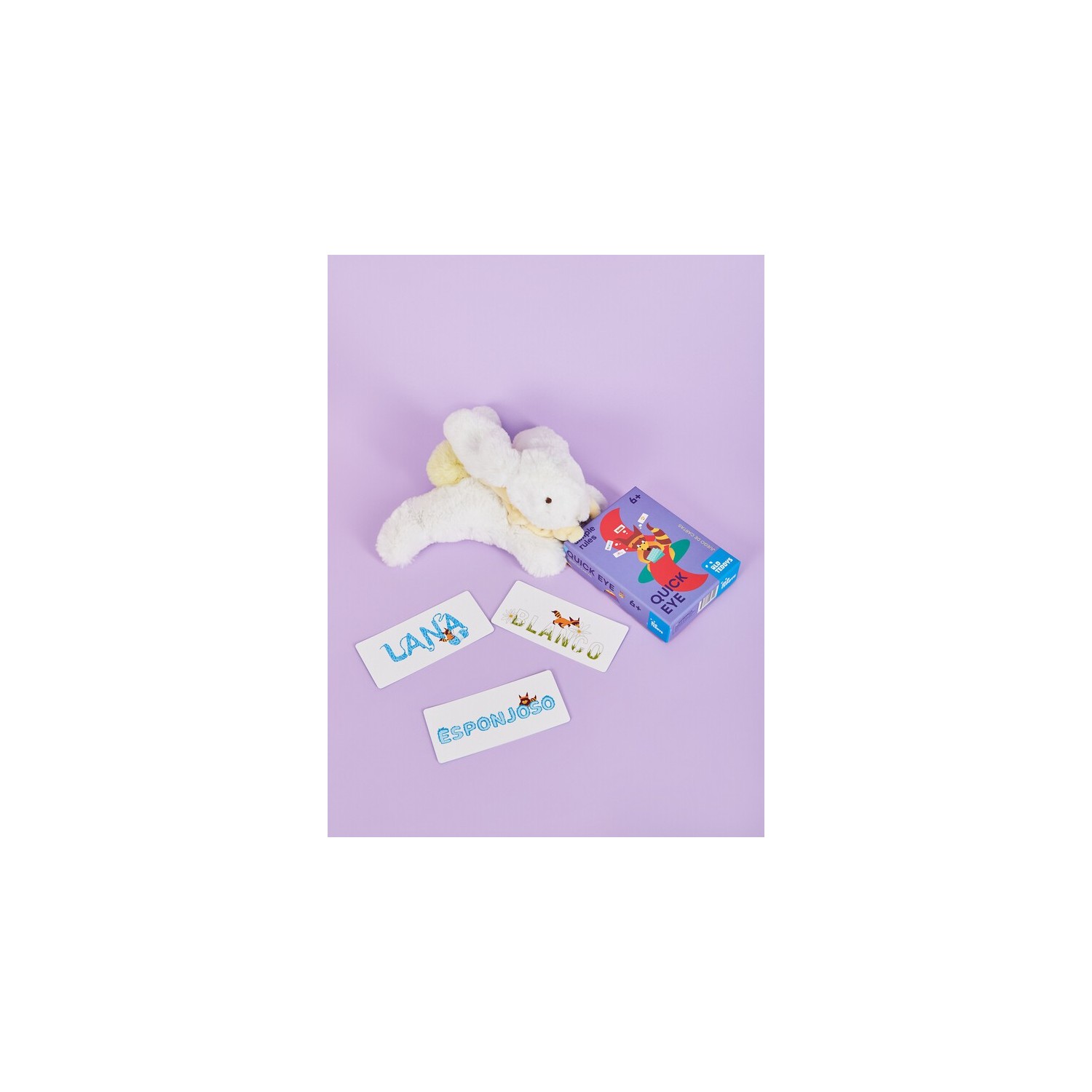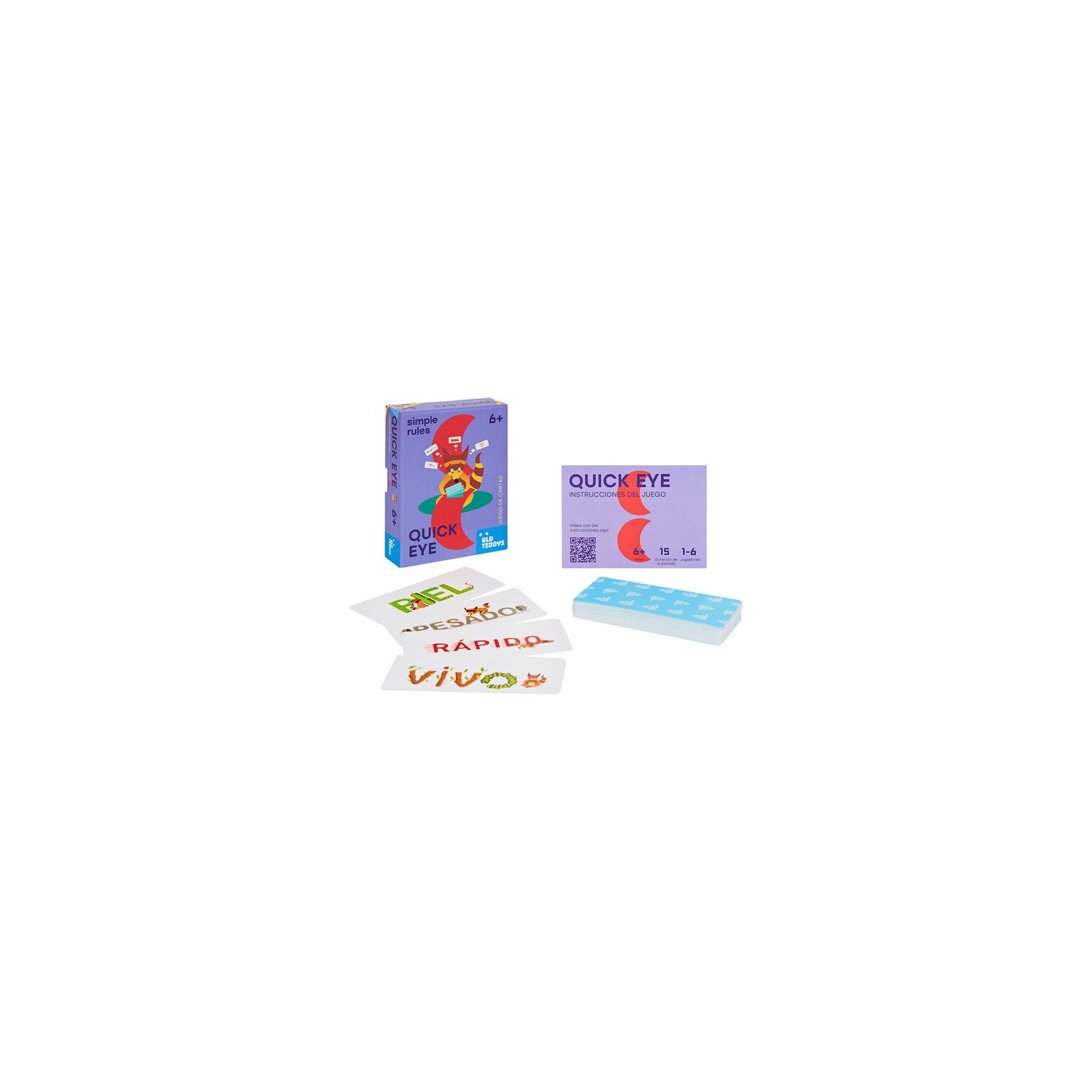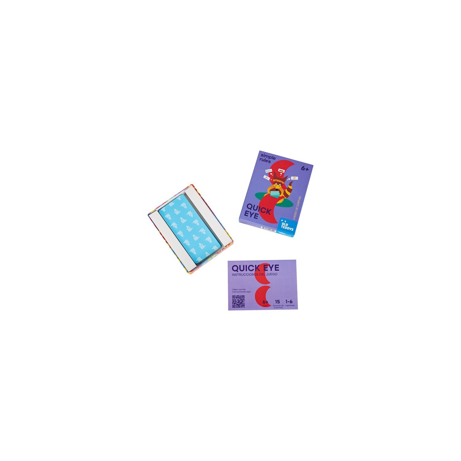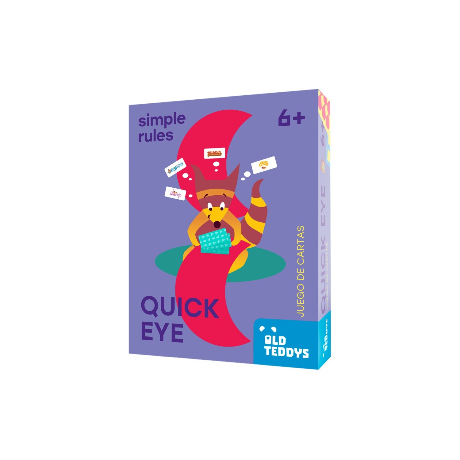 Quick Eye requiere mucha imaginación y capacidad de observación del entorno que te rodea, para conseguir la mayor cantidad de cartas y ganar la partida. Por turnos, los jugadores/as descubren una carta de la pila, la leen y piensan en algo que tenga la cualidad indicada. Si lo encuentran, en el siguiente turno podrán descubrir una segunda carta y buscar algo que tenga ambas cualidades. Así sucesivamente, de modo que el juego se vuelve progresivamente más desafiante y divertido con cada nueva carta que se gira. Los jugadores/as pueden decidir plantarse para conseguir cartas o arriesgarse siguiendo, destapando cartas. Gana quien tenga más cartas. El juego permite dos variantes de juego.