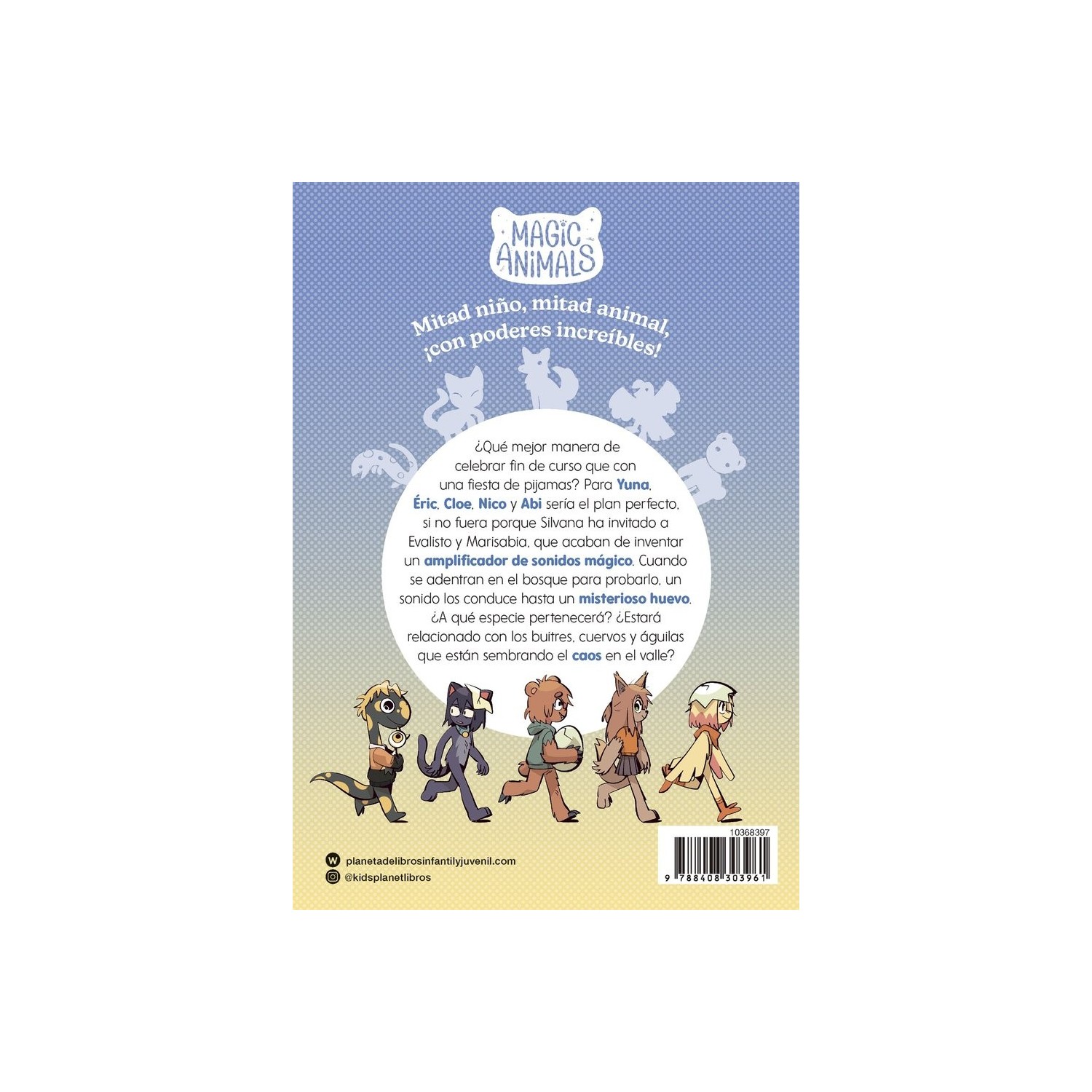 ¿Qué mejor manera de celebrar el final de las clases que haciendo una fiesta de pijamas en la cabaña del árbol? Para Yuna, Éric, Cloe, Nico y Abi sería el plan perfecto, si no fuera porque han invitado a Evalisto y Marisabia, que acaban de inventar un amplificador de sonidos mágico. Cuando se adentran en el bosque para probarlo, un sonido extraño los conduce hasta el hueco de un árbol. Allí los Magic Animals encontrarán un misterioso huevo. ¿A qué especie pertenecerá? ¿Está relacionado con los buitres, cuervos y águilas que están sembrando el caos en el valle de Blim?