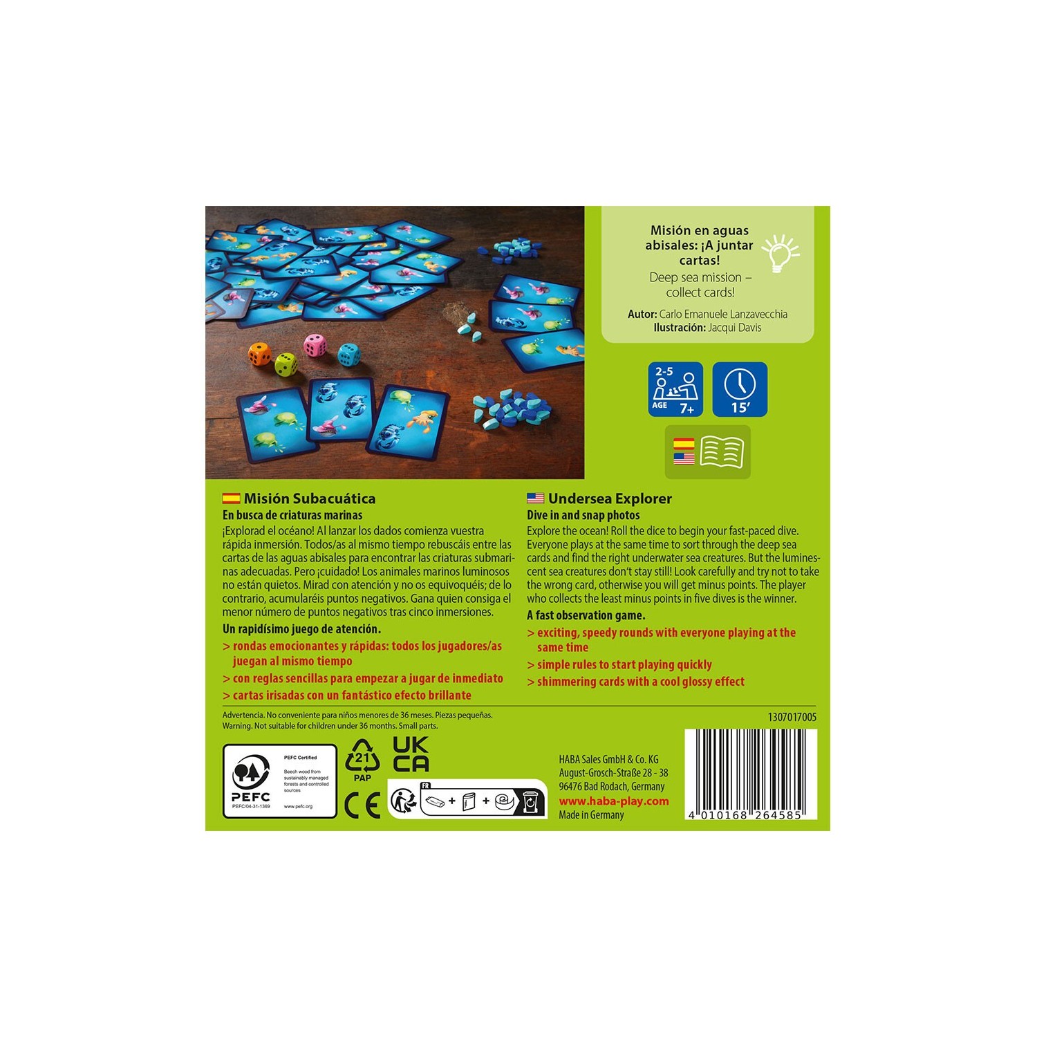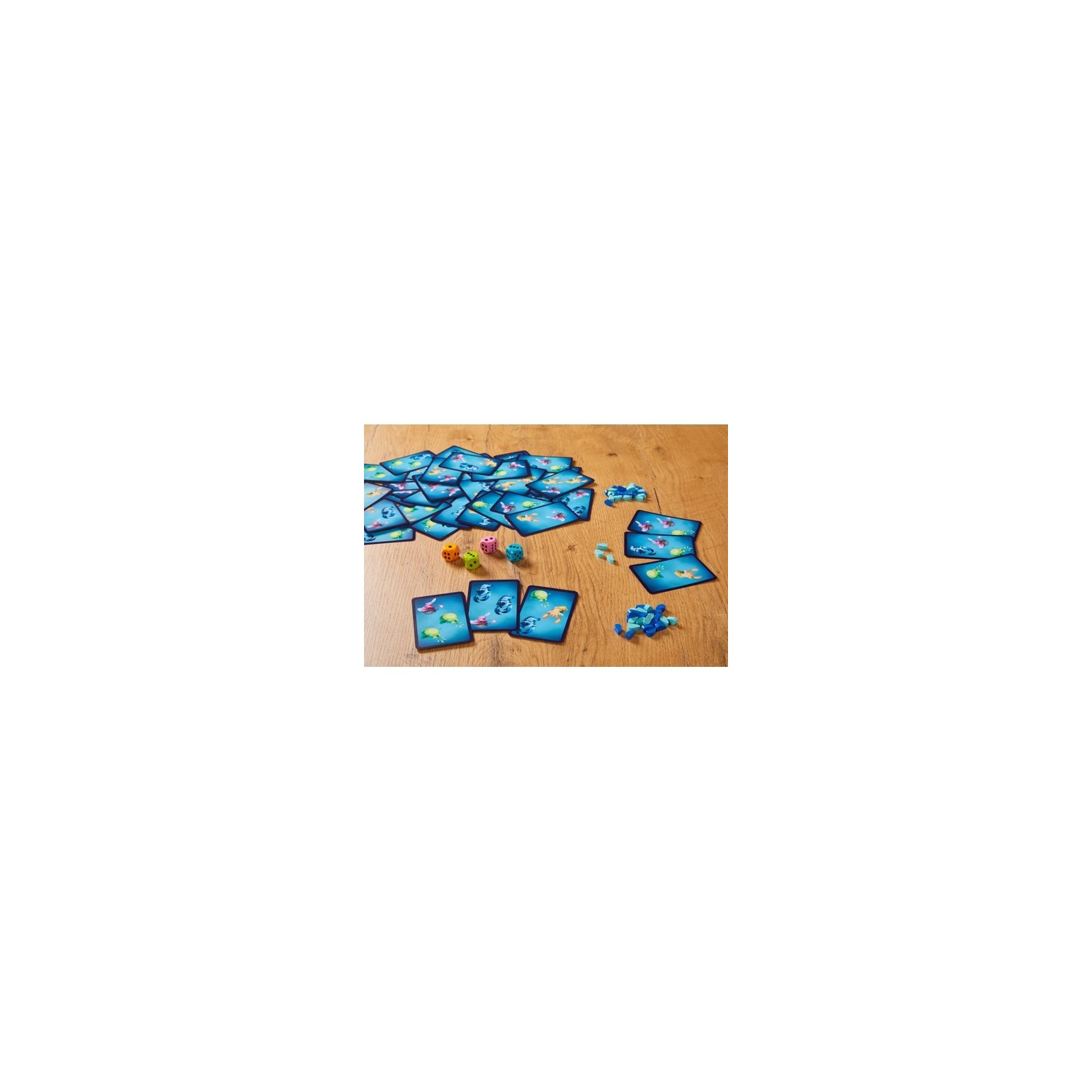 Juego de observación y cálculo en el que los jugadores/as a la vez deberán coger cartas de la pila con el objetivo de reunión el número de criaturas submarinas indicadas en los dados. Gana quien logre acumular menos puntos negativos al final de 5 rondas. Permite variante de juego de memoria.