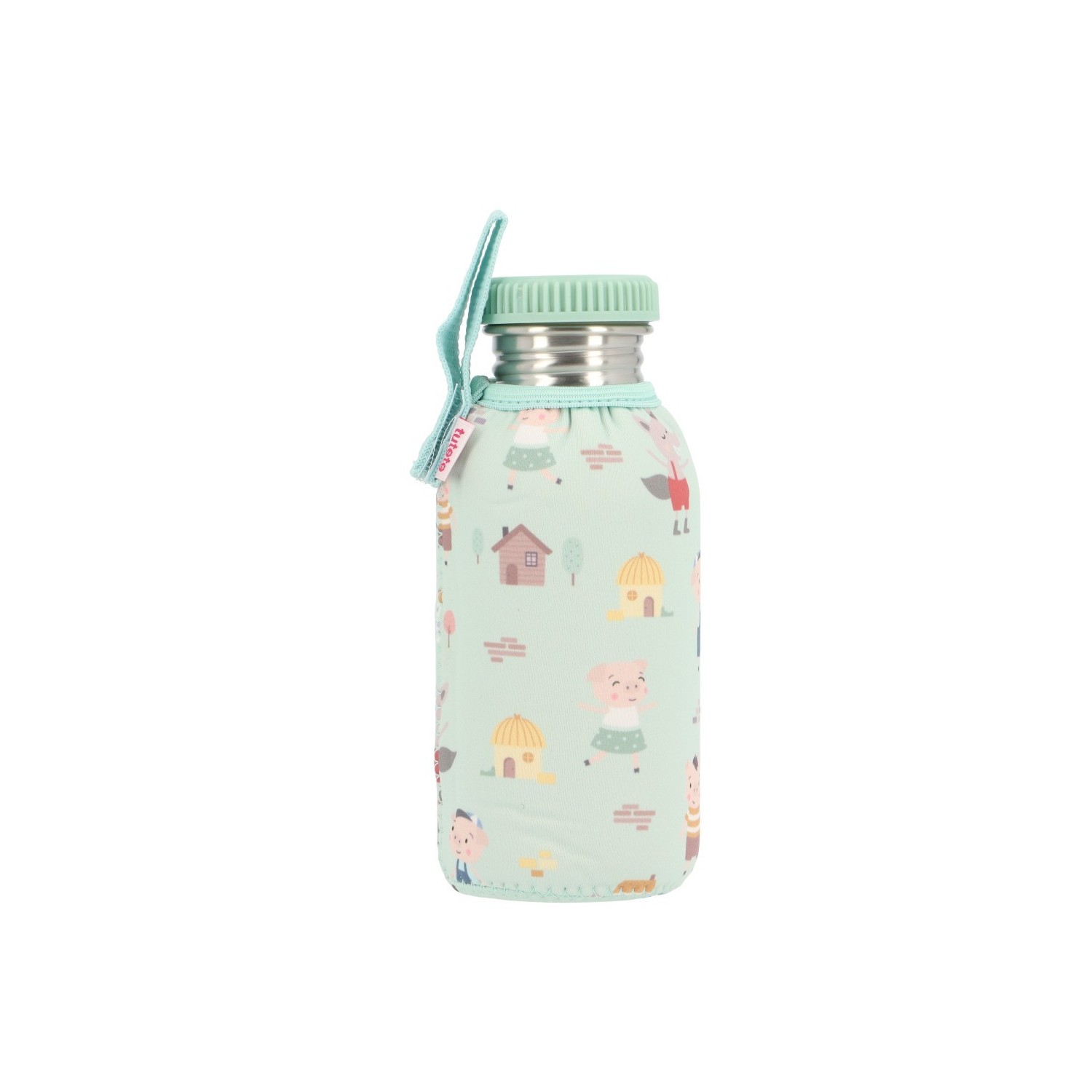 La botella con funda de neopreno es perfecta para llevar al colegio, la guardería o de paseo. Está diseñada para mantener el agua fresca durante más tiempo y evitar los sabores indeseados que pueden transmitir los plásticos.
